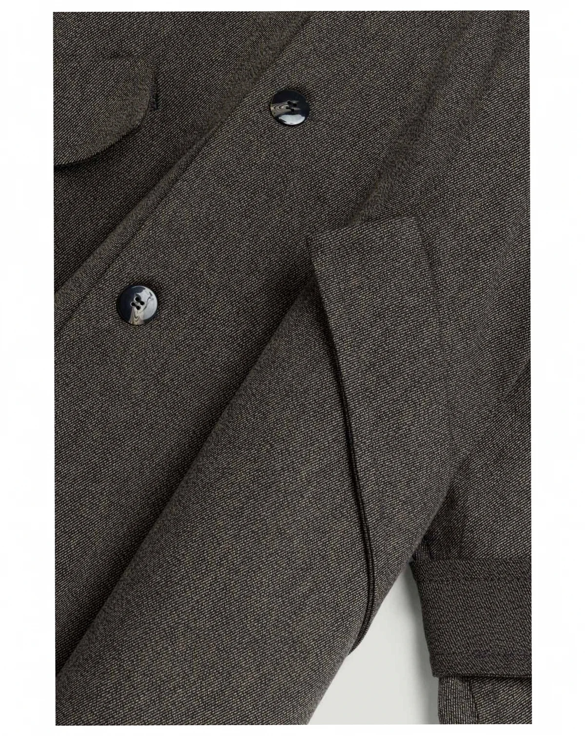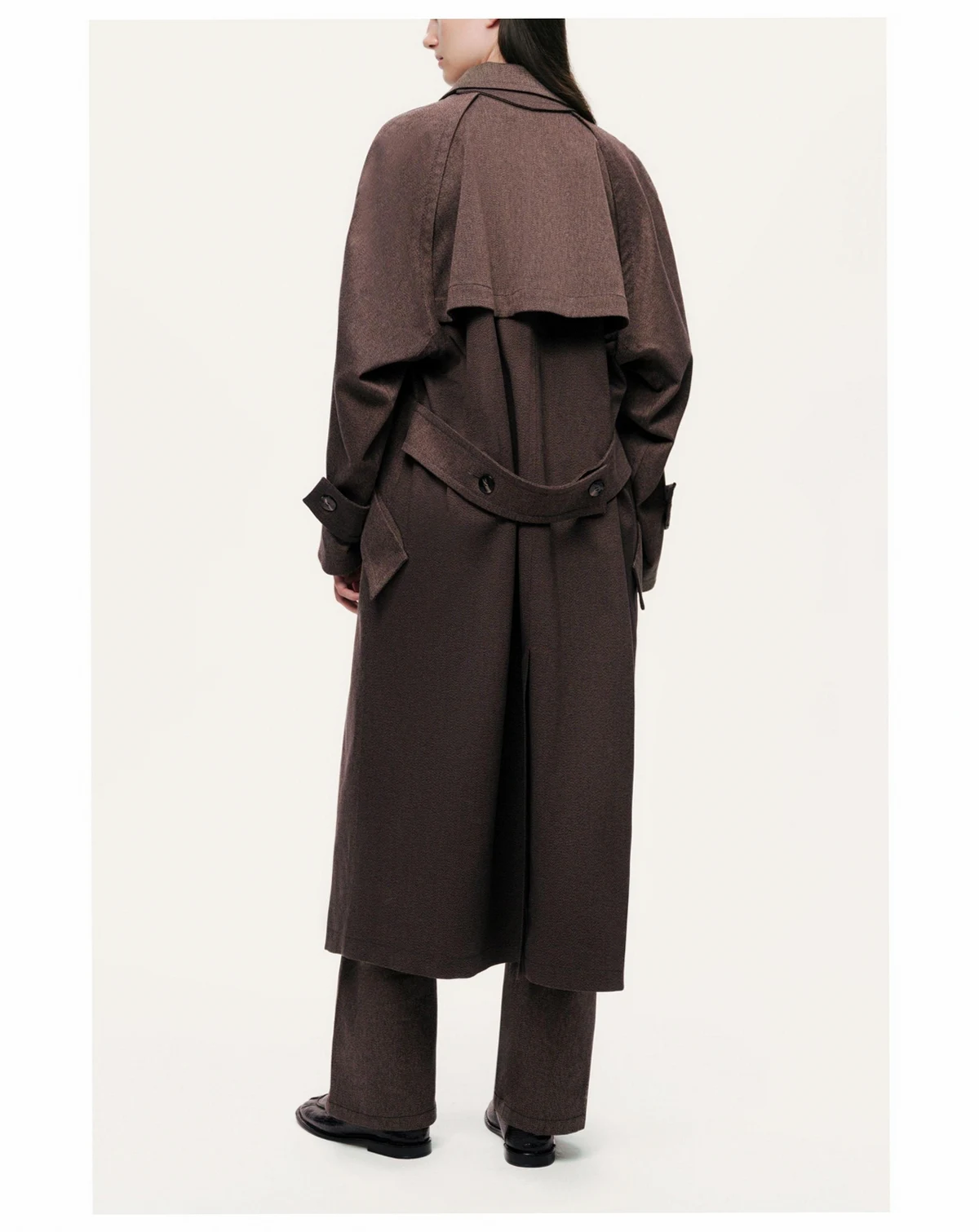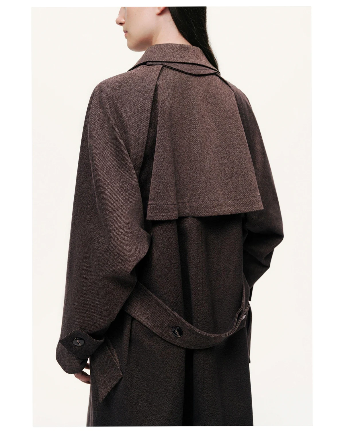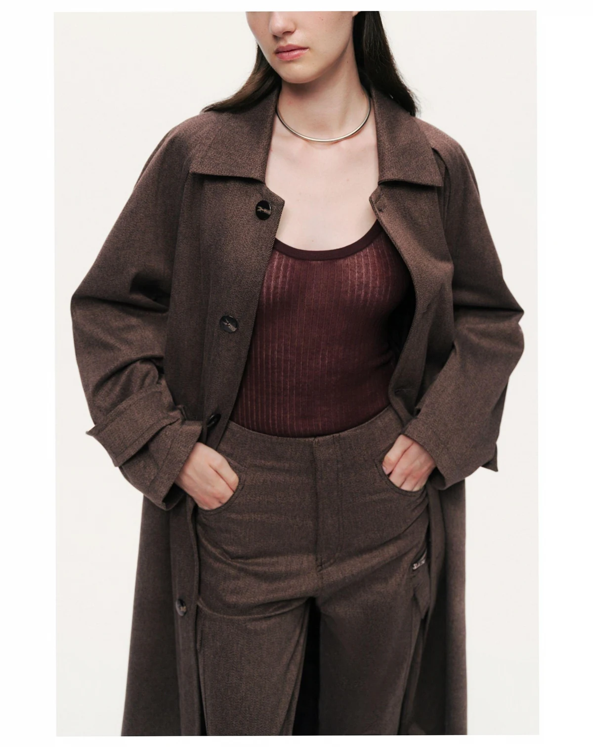 The pointed collar and clean button front highlight its classic appeal, complemented by a functional back storm flap for subtle structure. Button-tab cuffs and a back half-belt add tailored detailing, while side pockets bring everyday practicality.; Dry clean