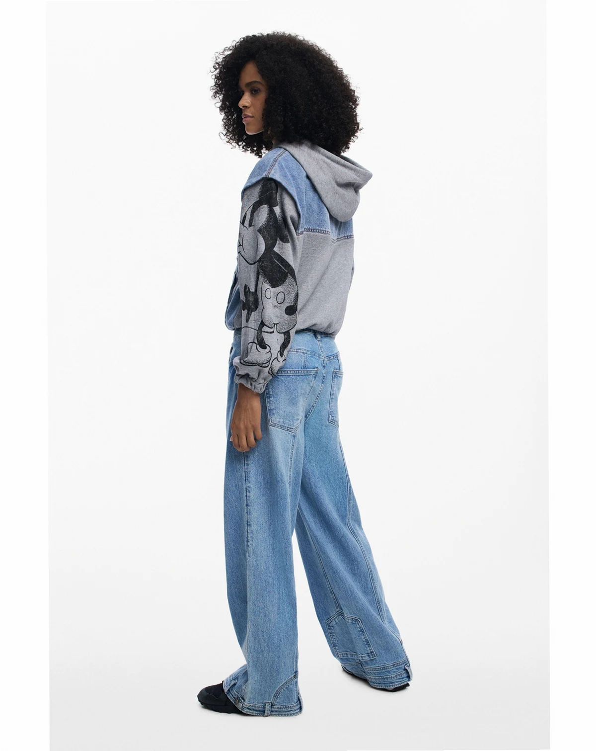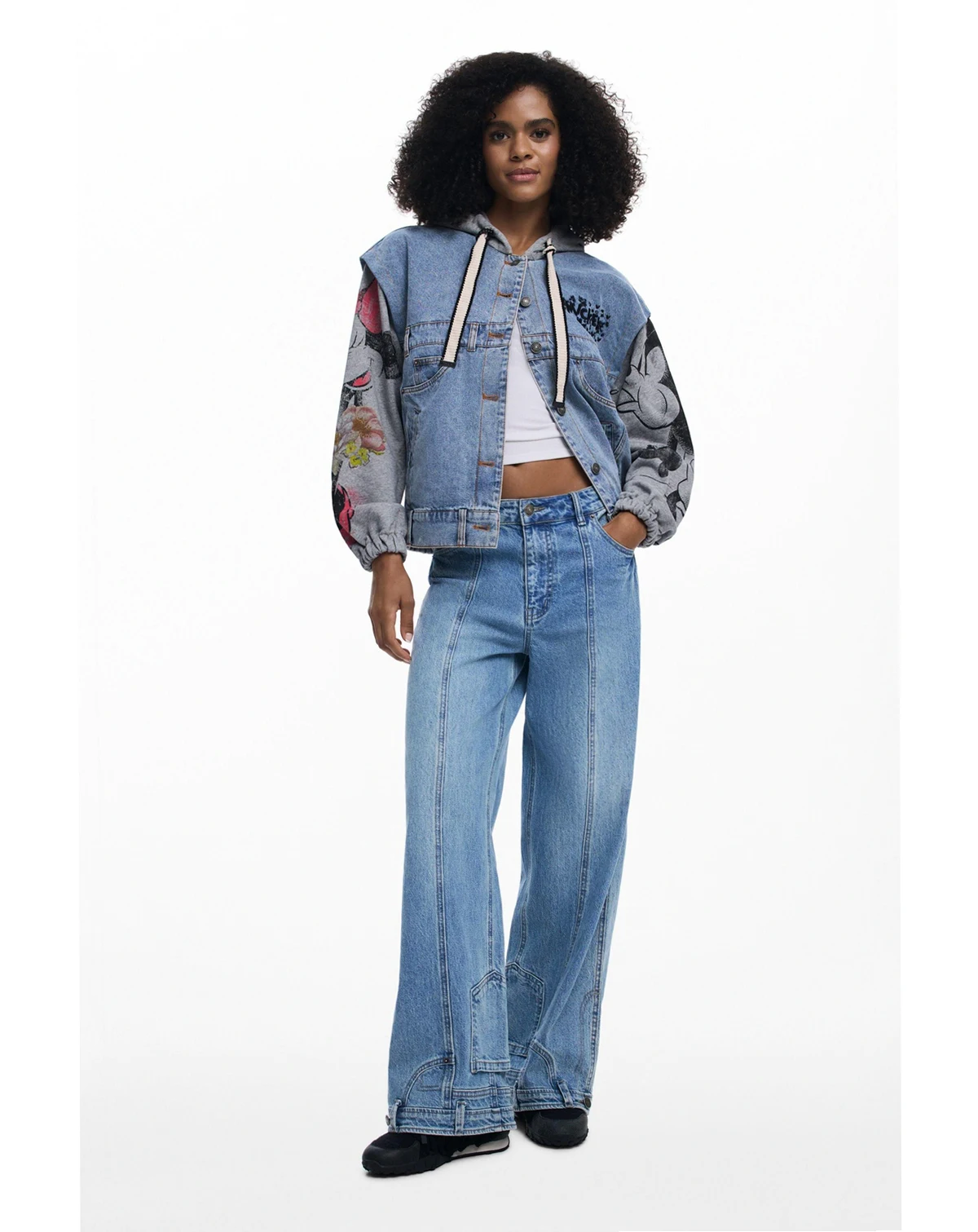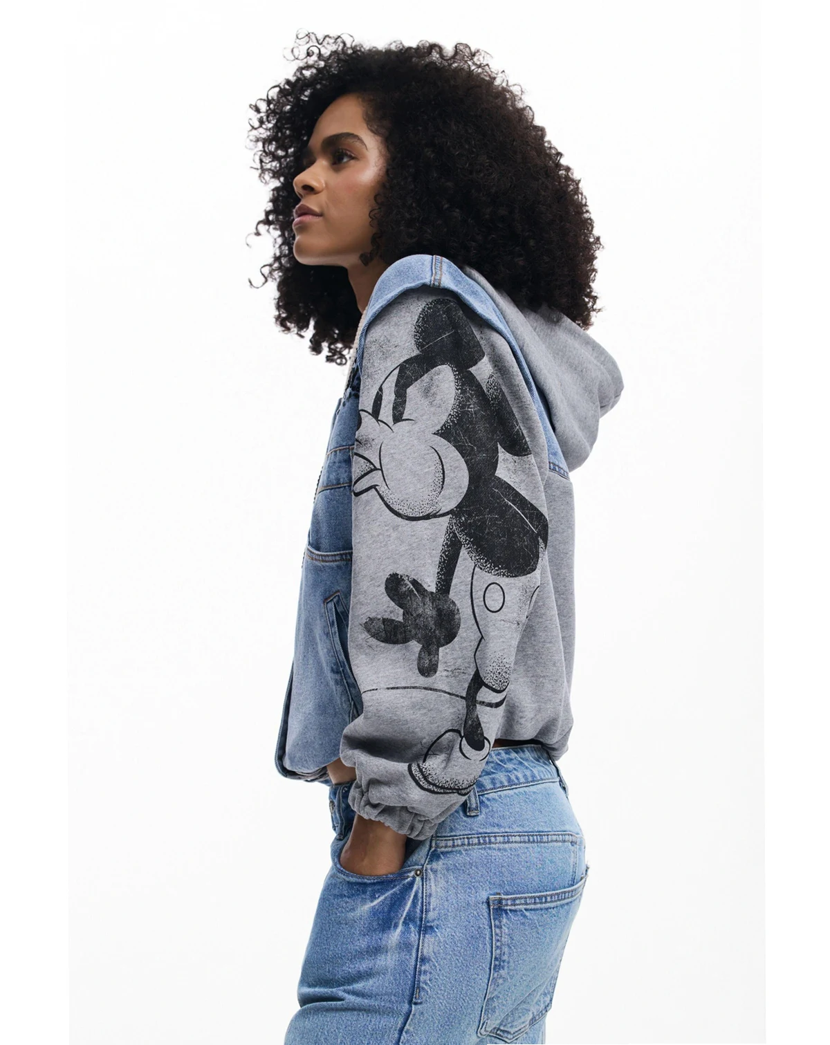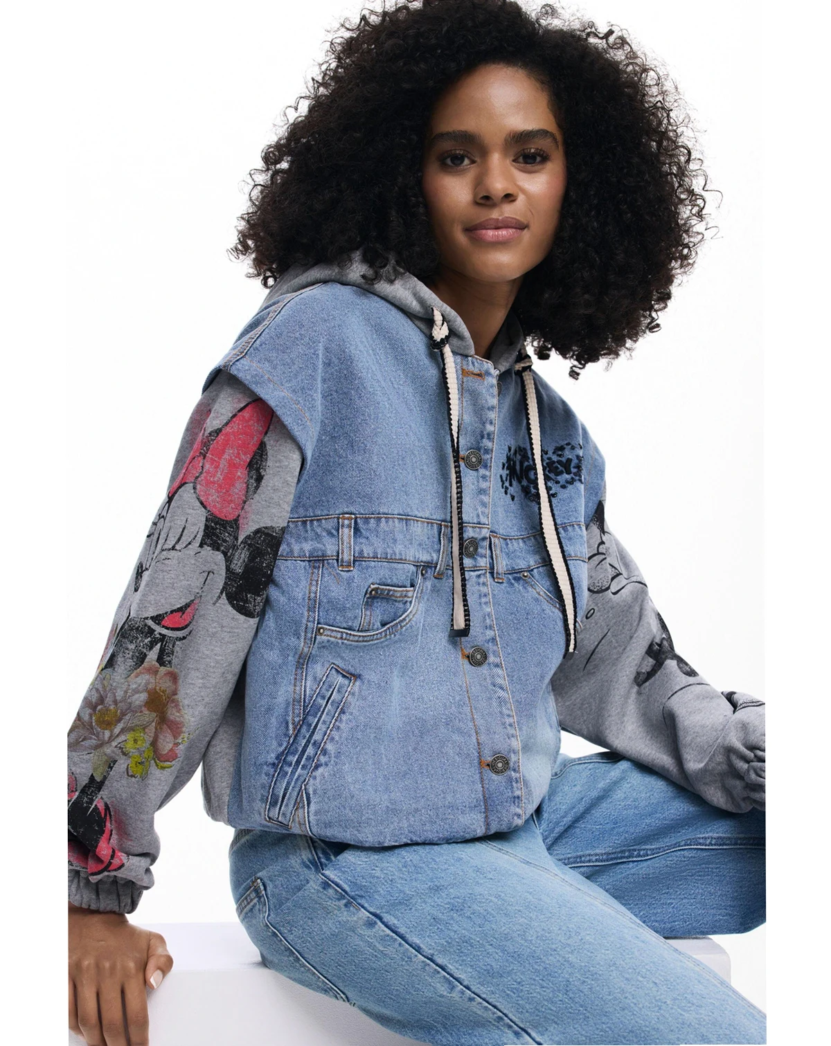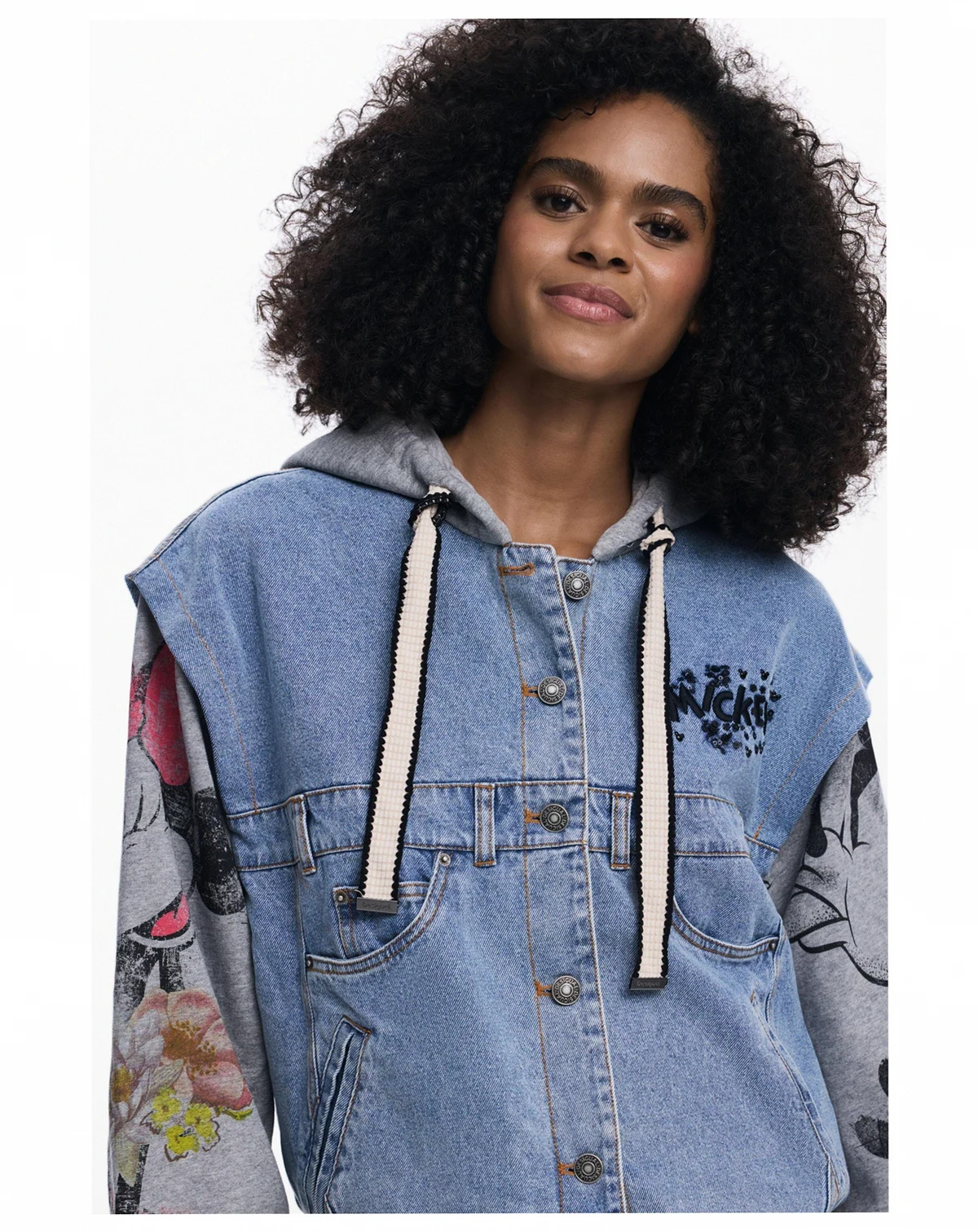 Denim trucker jacket with Mickey Mouse and Minnie Mouse details and sweatshirt sleeves and hood.