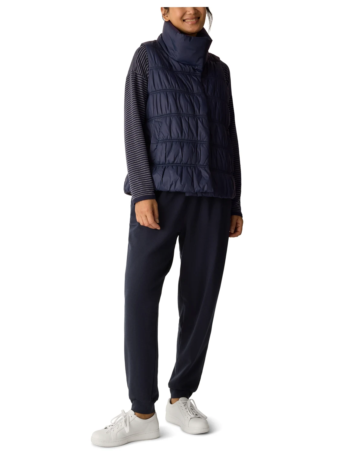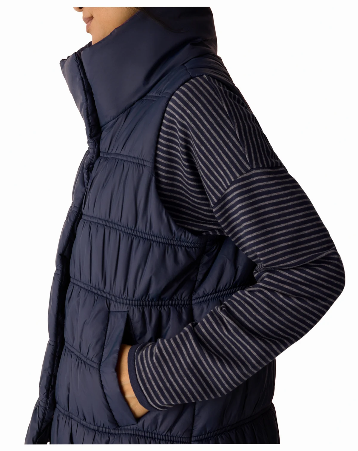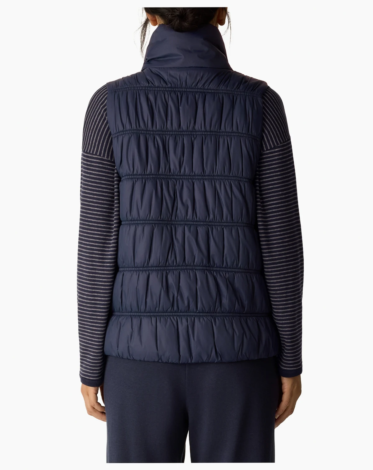 Enjoy lightweight warmth and subtle luster in this Eileen Fisher vest, designed with a high collar and ruched details for a sleek look. The sleeveless design and button closure provide versatile layering options.