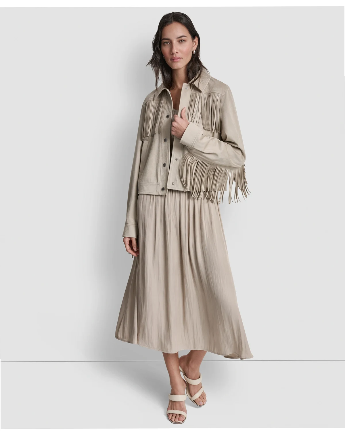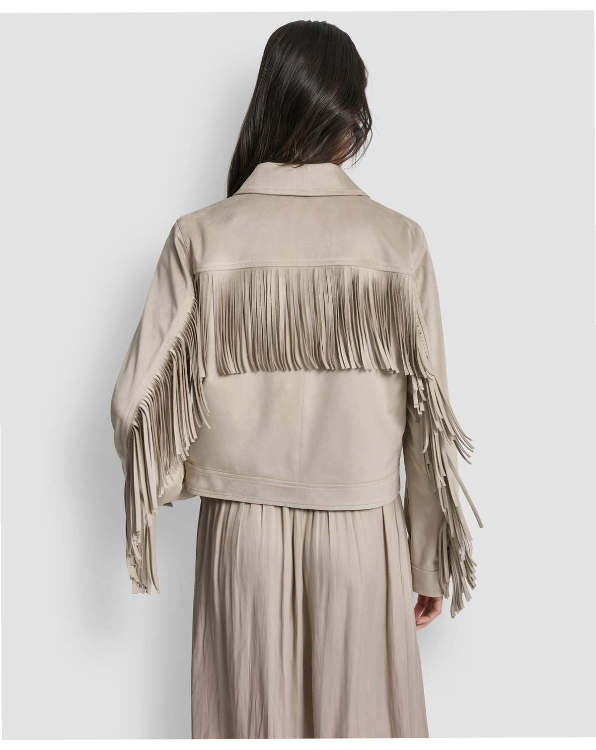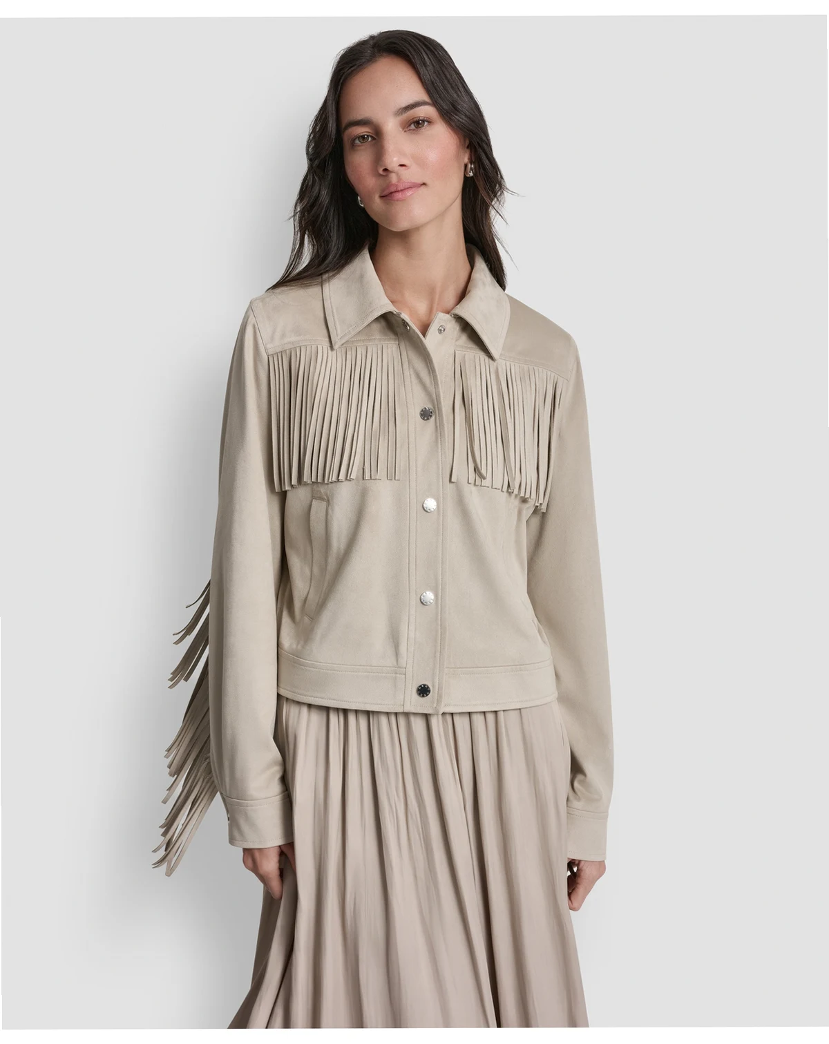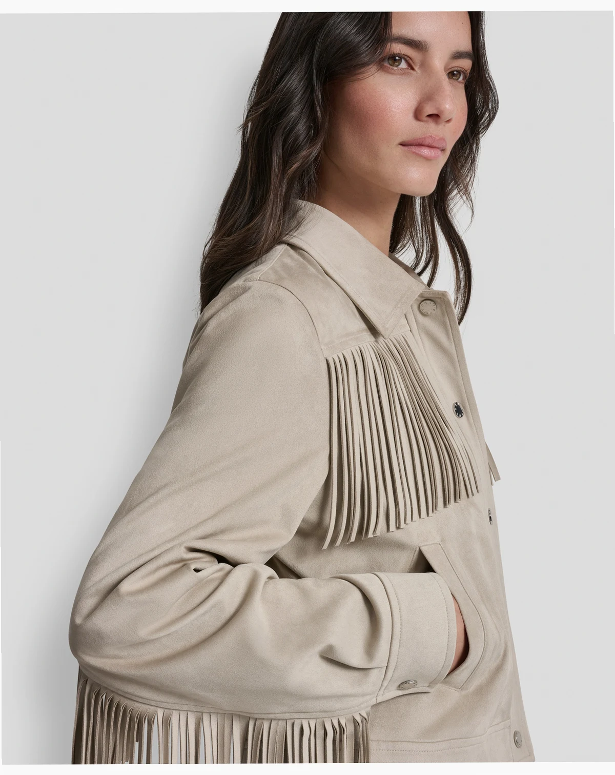 Bring playful texture into your layering lineup with this DKNY jacket, accented by fringed sleeves and a cropped silhouette. A zipper closure completes the look with versatile, everyday appeal.