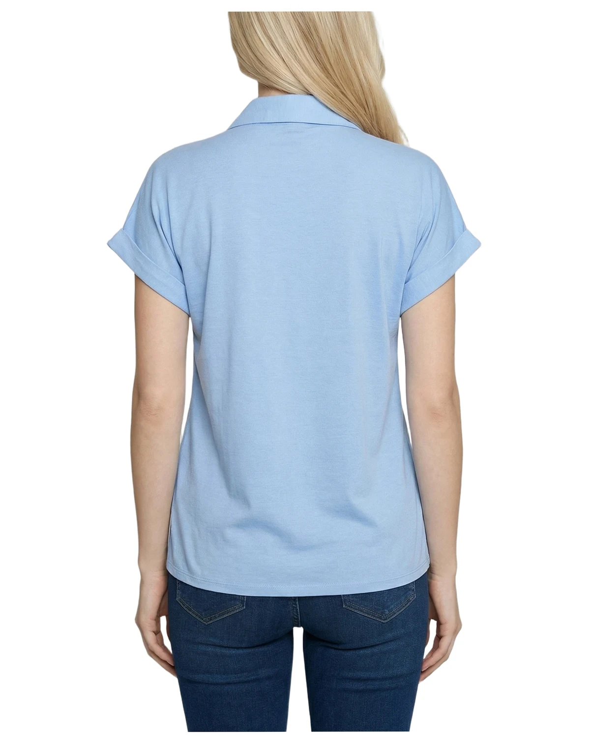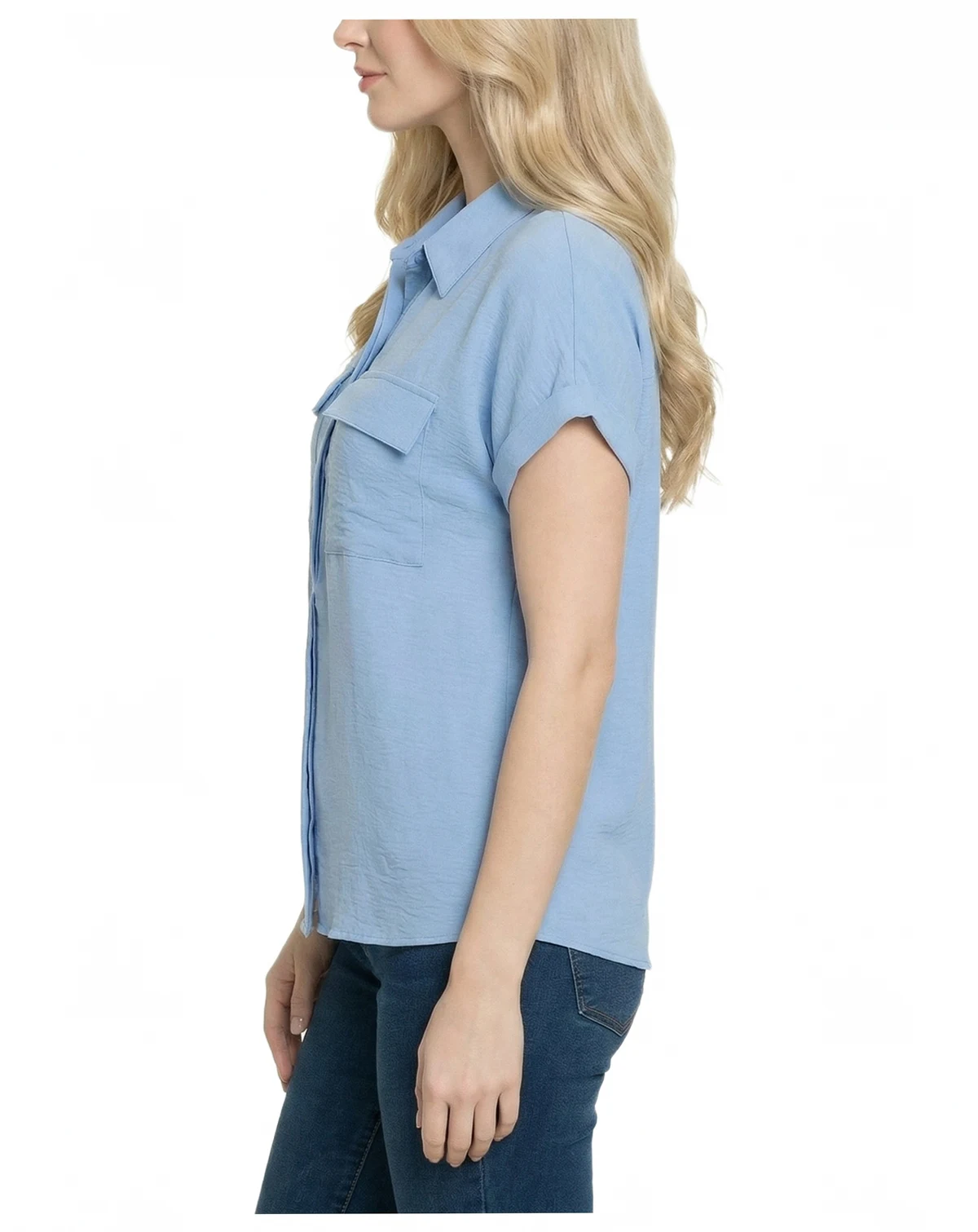 This short-sleeve button-front top from NY Collection features a classic collar, chest pockets, and a relaxed silhouette for easy everyday wear. Designed for comfort and versatility, it pairs effortlessly with jeans, trousers, or skirts for a polished yet casual look.