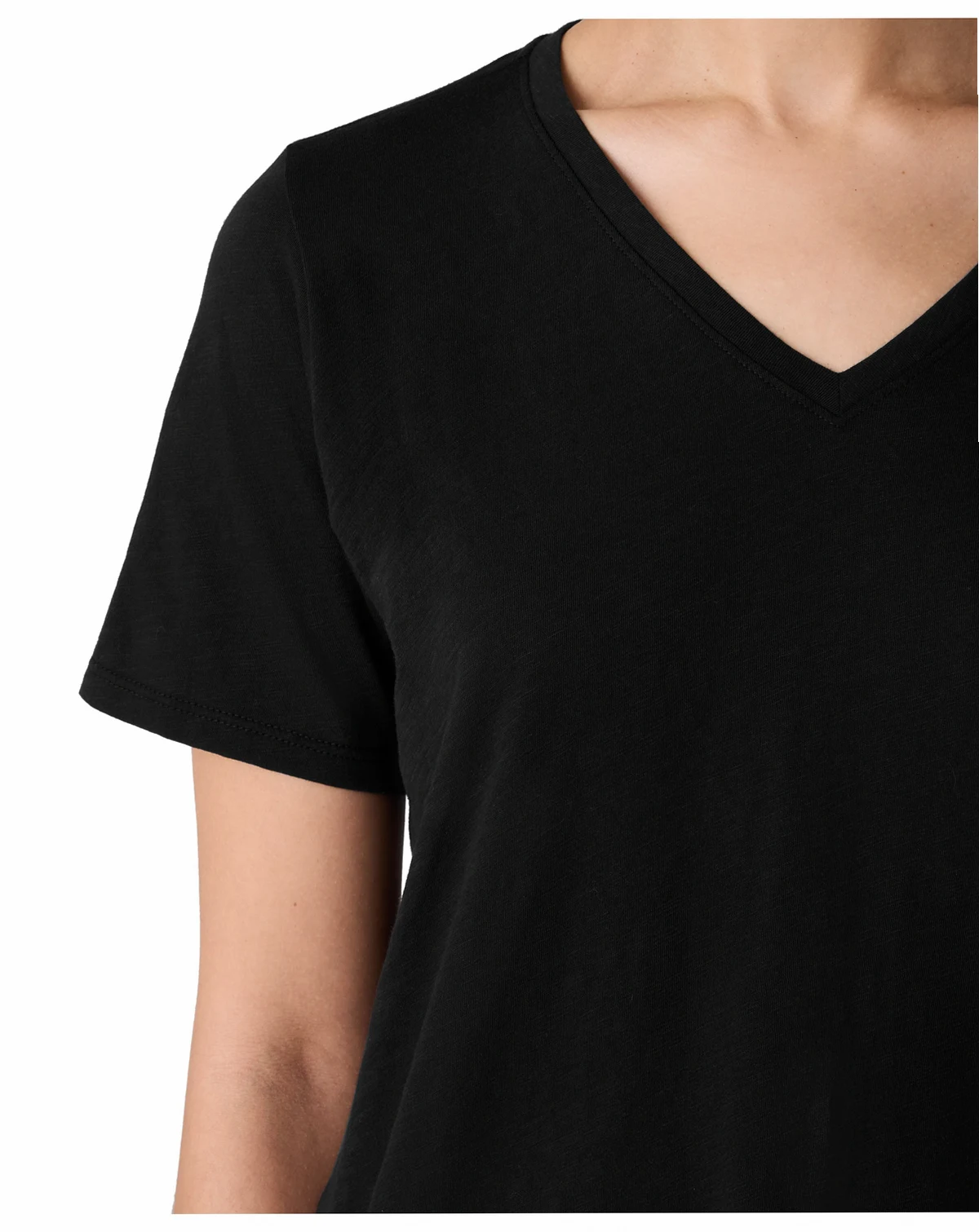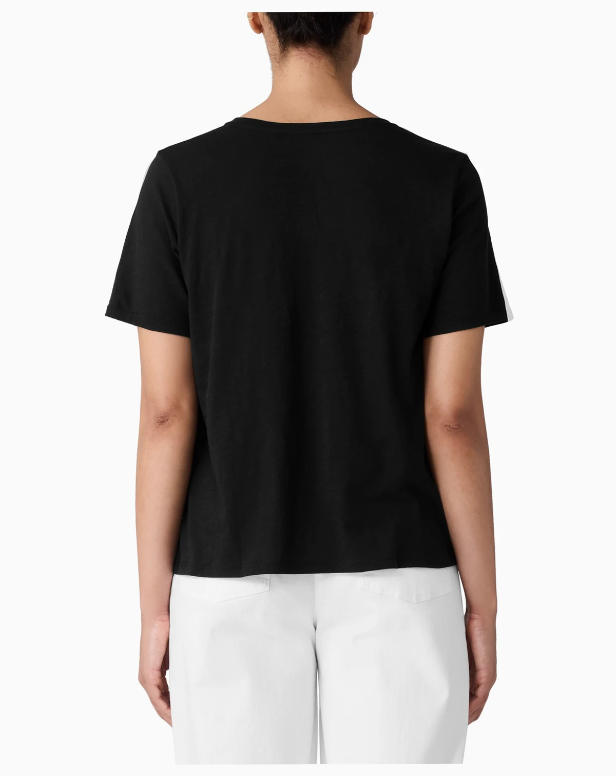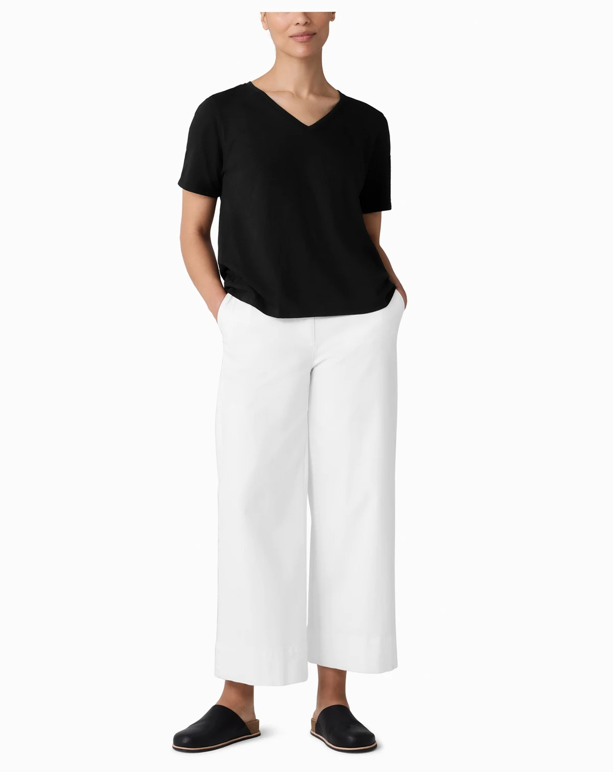 Made from a soft and light jersey, this Eileen Fisher top features a visual texture from a very fine slub yarn. The easy V-neck and short sleeve design offers a relaxed and comfortable silhouette for daily wear.