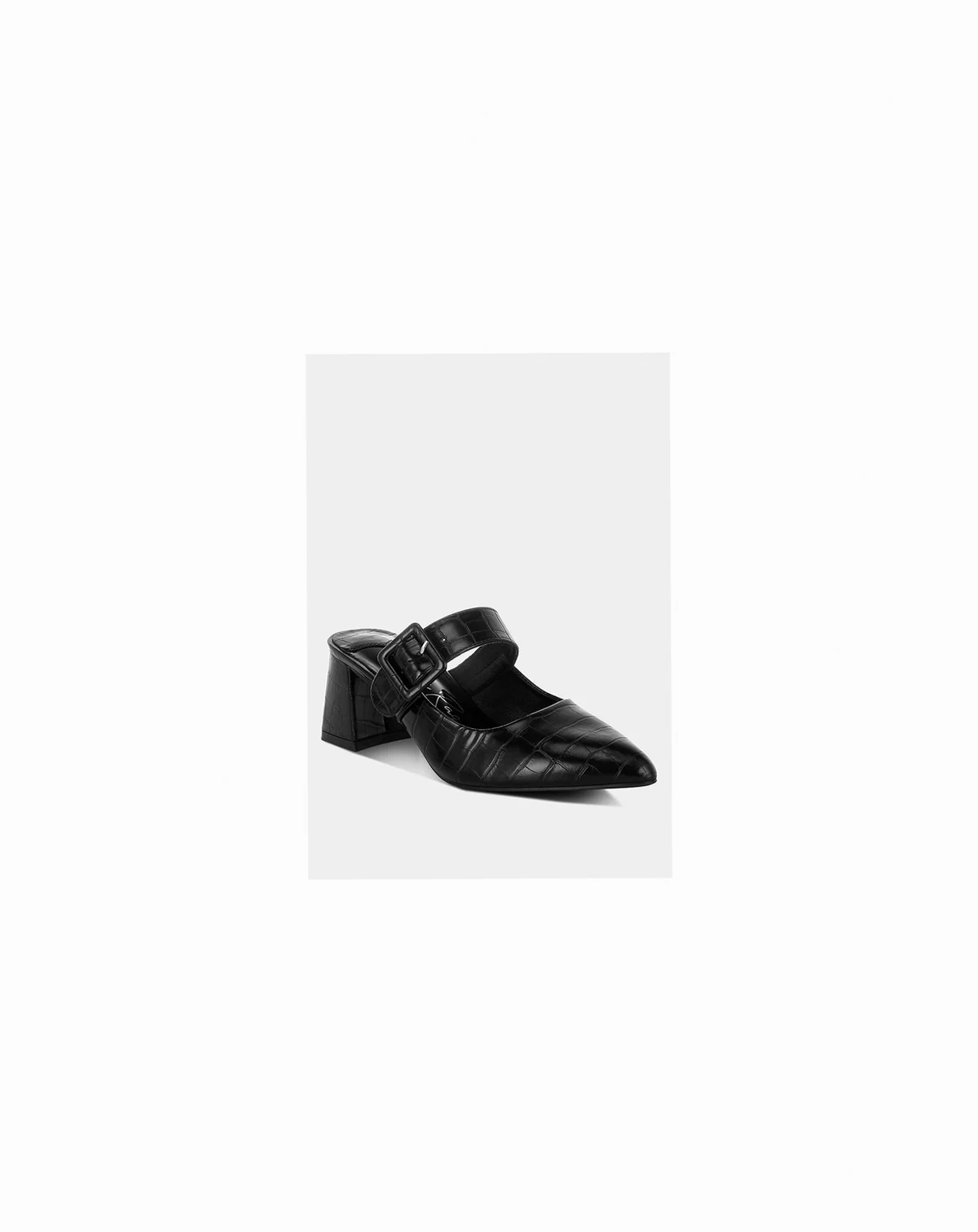 Chic and versatile, the pair of mules have a stylish flair with the croco embossed exterior and the pin buckle strap detail. The mules offer an easy to wear experience and the [plush cushion insoles ensure a comfortable walkability experience.