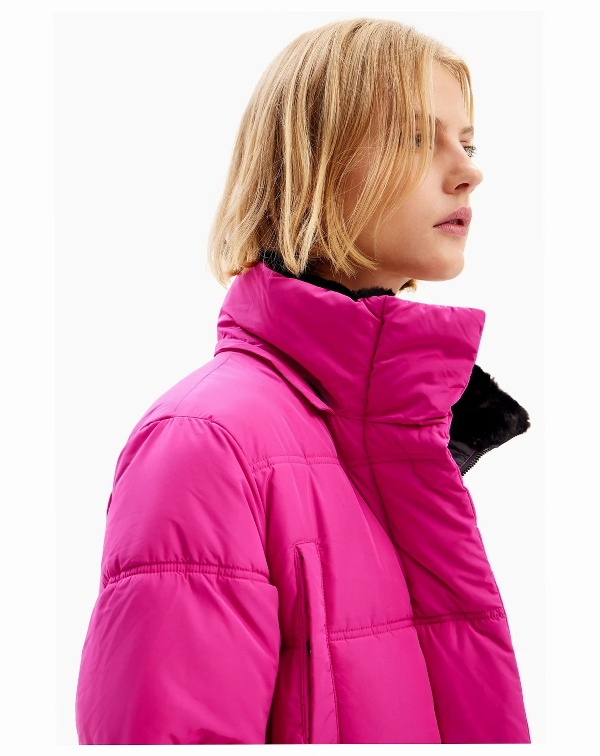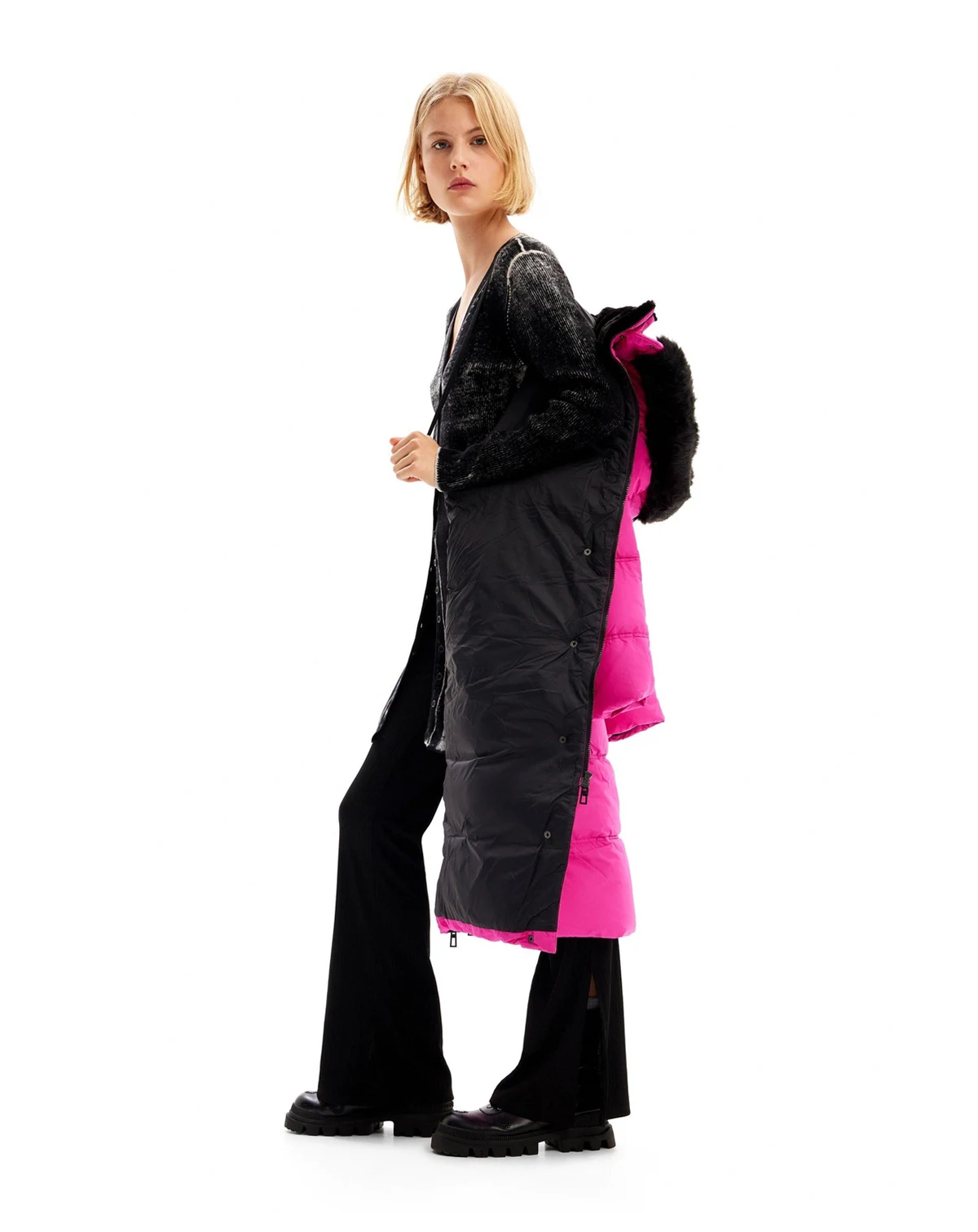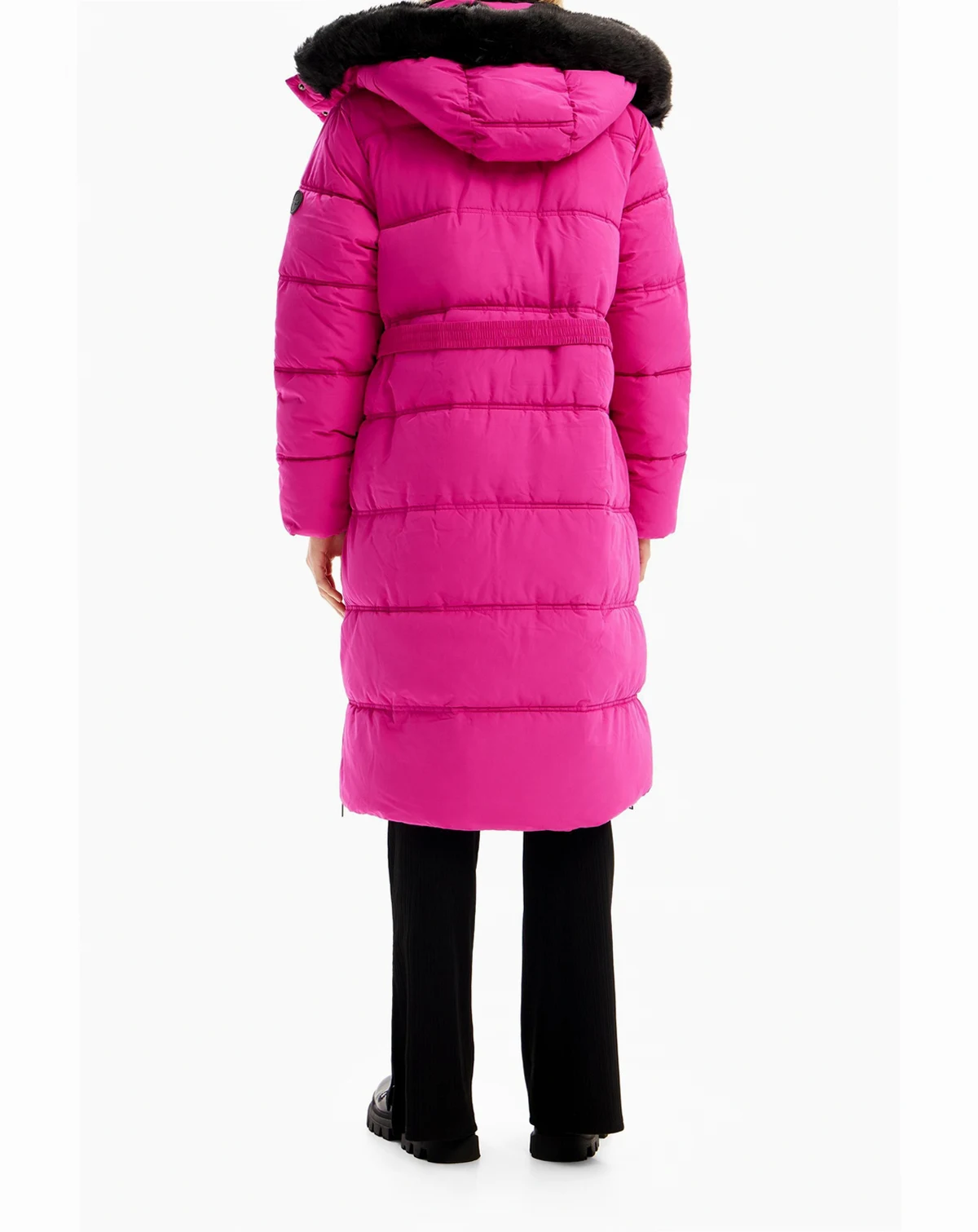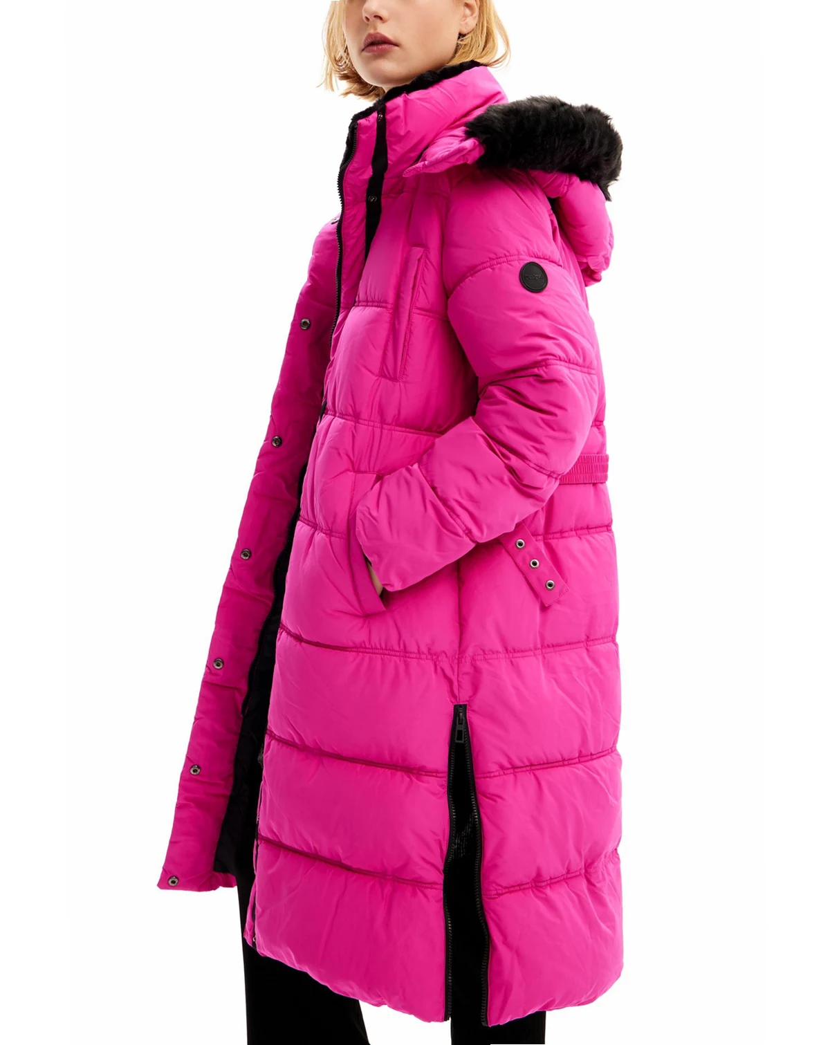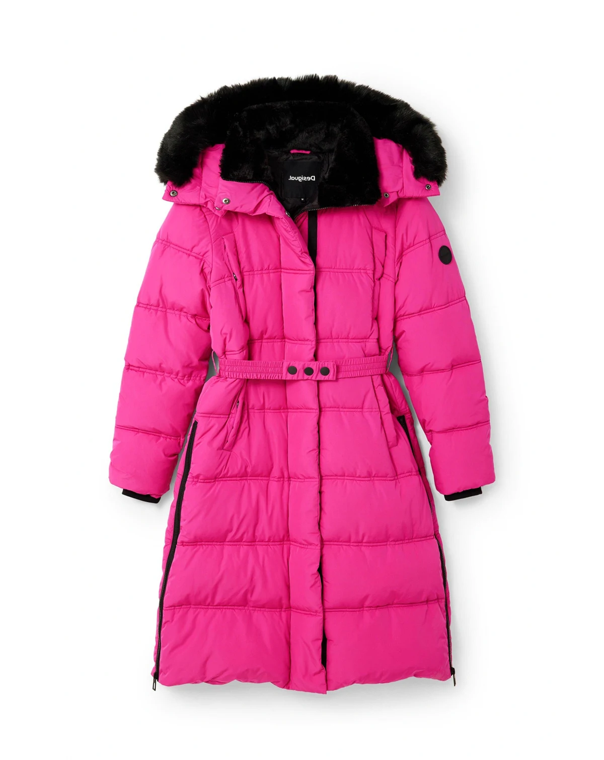 A padded coat with a detachable hood, multiple pockets, a belt, side zips and an inner lining.