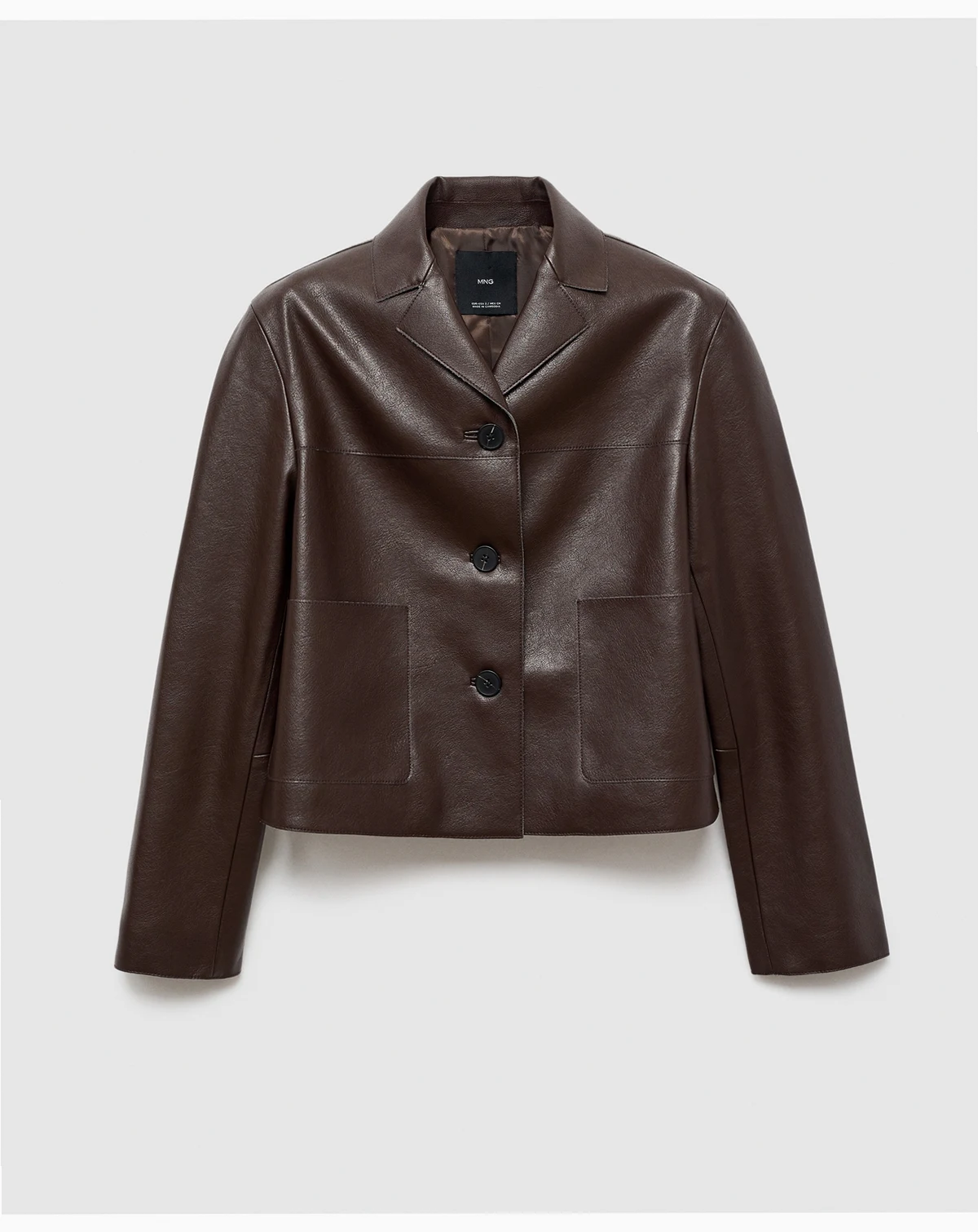 Sleek texture refines the Leather-Effect Jacket With Pockets from Mango. This short jacket features straight design with a shirt collar, long sleeves, patch pockets, button closure, and inner lining.
