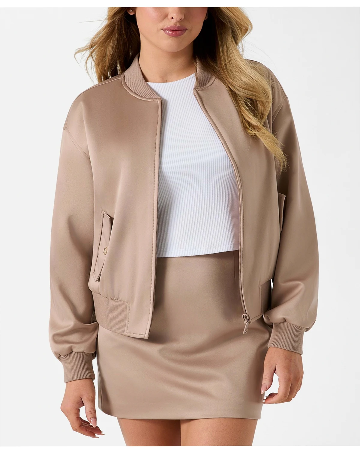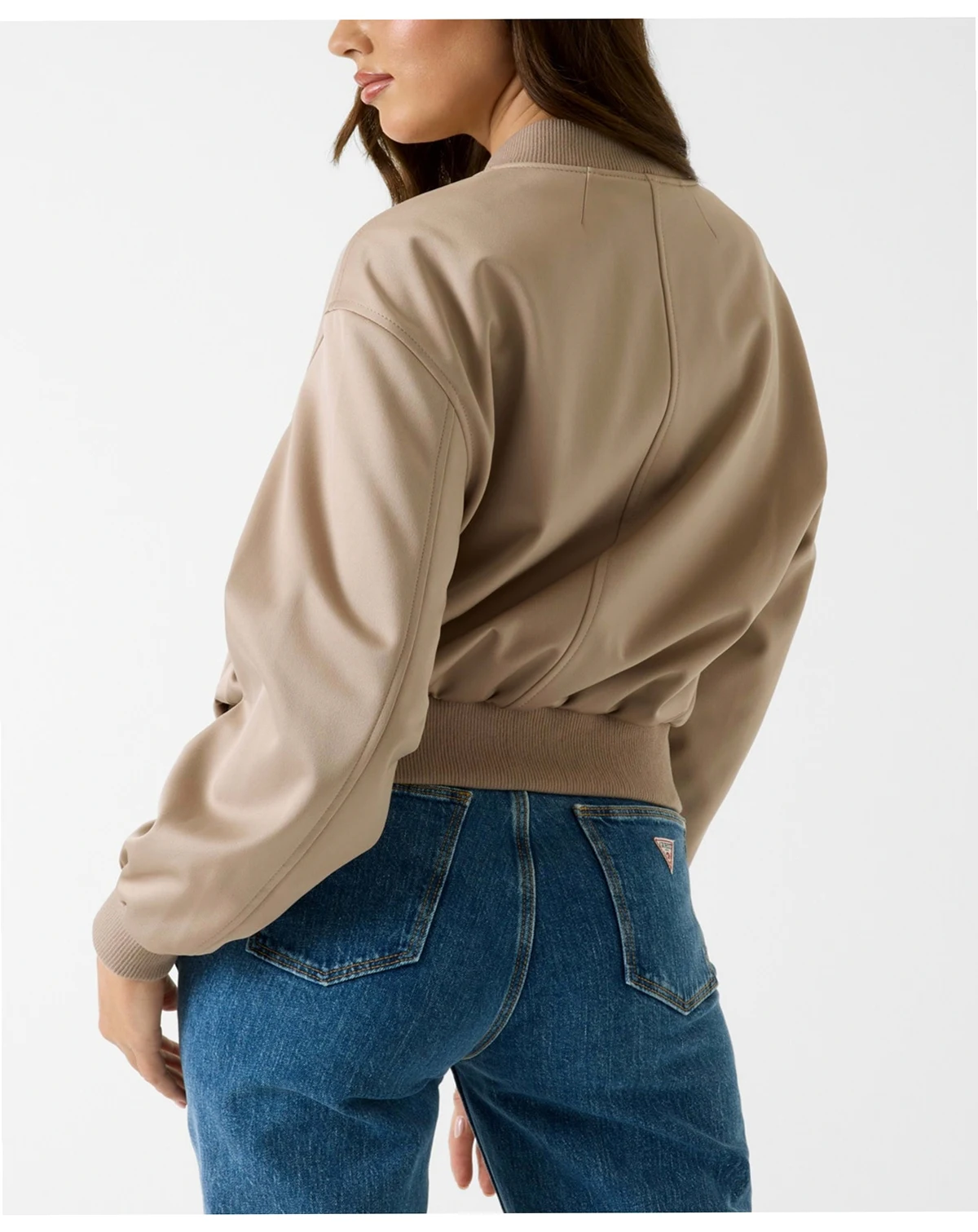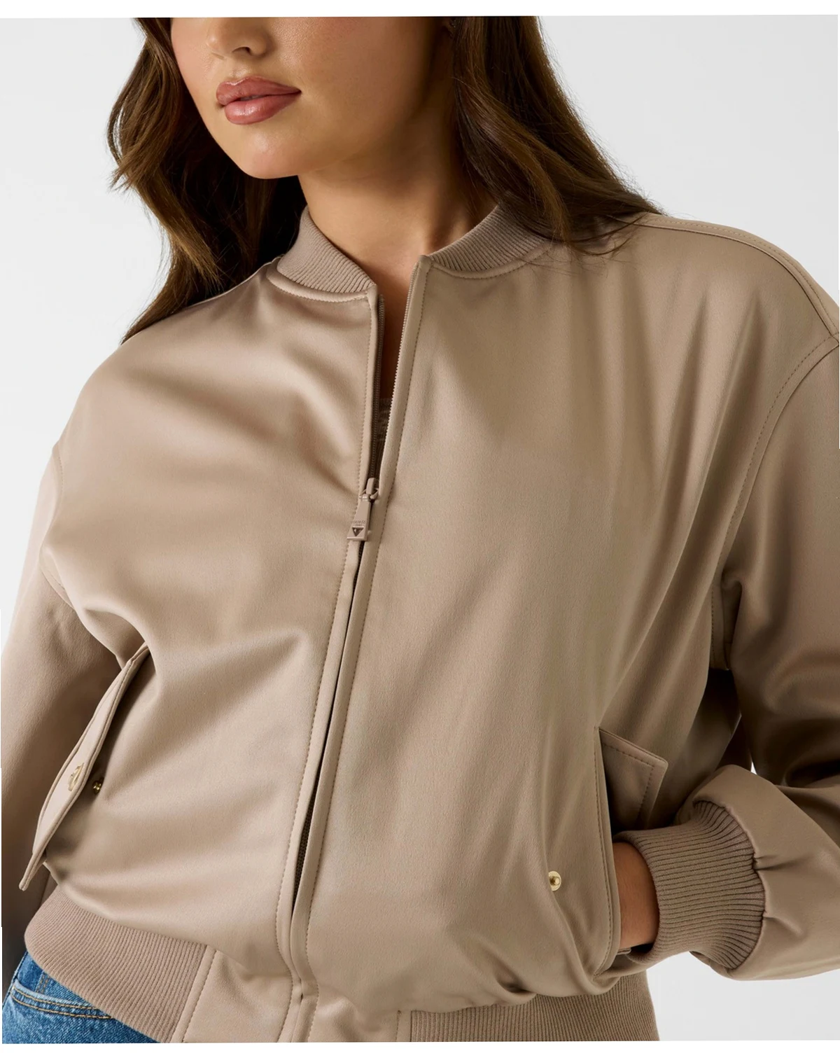 Elevate casual style with this GUESS bomber jacket designed with a mandarin collar and ribbed detailing. Its relaxed fit and front pockets deliver versatile comfort for everyday wear.
