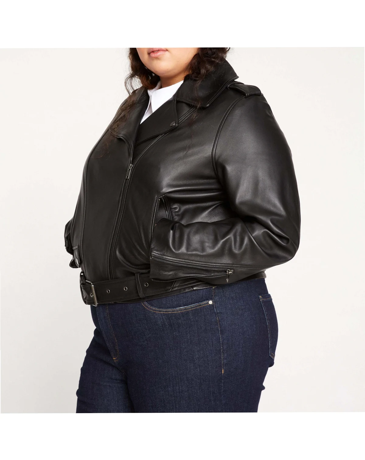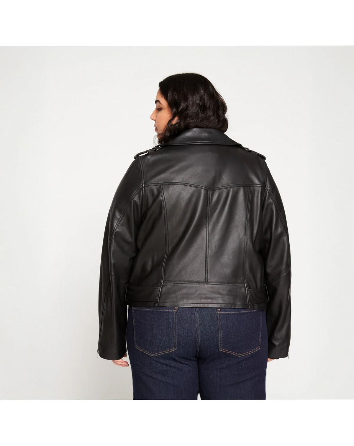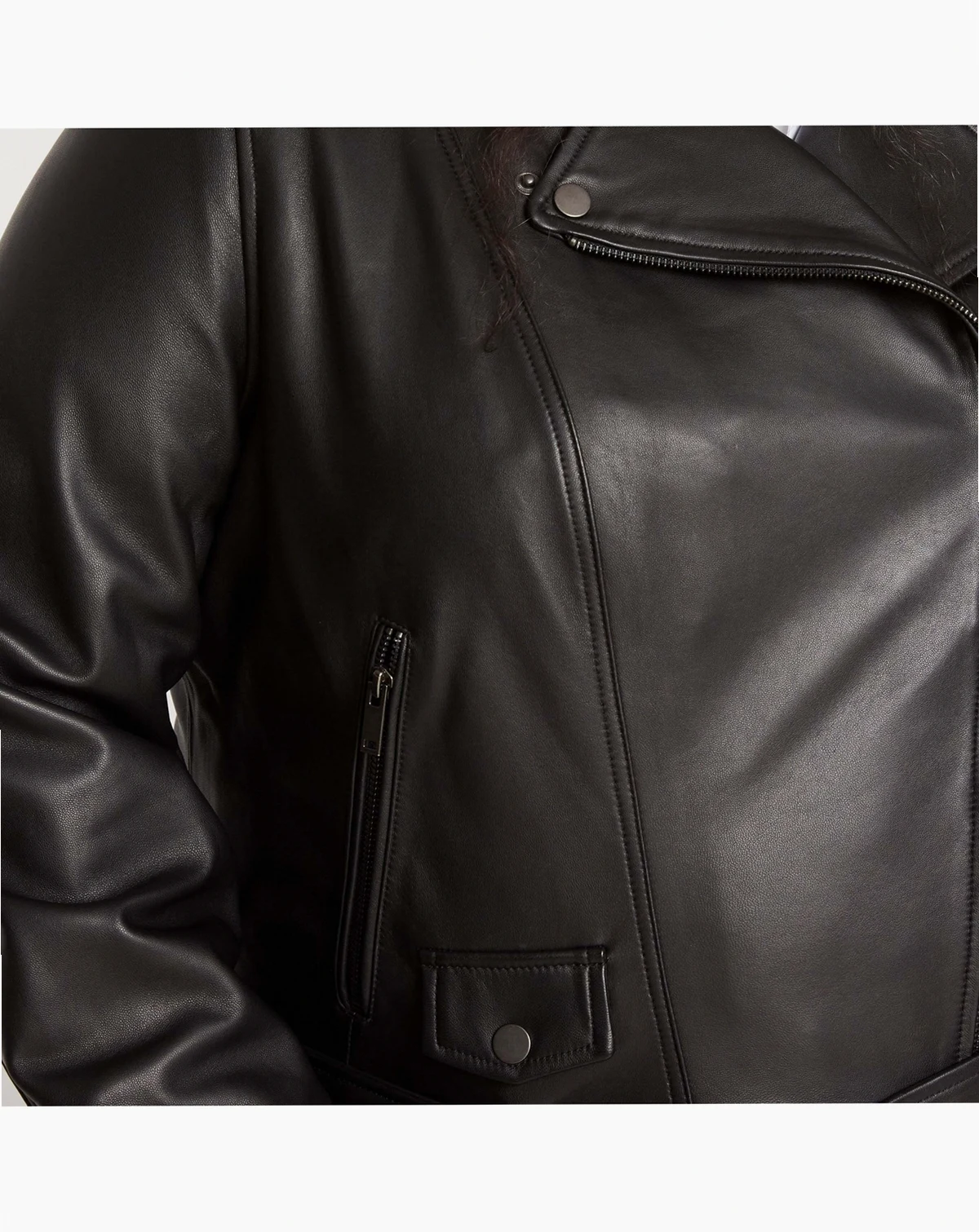 The completely cool, stunningly soft, premium leather jacket is finally here. Made from 100% butter-soft genuine leather, this iconic piece is tough and feminine with classic finishes, making this moto jacket a must-have. With metal hardware and snaps and a boxy fit that says cool, this is the perfect layer over, well, everything. Not too heavy. Not too light. It s just right. Fit: Loose, view the product size guide. Fabric: Shell: 100% Genuine Leather, Lining: 100% Polyester. Care: Professional leather cleaner only.