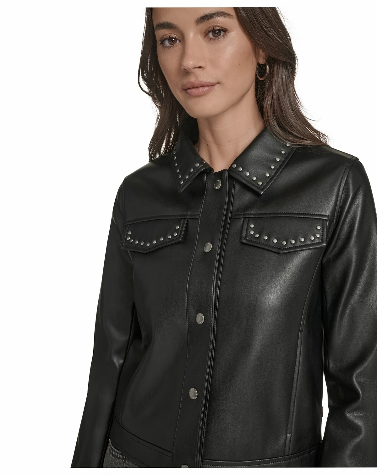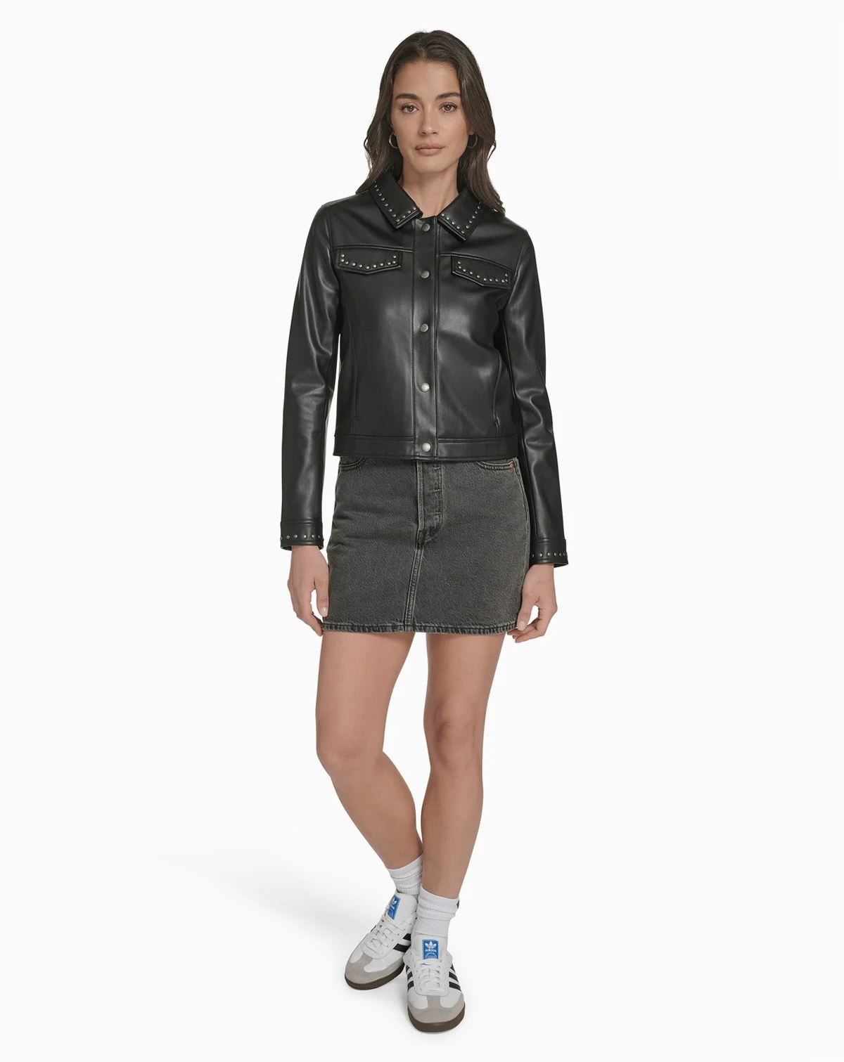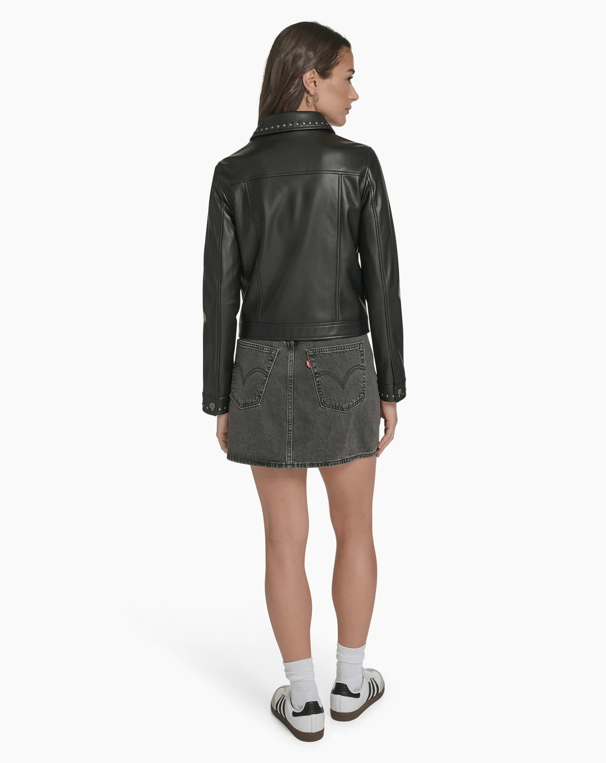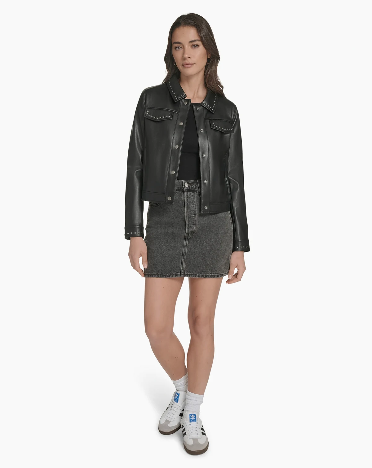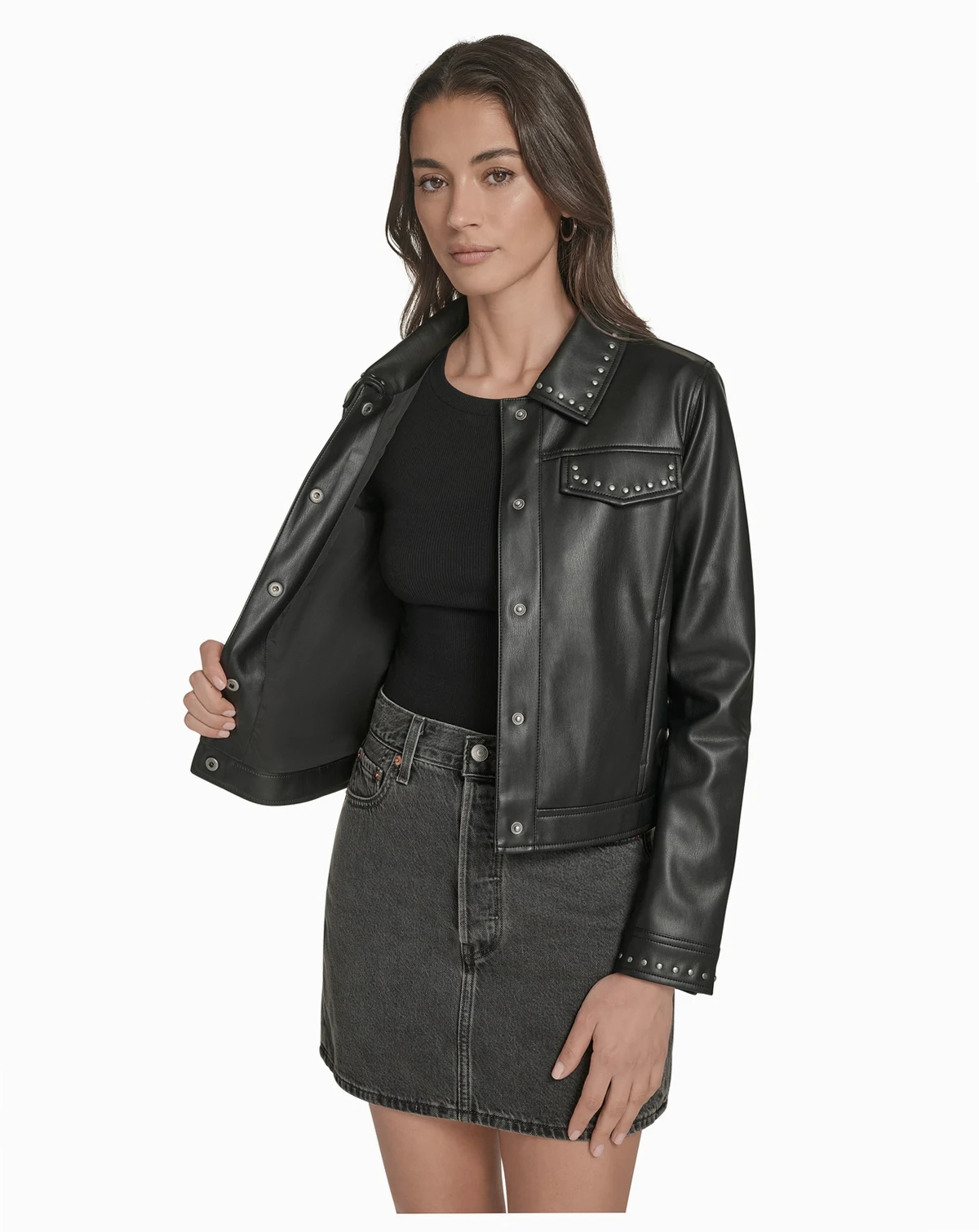 Bold attitude defines this Levi's jacket featuring studded accents along the cuffs, chest pockets, and collar for a distinctive character. A structured laydown collar adds polish, while dual snap chest compartments and lower welt pockets provide secure storage and everyday utility. Designed for confident wear, it delivers a standout presence with functional versatility suited for varied plans.