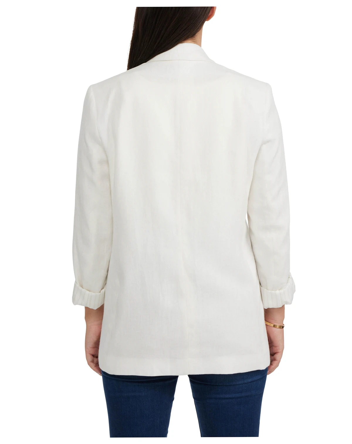 An updated classic, this versatile linen blend blazer features an elegant rolled cuffs, welt pockets and shoulder pads. Perfect for day or night!