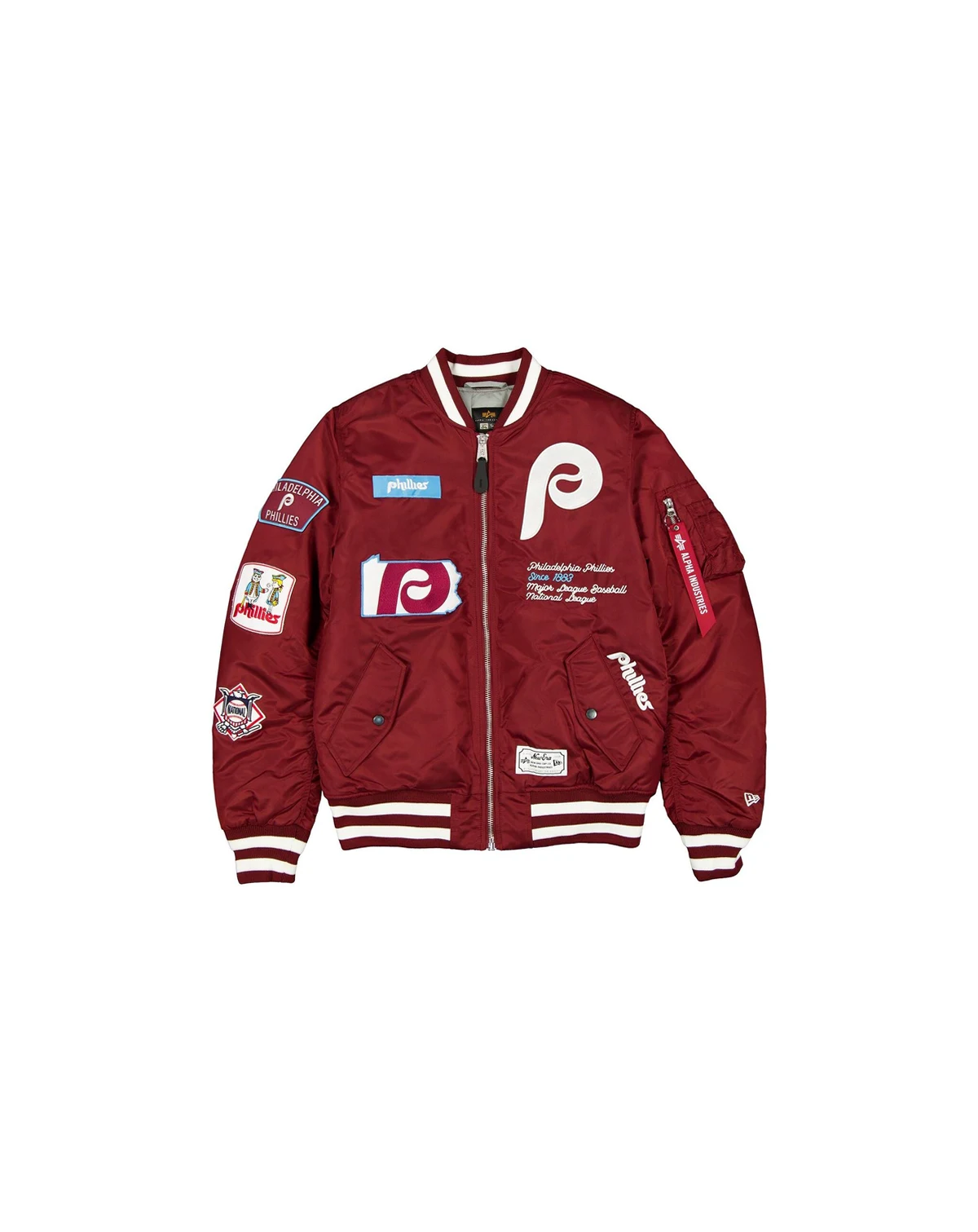 Showcase your Philadelphia Phillies pride with a classic piece of New Era outerwear. Alpha Industries is renowned for its American military-style apparel, and this jacket blends that heritage with modern fashion. With a slim fit and midweight feel, this jacket offers both comfort and a modern silhouette. It features a rib-knit collar, cuffs, and hem for a snug fit, along with two front flap pockets, two interior welt pockets, and a utility pocket on the sleeve for ample storage. Perfect for any Philadelphia Phillies fan, this bomber jacket is a stylish way to support your team in any season.
