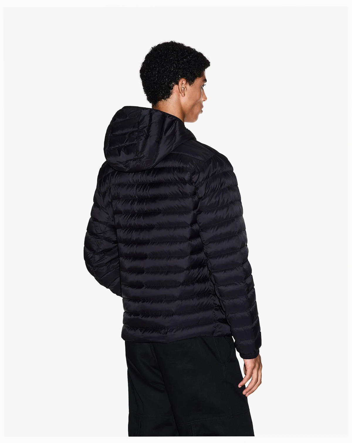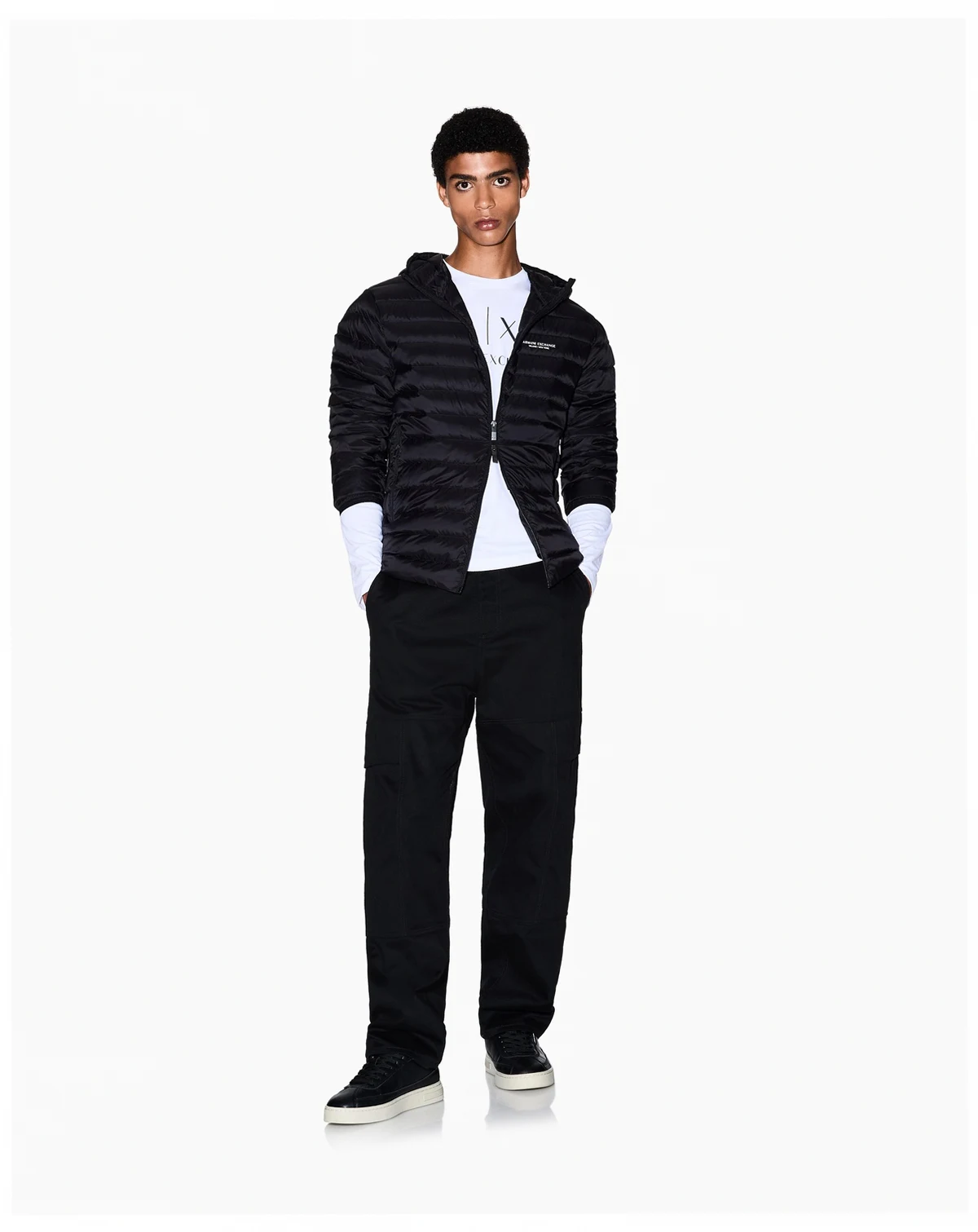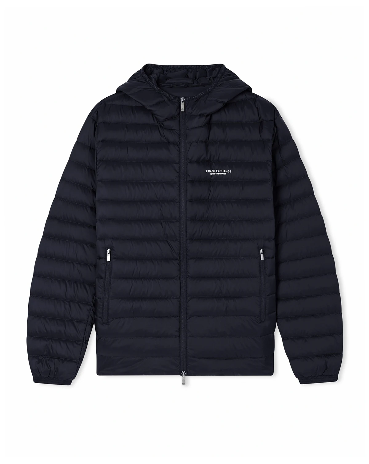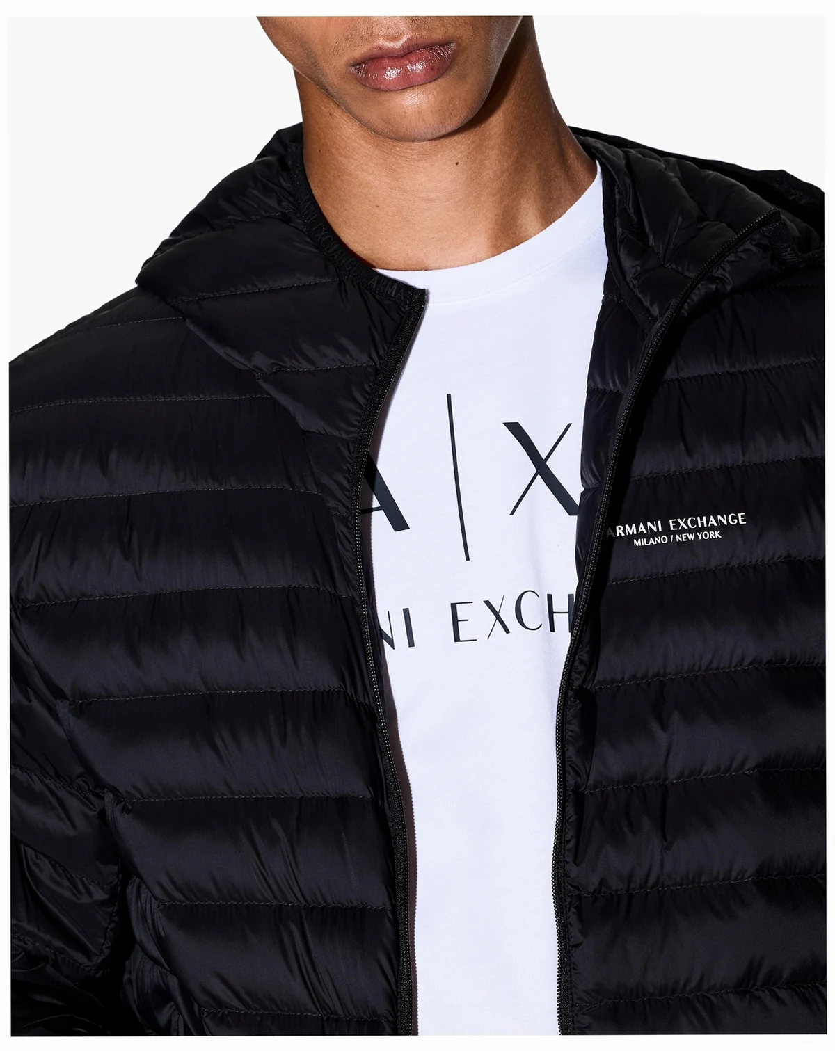 Stay warm without the bulk in this black down jacket from Armani Exchange. Lightweight and packable, it features a hood, zippered pockets, and bold horizontal quilting. Finished with the signature “Armani Exchange Milano New York” logo on the chest for a sleek, urban edge.