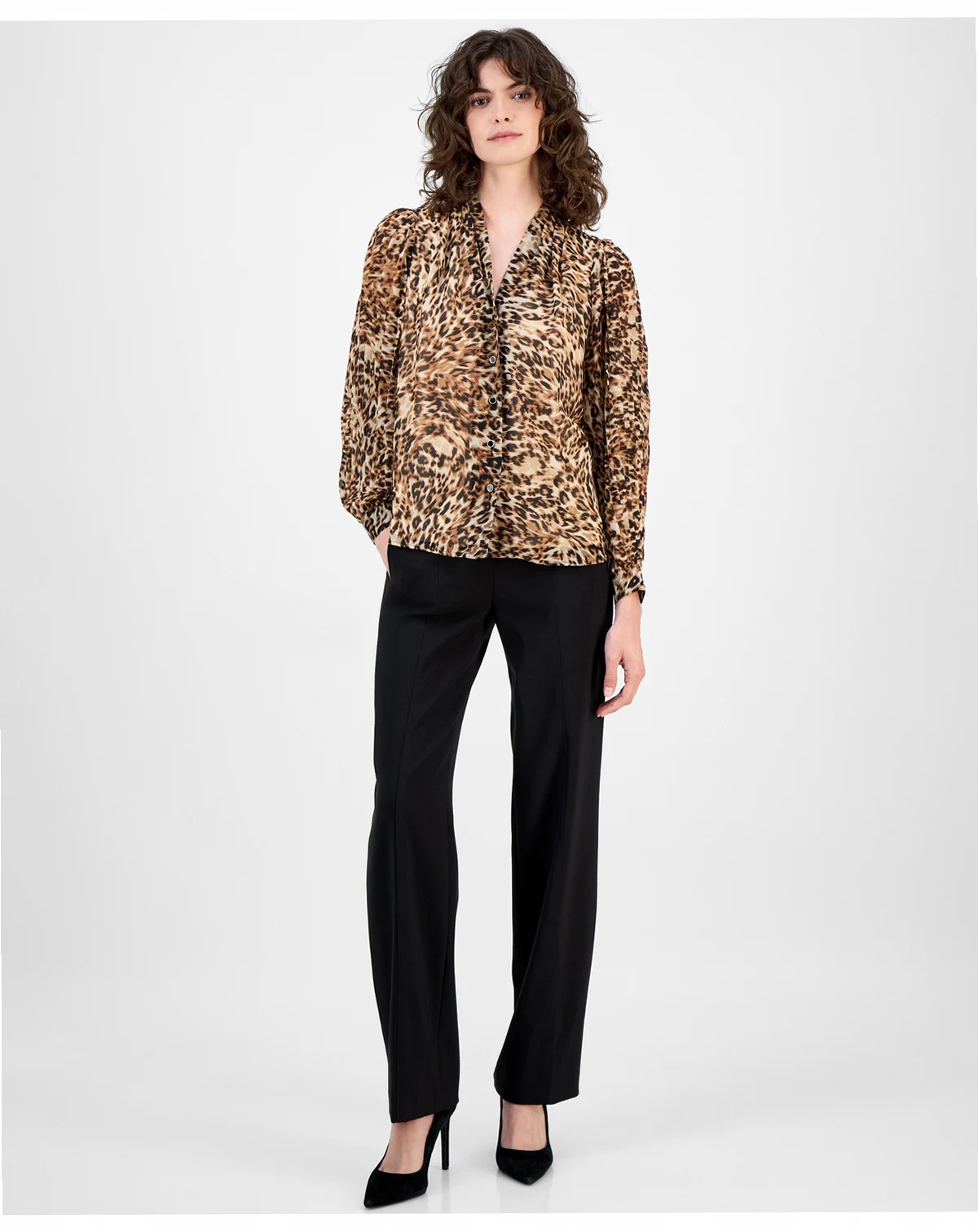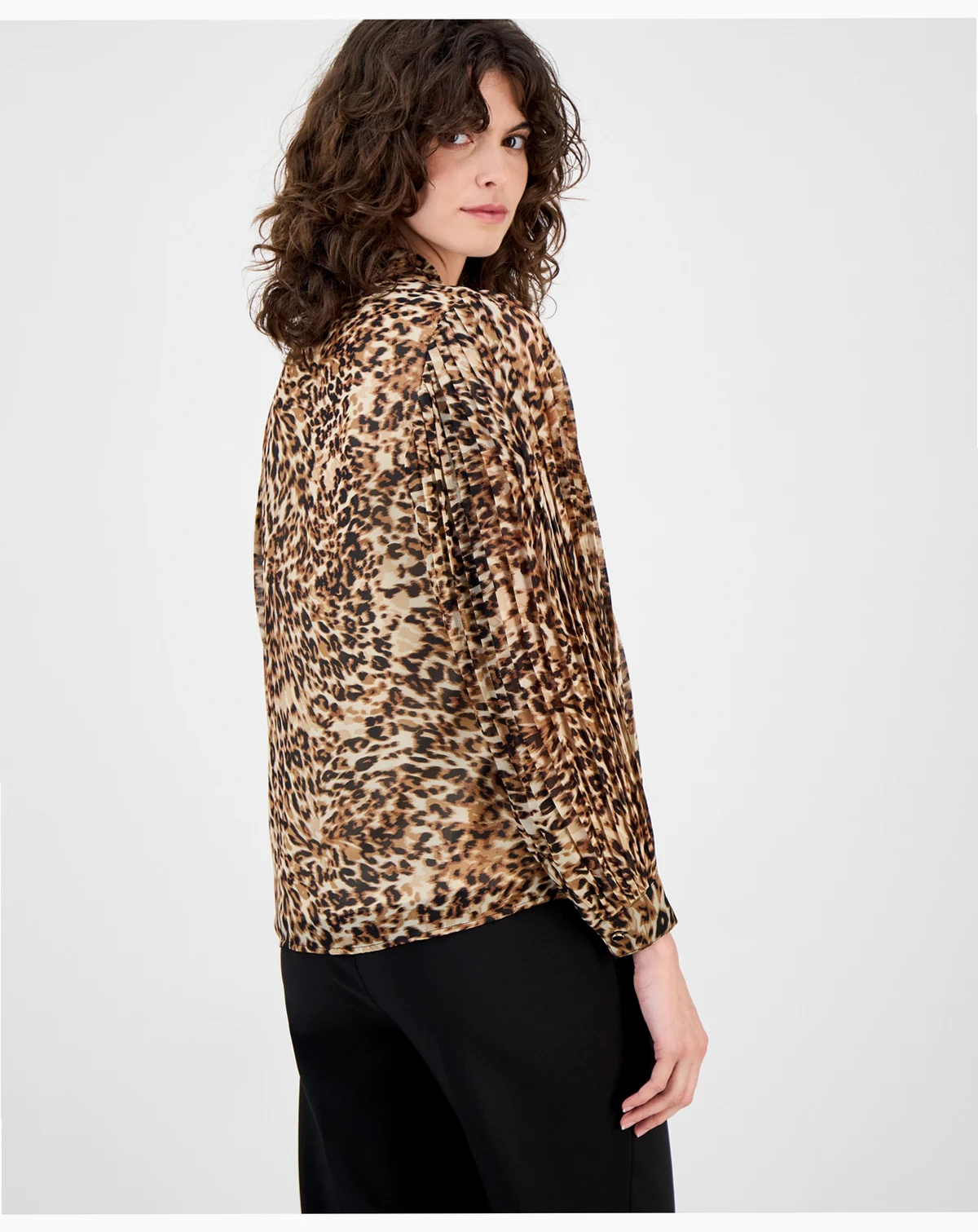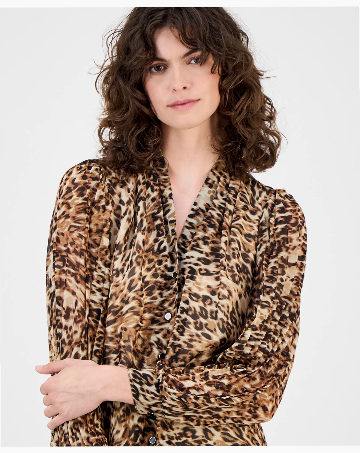 Pleated sleeves add a touch of sophisticated style to this printed button-front top from Anne Klein.