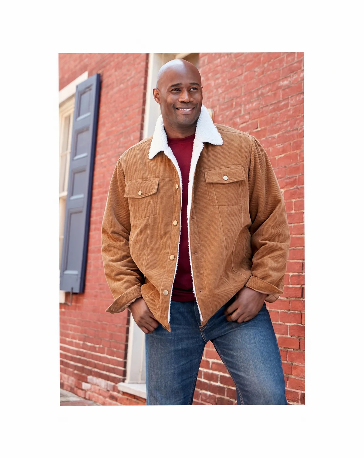 Keep it casual when the weather cools down in our Trucker Jacket that's lined with sherpa to keep you warm. It's perfect for those who love the look of their favorite denim jacket without having to wear too many layers. Relaxed fit Button front Point collar. Front flap chest pockets with snap closure. Adjustable-snap cuffs. Straight hem. Cotton/spandex outer. Polyester Sherpa Inner Lining. Machine wash. Imported Big approx. 31". Tall approx. 33"