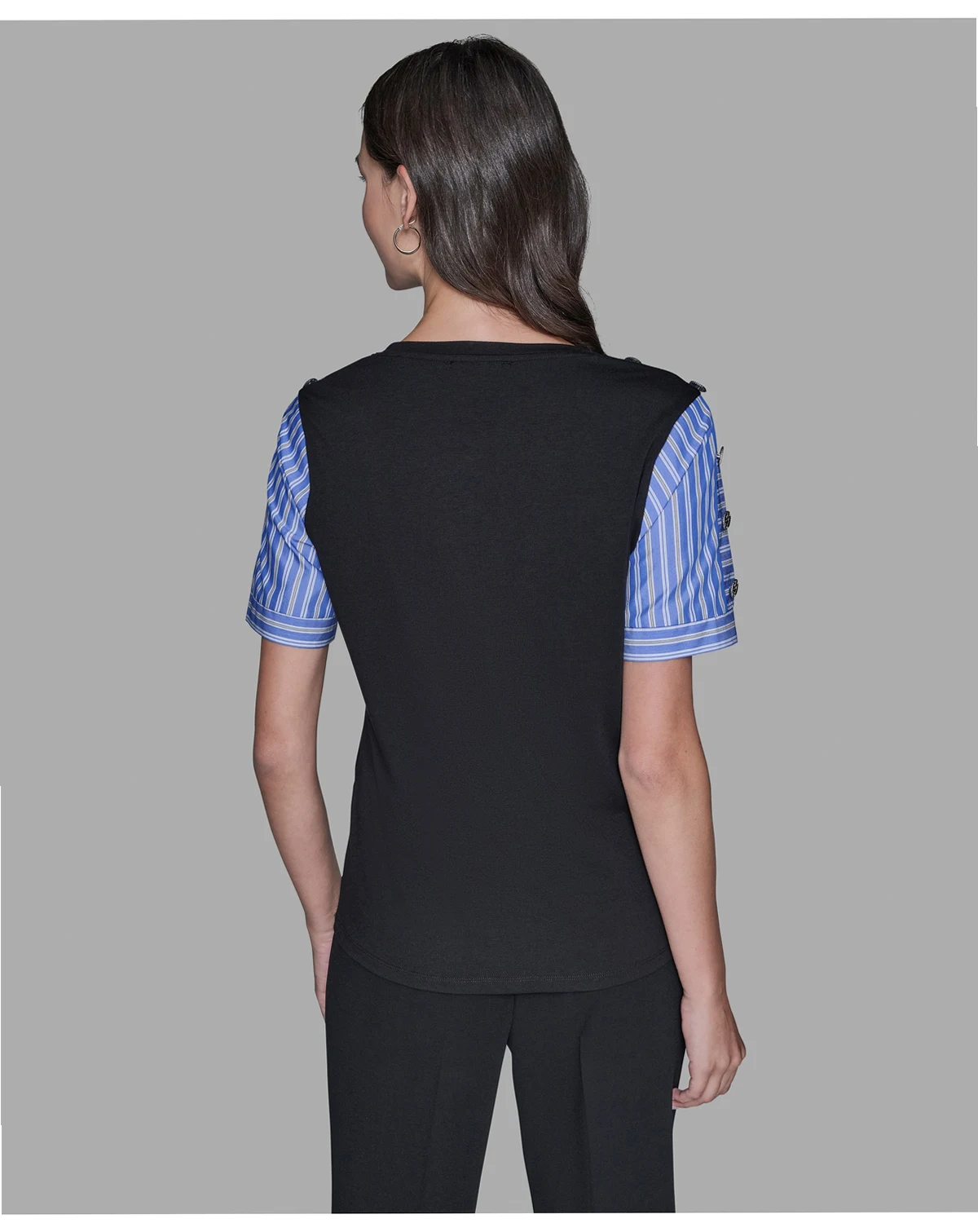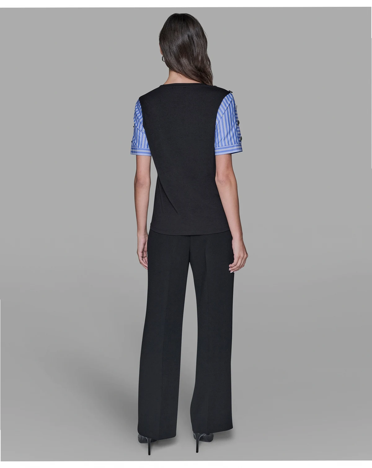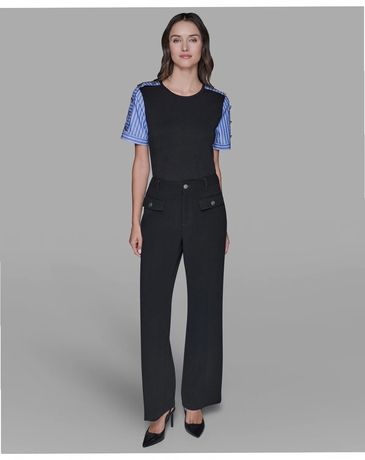 Accented with a pinstripe pattern, this KARL LAGERFELD PARIS top features a crewneck and short sleeves. The pull-on style and hip-length cut ensure a comfortable and stylish look.