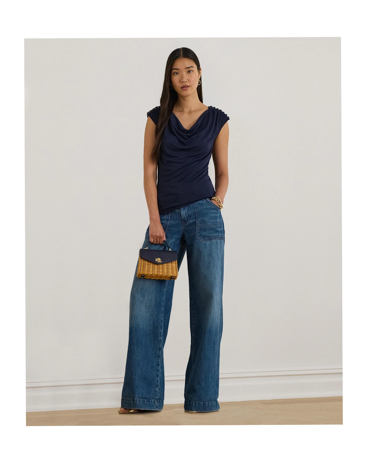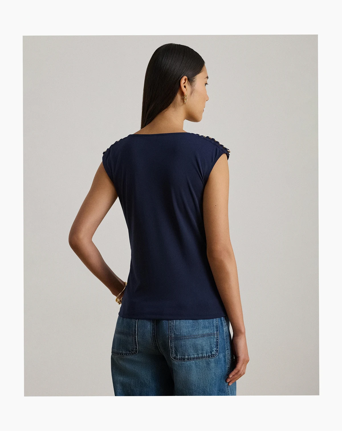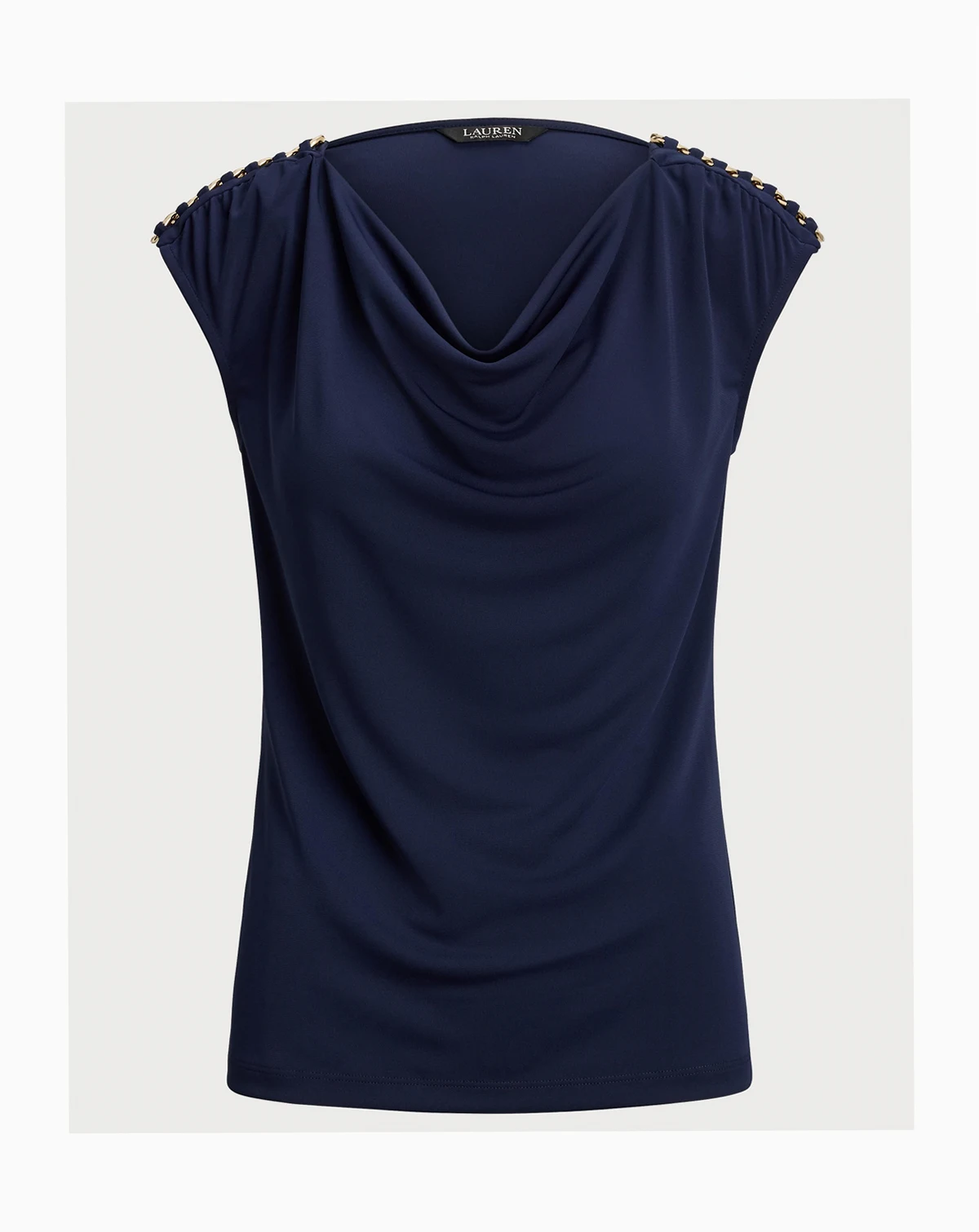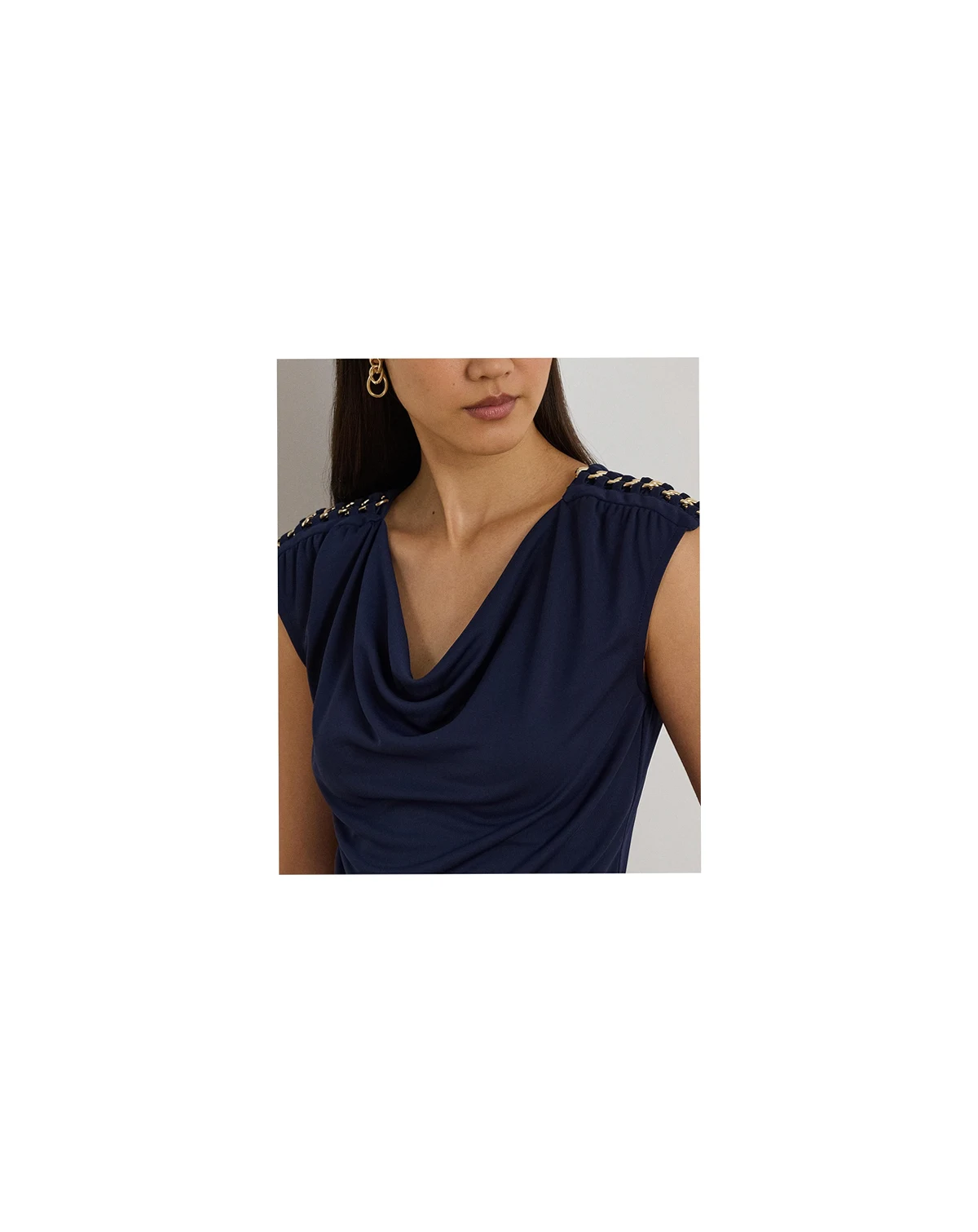 Crafted with breathable stretch jersey, this Lauren Ralph Lauren top features a gracefully draped cowl neck and chain embellishments on the shoulders. The sleeveless design and fully lined construction offer a relaxed, elegant fit.