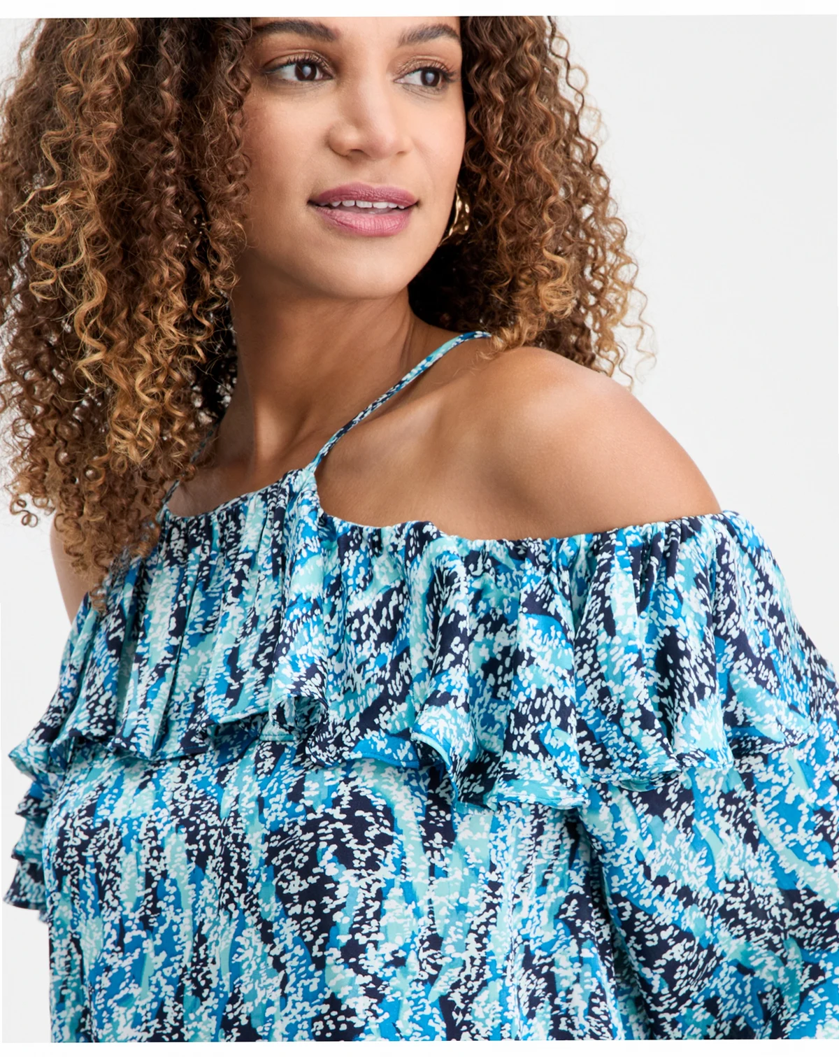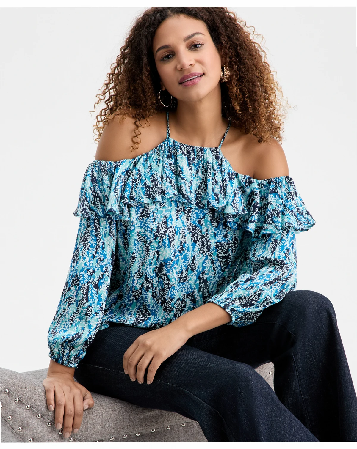 Energize your look with this ruffle-trimmed top from I.N.C International Concepts. A dynamic print and cold-shoulder cutouts add the perfect finishing touches. ABOUT THE BRAND: I.N.C. is inspired by fabulous women—always bold, confident, and stylish.