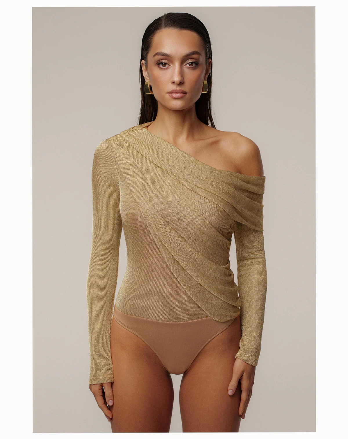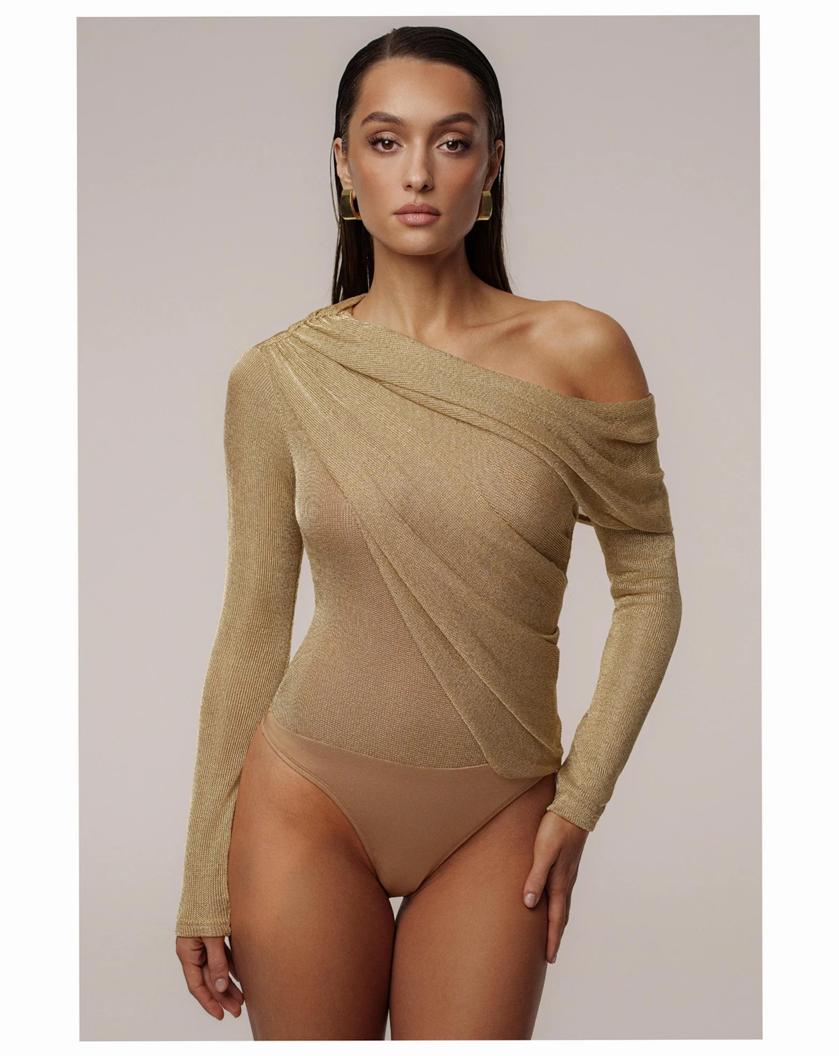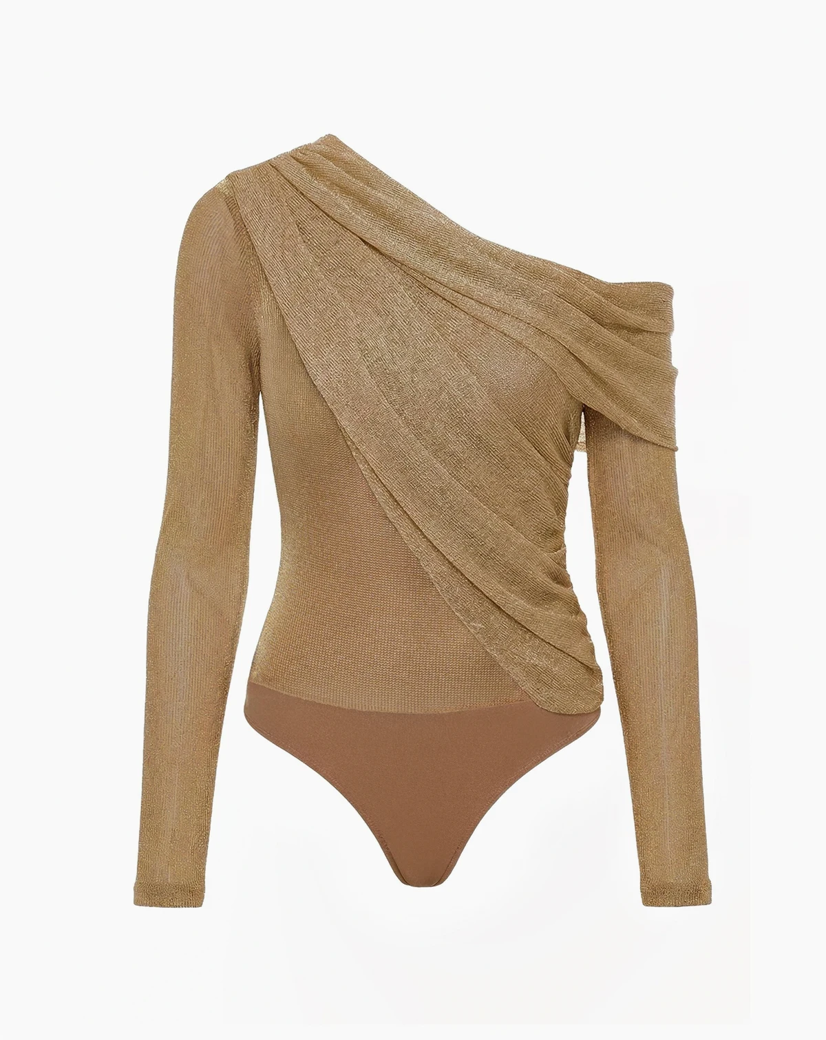 Our new Gold Opulent Metallic Bodysuit radiates glamour and sophistication. Designed in a luxurious metallic finish, this off-the-shoulder bodysuit features a draped, crossover neckline that exudes elegance. The long sleeves and fitted silhouette create a sleek and flattering look, perfect for evening events or upscale parties. Secured with a thong-style double snap closure. Double-lined. Stretchy. Not sold as set.