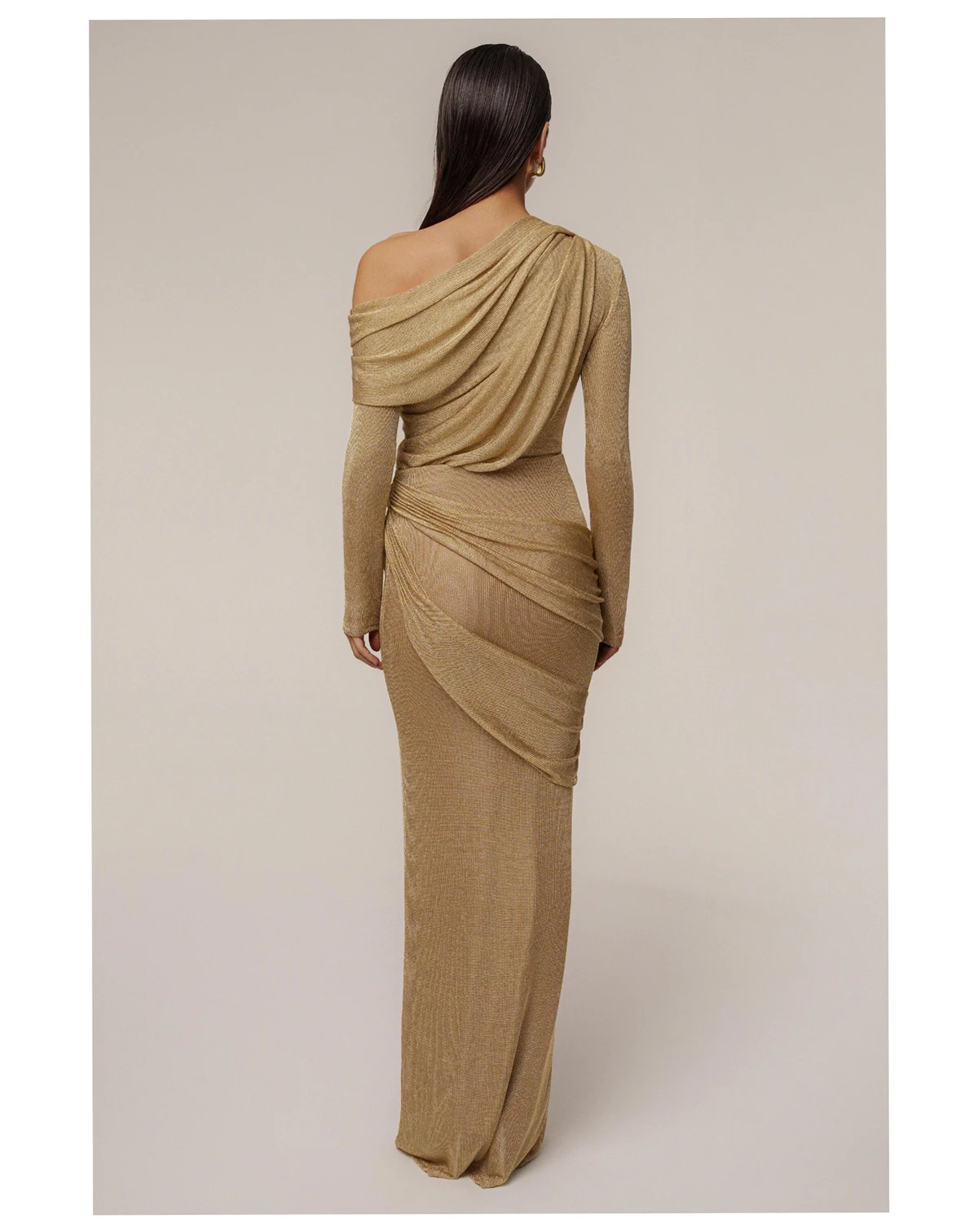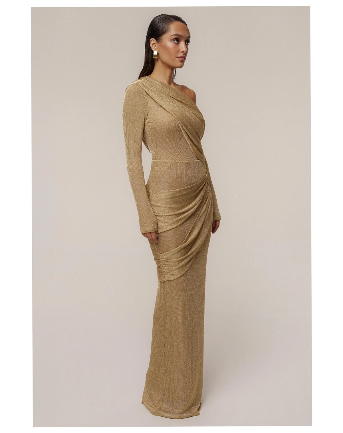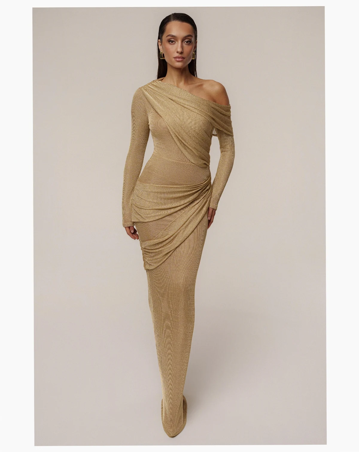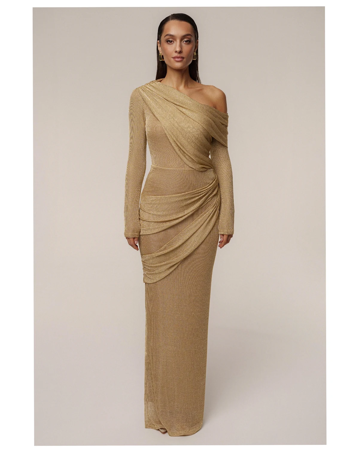 Our new Gold Opulent Metallic Bodysuit radiates glamour and sophistication. Designed in a luxurious metallic finish, this off-the-shoulder bodysuit features a draped, crossover neckline that exudes elegance. The long sleeves and fitted silhouette create a sleek and flattering look, perfect for evening events or upscale parties. Secured with a thong-style double snap closure. Double-lined. Stretchy. Not sold as set.