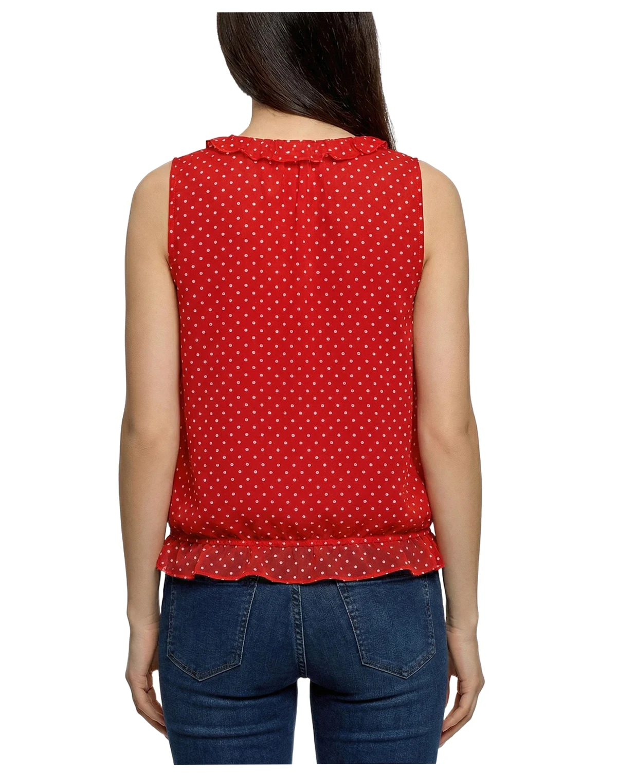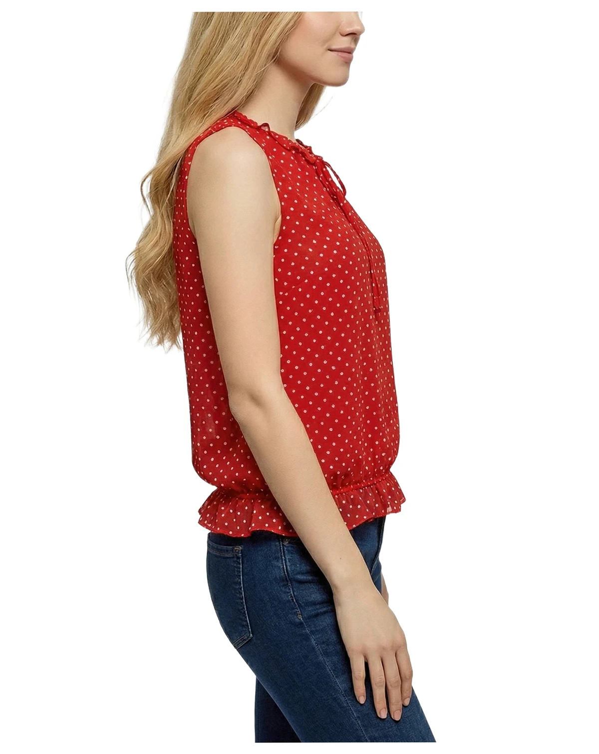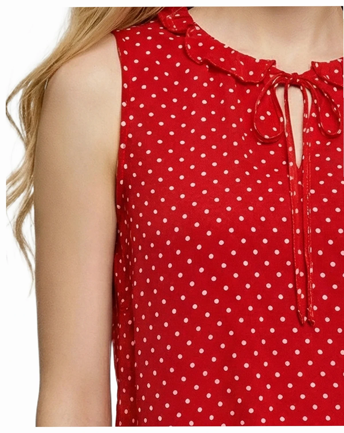 This sleeveless NY Collection blouse features a playful polka-dot print with a feminine ruffled neckline and adjustable tie-front detail. Finished with a softly ruffled hem, it offers a flattering, lightweight look that's easy to dress up or down.