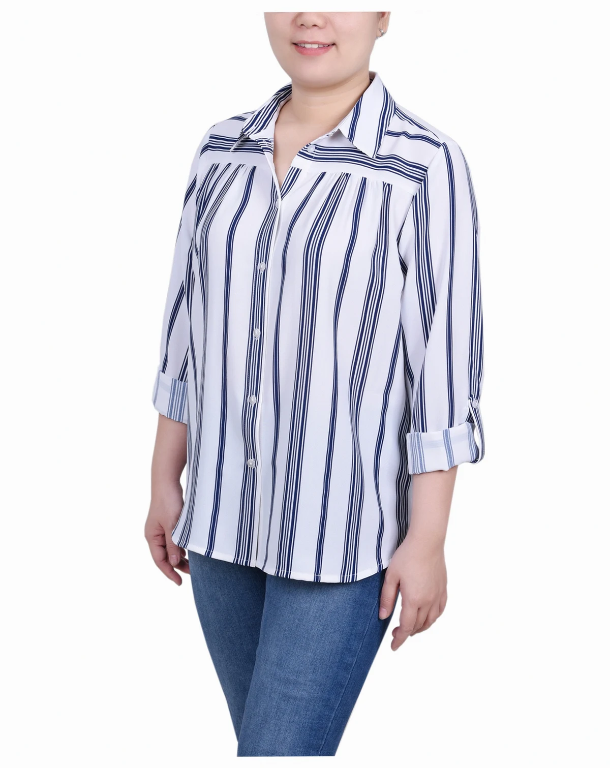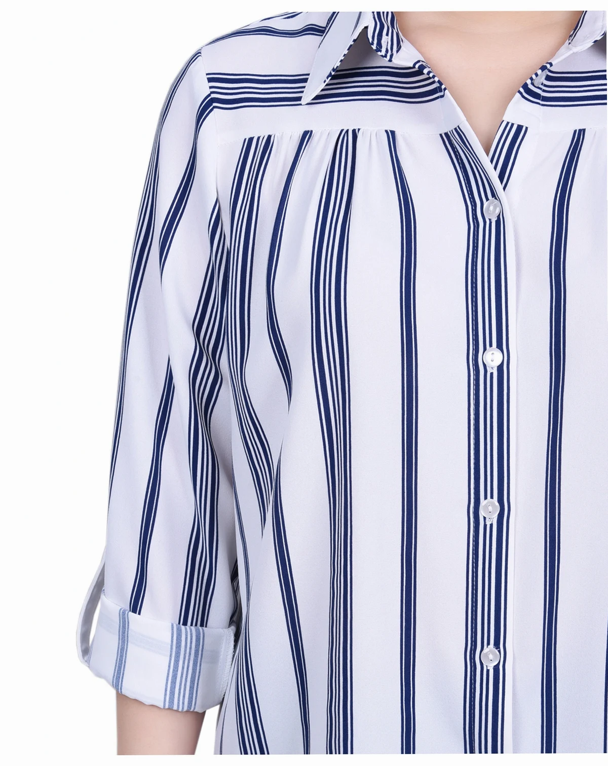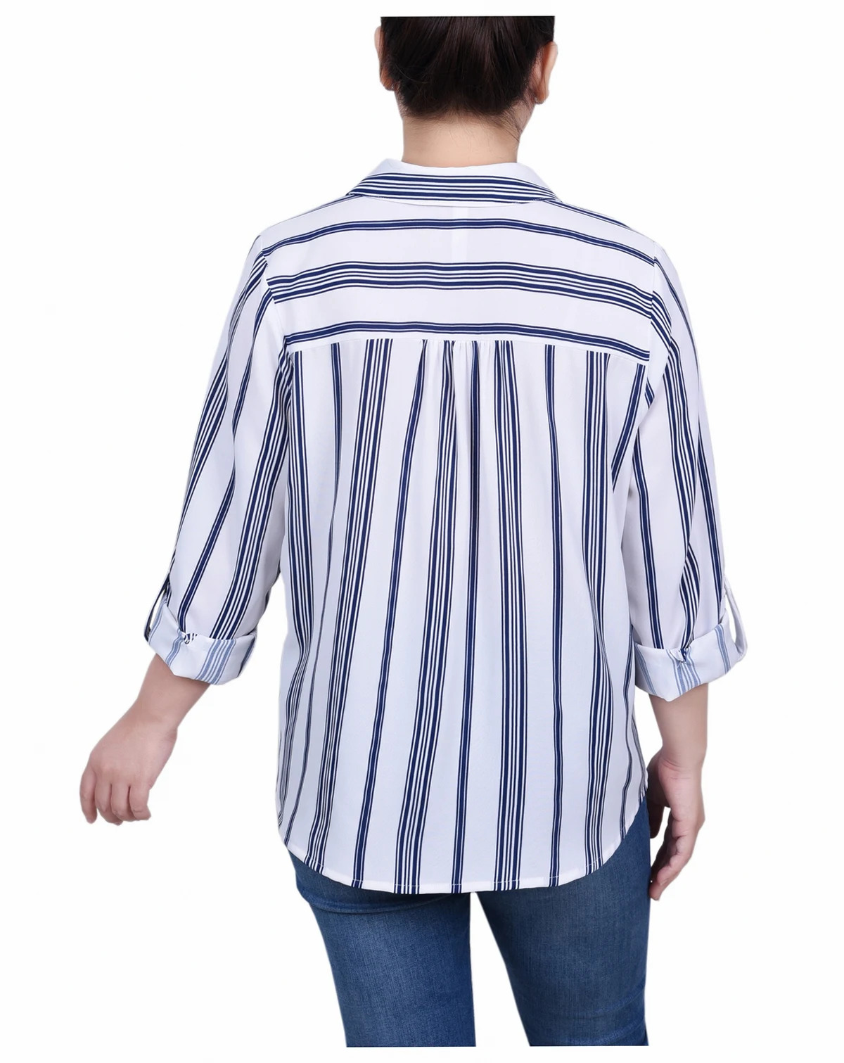 This long roll tab sleeve blouse is perfect for any modern woman. Crafted with slightly textured fabric, the blouse features a point collar, yoke with gathers, long roll tab sleeves, and a rounded hemline for a timeless style. The stripe pattern brings flair to the timeless silhouette.