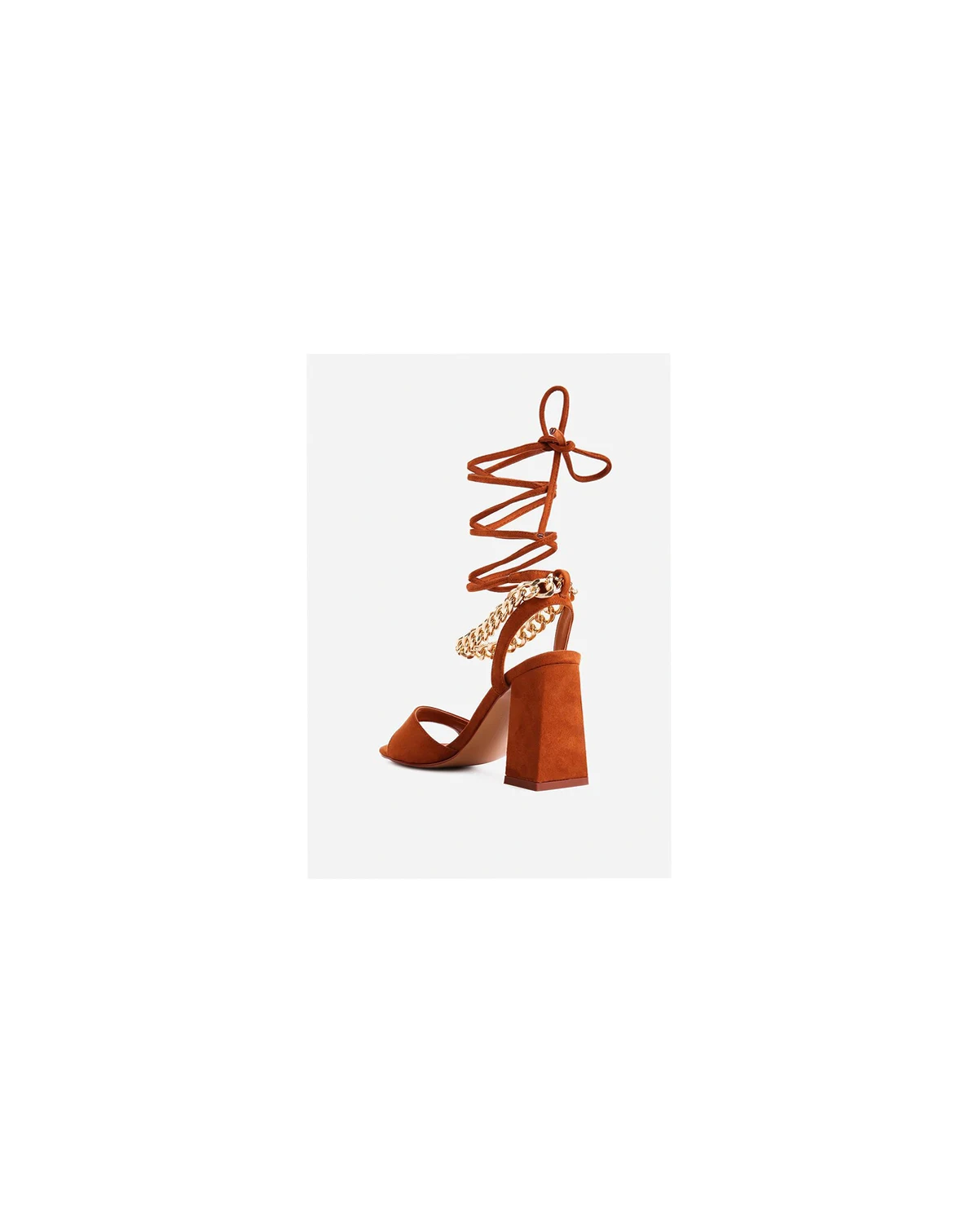 The triangular block heel sandals have a tie-up detail that makes them sexy and sleek, while the metal chain detail adds a fun aesthetic element to the strap. The thick block heels and cushion padded insole make the sandals comfortable to wear. These are perfect as party shoes, wedding guest shoes, bridal shoes, and much more. Type: Lace-Up Sandals Outer Material: Micro Suede Light Cushion Insoles Outer sole: TPR Open Round Toe Lace-Up Style Metal Chain Link Ankle Strap Triangular Block Heels SH3029