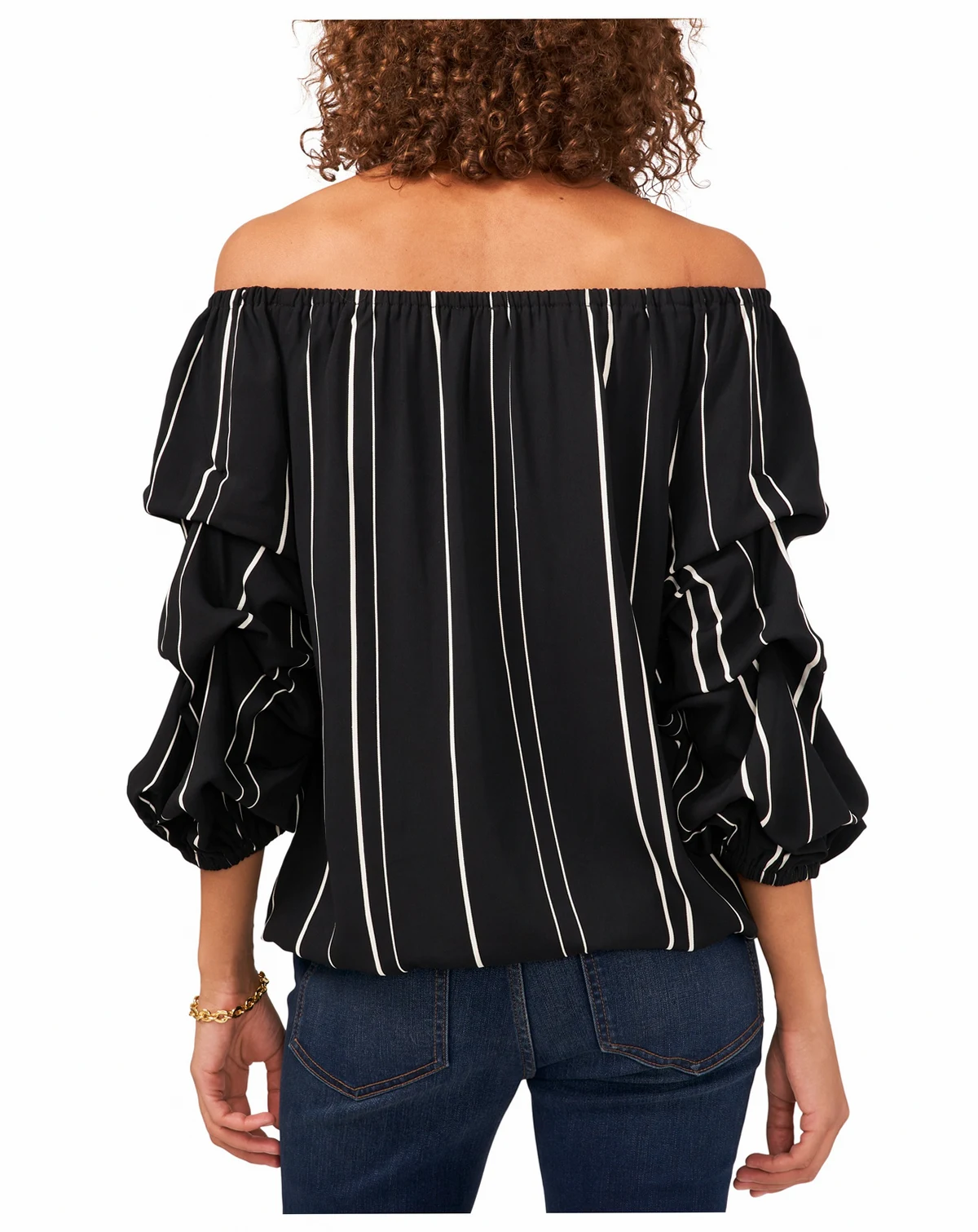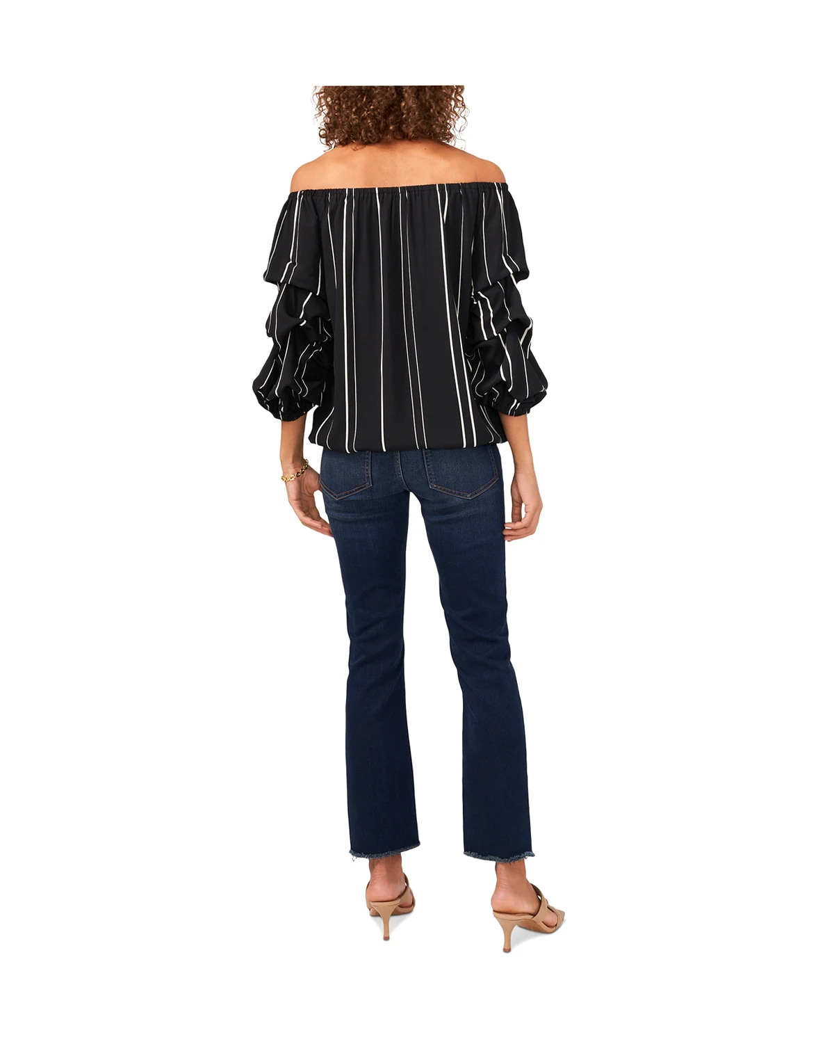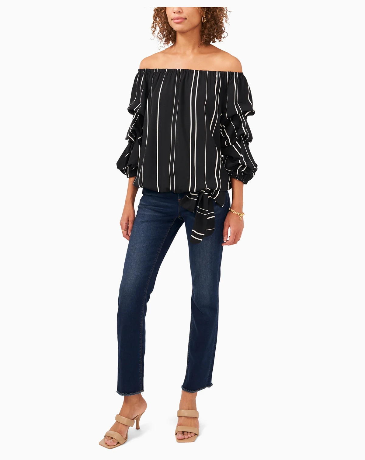 This Vince Camuto off-the-shoulder blouse brings effortless style to any season with its bubble hem silhouette and playful tie-front detail. The 3/4-length sleeves strike the perfect balance between relaxed and refined, making it a go-to for casual outings or dressed-up plans. Easy to layer or wear on its own, this blouse pairs beautifully with anything from denim to tailored trousers. ABOUT THE BRAND: Vince Camuto is a globally renowned brand that embodies European styling. Detailed craftsmanship across the line embraces current trends while maintaining a classic aesthetic.