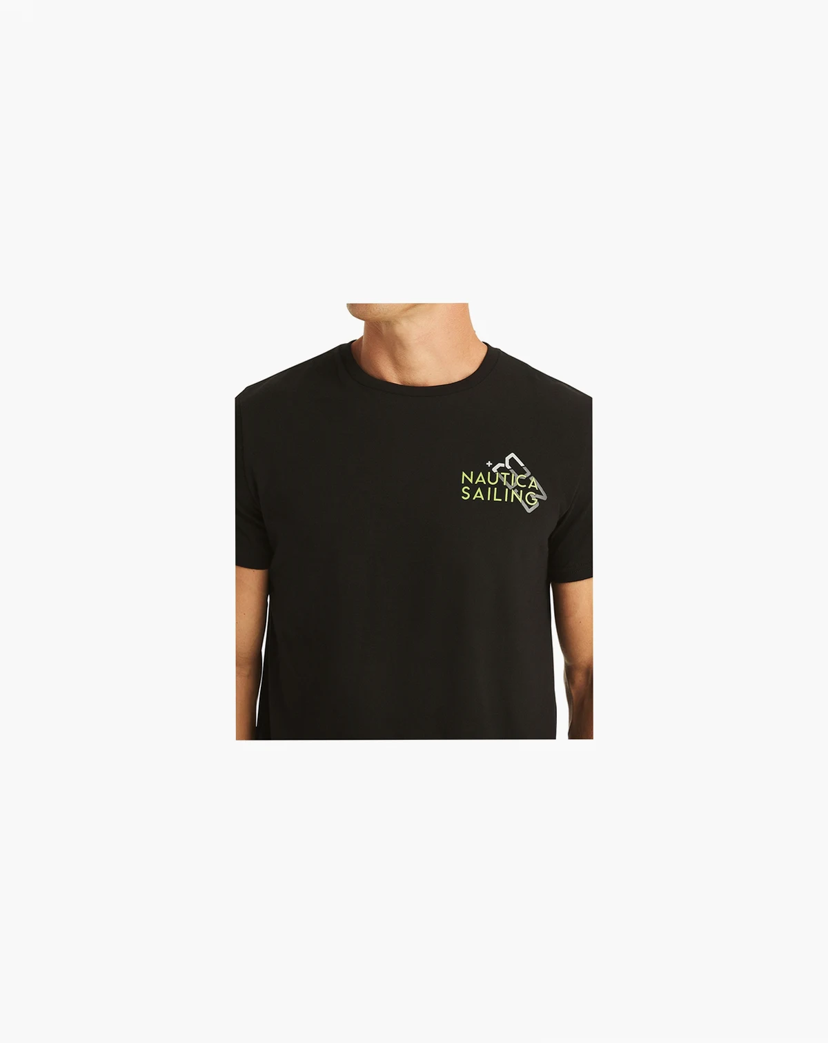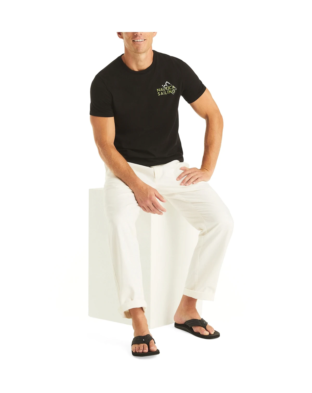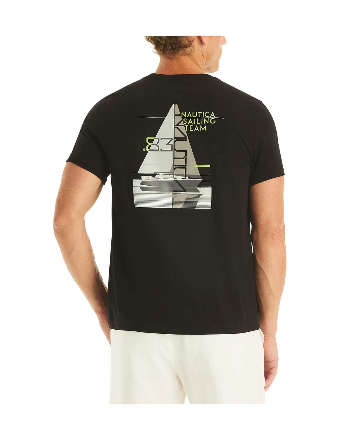 Showcasing a sailboat print on the back, this T-shirt from Nautica features a crewneck and short sleeves. The classic fit and soft jersey fabrication provide comfortable, casual wear.