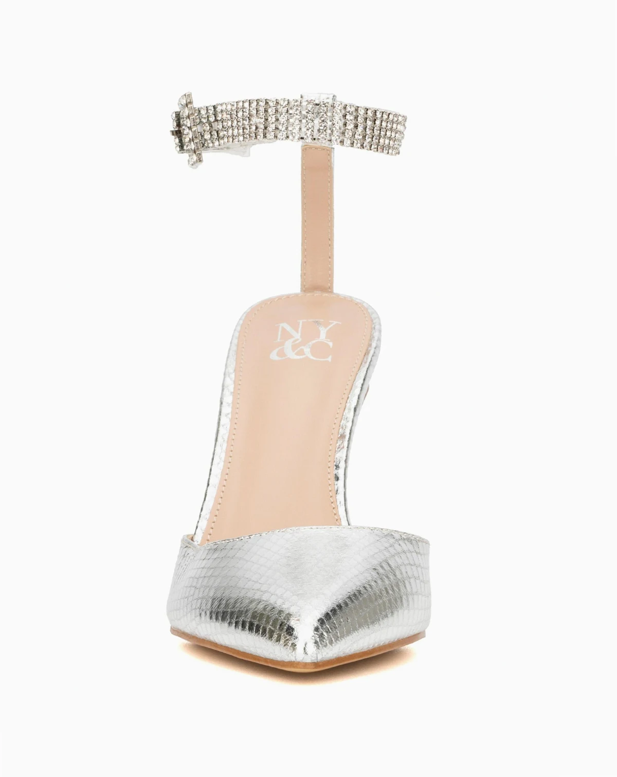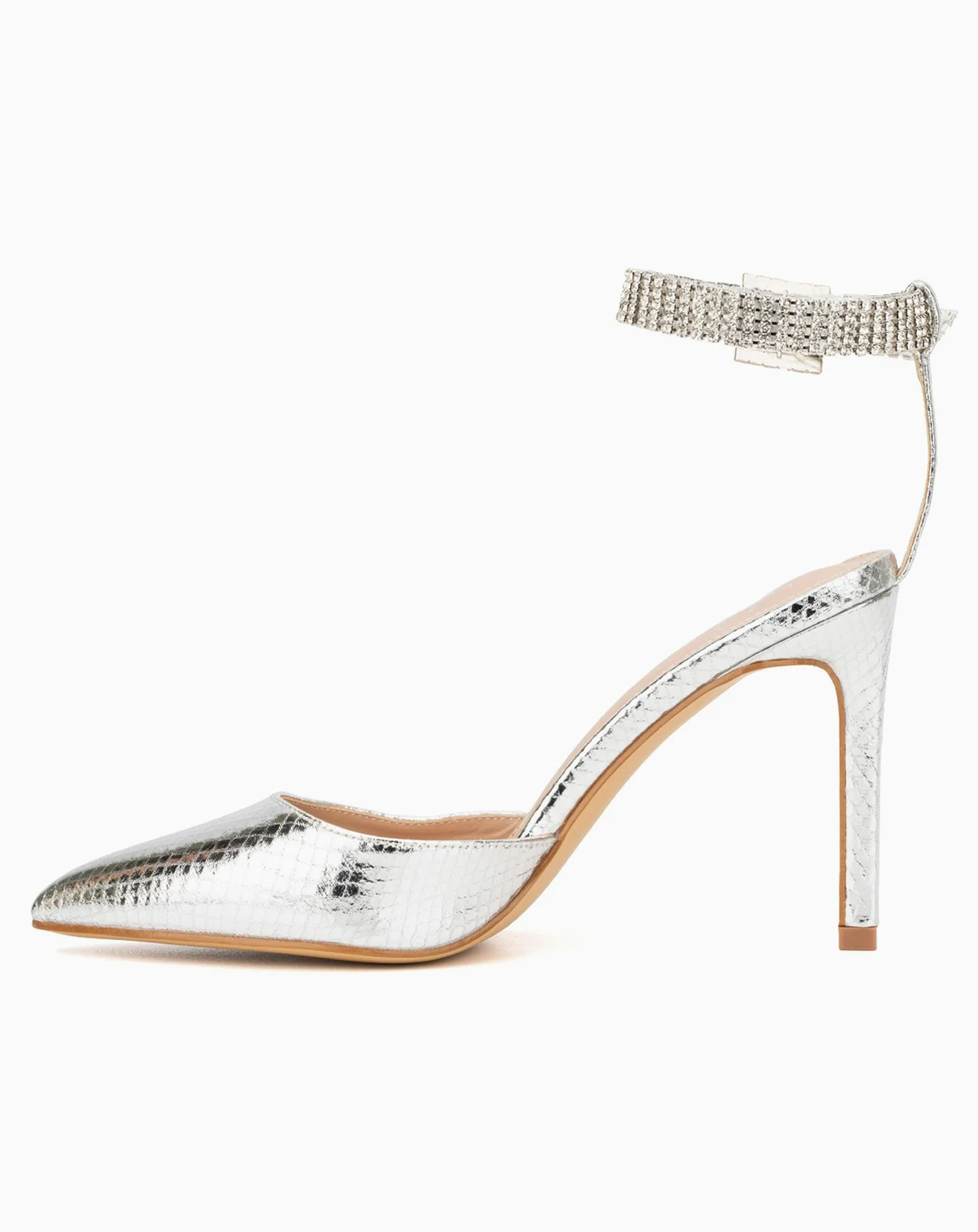 Brighten up the room with the ankle strap Mallory heels. Pointed toe, shiny upper, and stiletto heel.