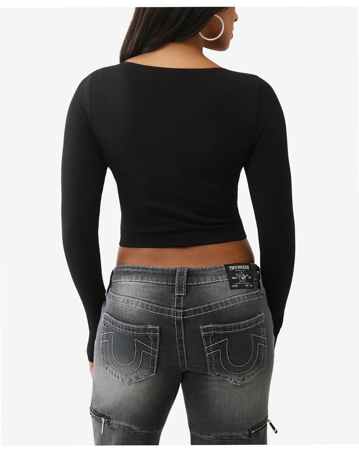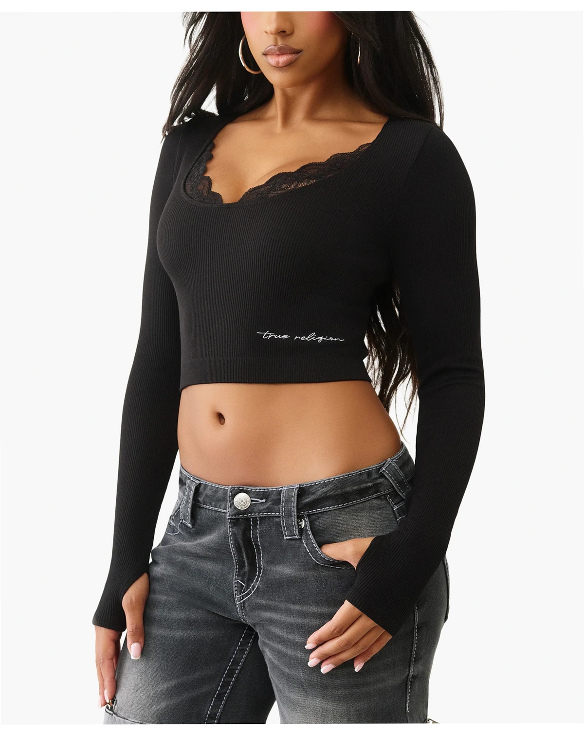 Crafted in a comfortable seamless knit, this women's long sleeve top features a scooped neckline detailed with lace trim and is finished with an embroidered horseshoe logo design at the chest.