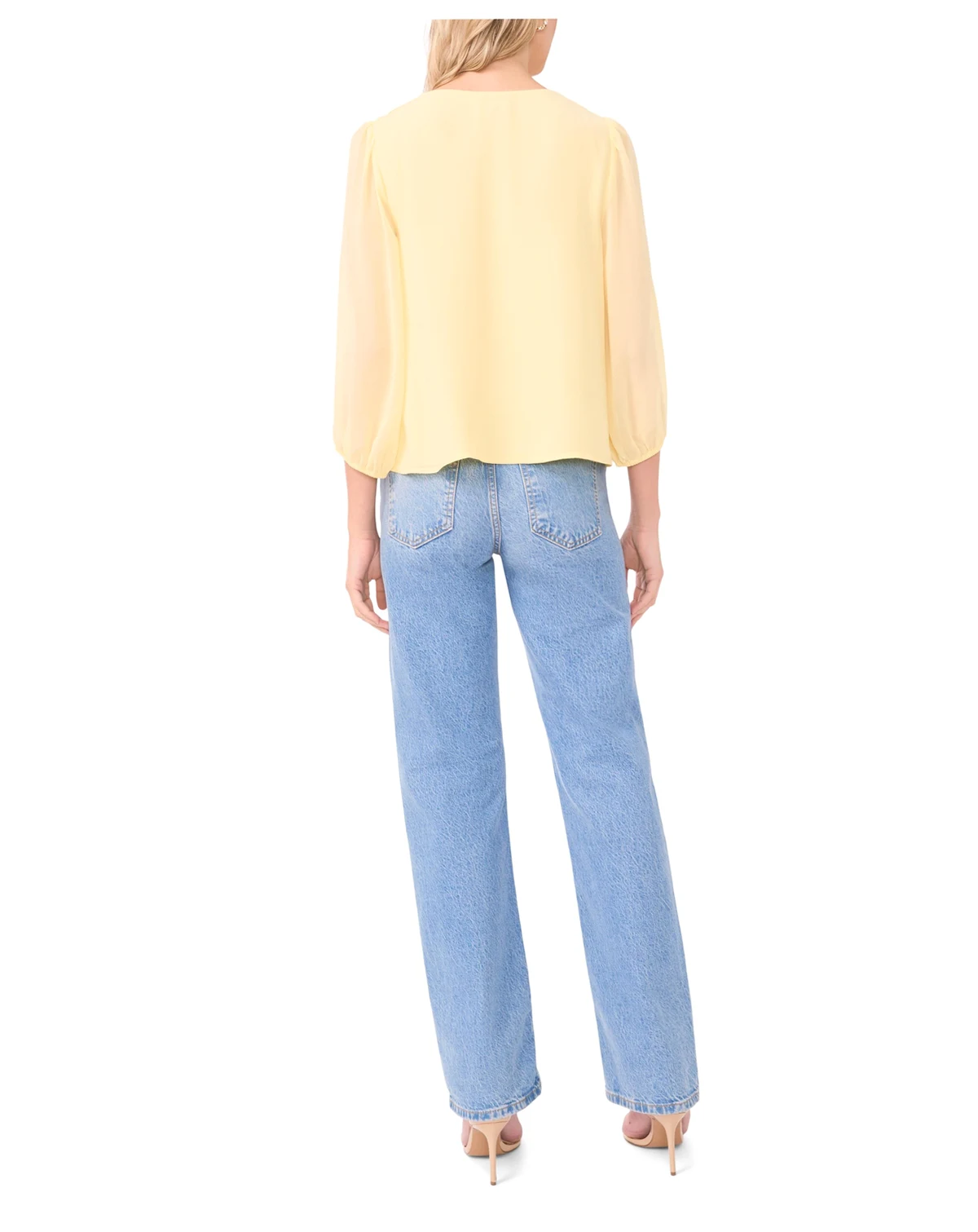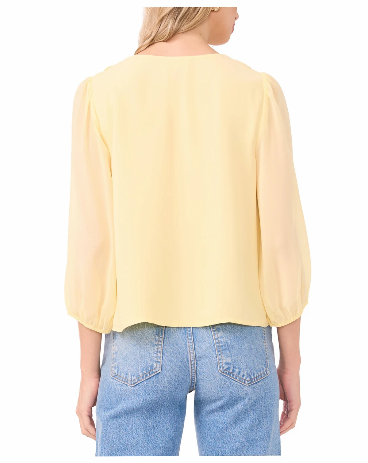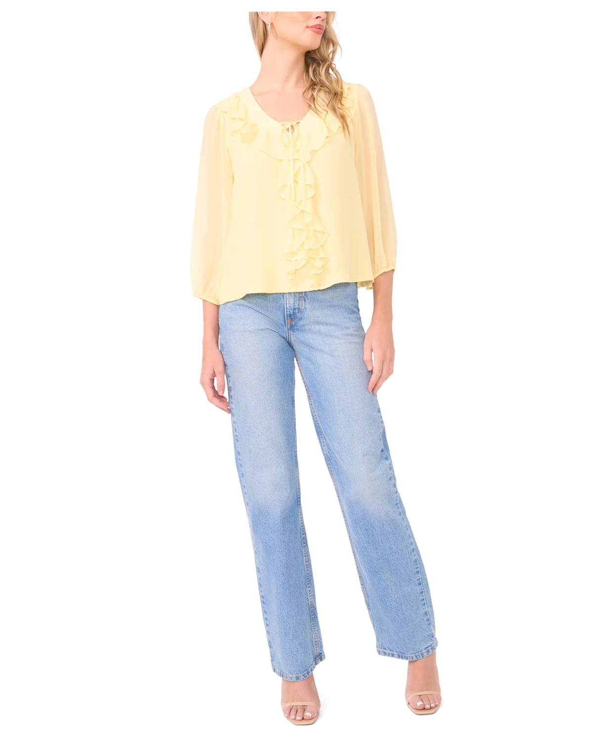 Soft femininity shines in this Vince Camuto blouse, showcasing double ruffles with shirring down the center front. A V-neckline and 3/4-sleeves add polished elegance to the design. ABOUT THE BRAND: Vince Camuto is a globally renowned brand that embodies European styling. Detailed craftsmanship across the line embraces current trends while maintaining a classic aesthetic.