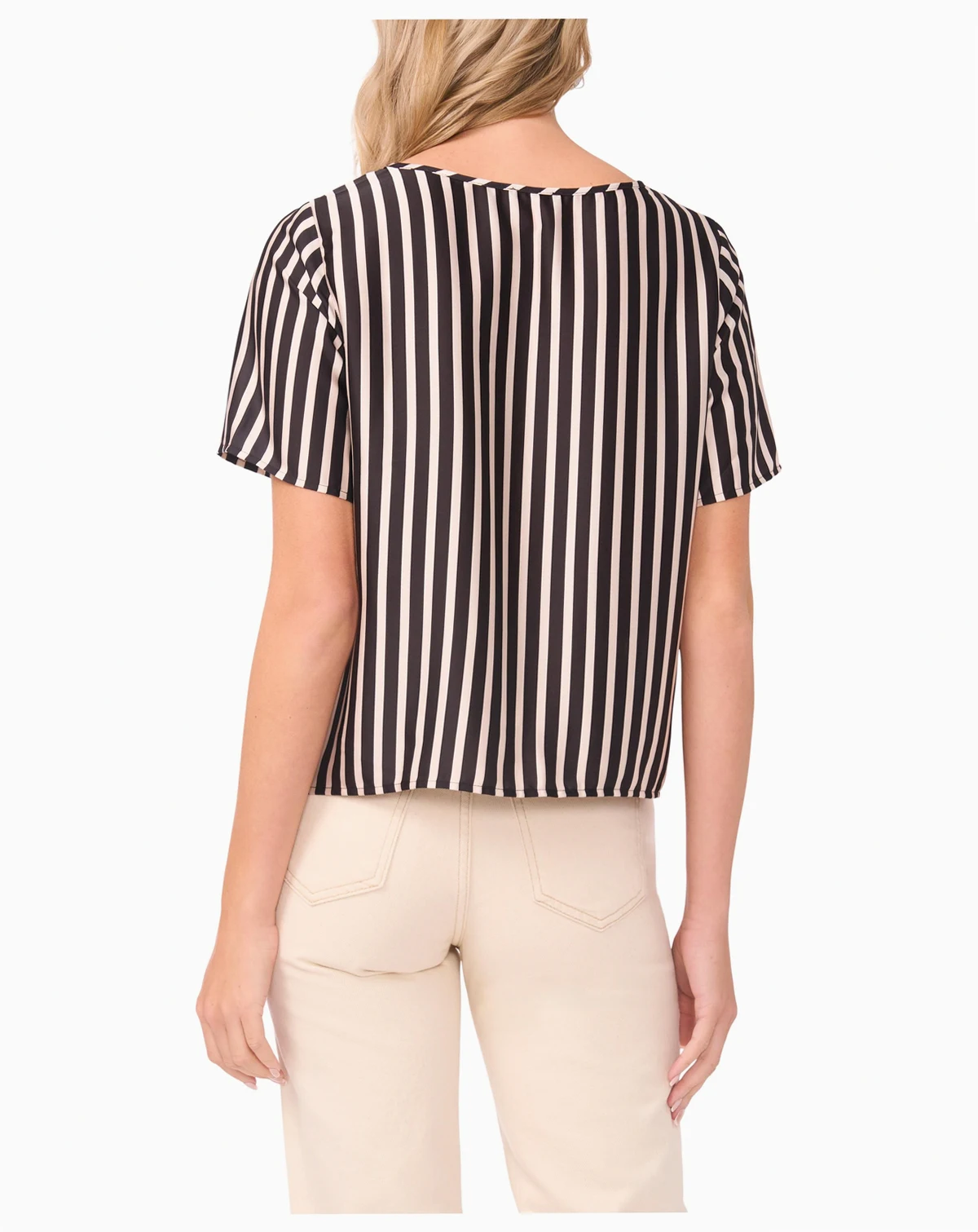 Presenting a cropped silhouette, this Vince Camuto blouse features a crew neckline and short sleeves for a modern look. The relaxed shape offers a casual, contemporary style. ABOUT THE BRAND: Vince Camuto is a globally renowned brand that embodies European styling. Detailed craftsmanship across the line embraces current trends while maintaining a classic aesthetic.