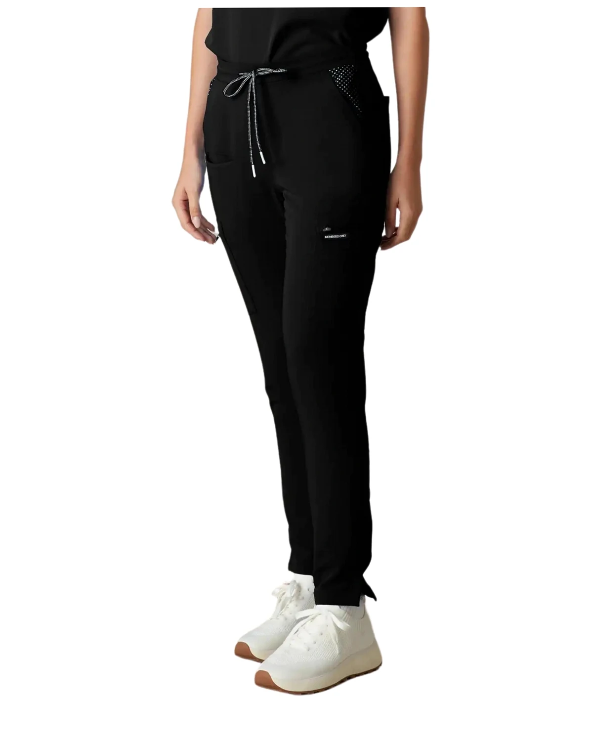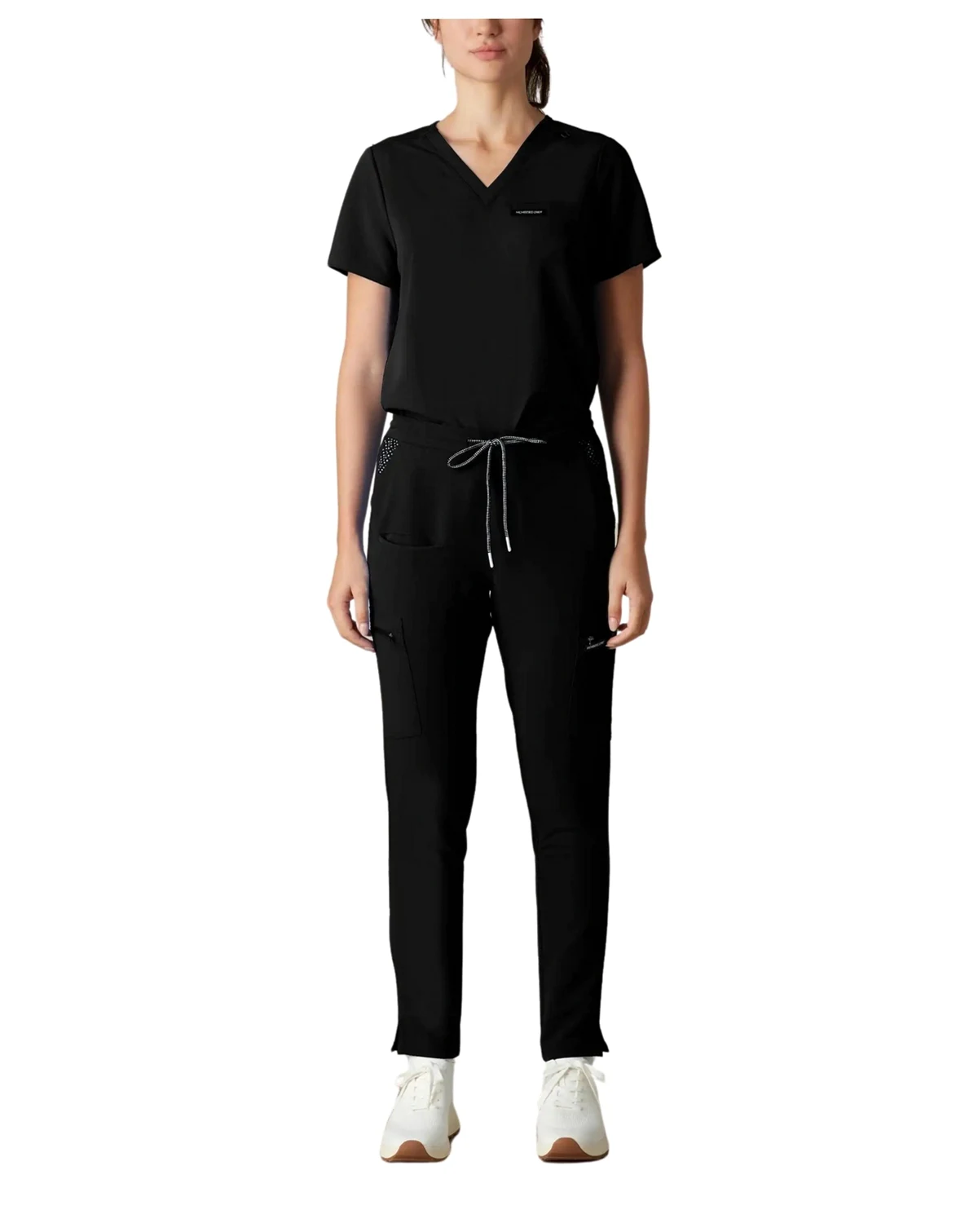 The Reus Open Bottom Scrub Pants are a women's scrub pants with a modern fit and a comfortable, four-way stretch fabric. The pants feature ten pockets, including two front slash pockets, two back pockets, two cargo pockets, and four open-bottom pockets at the ankle.