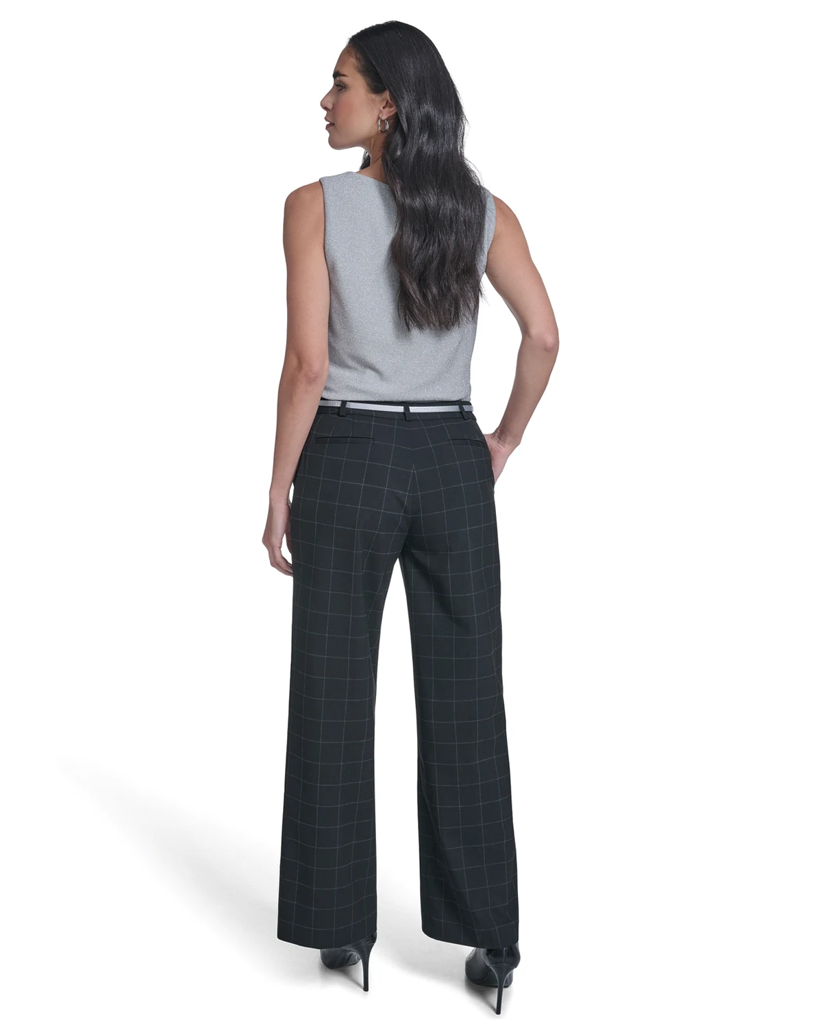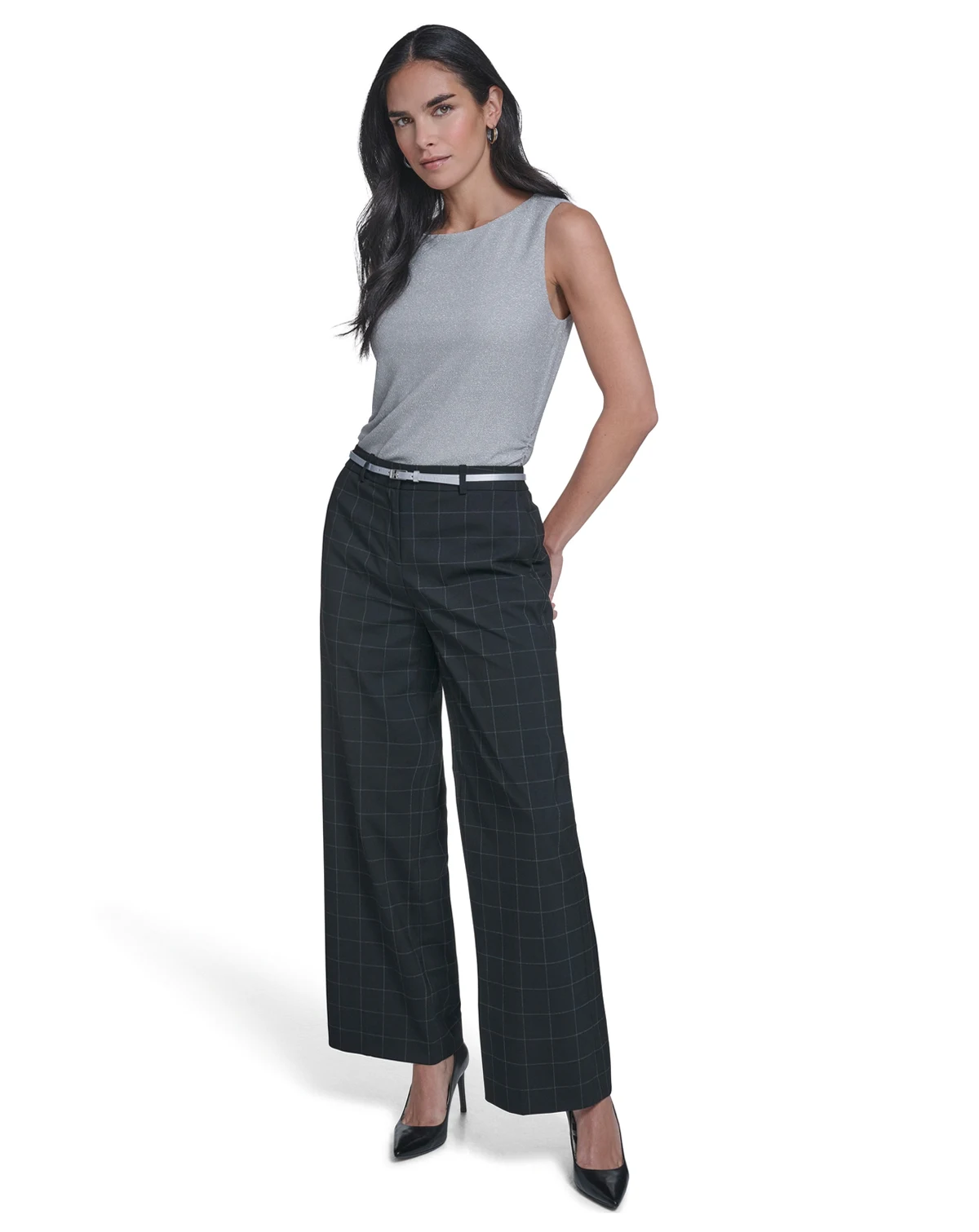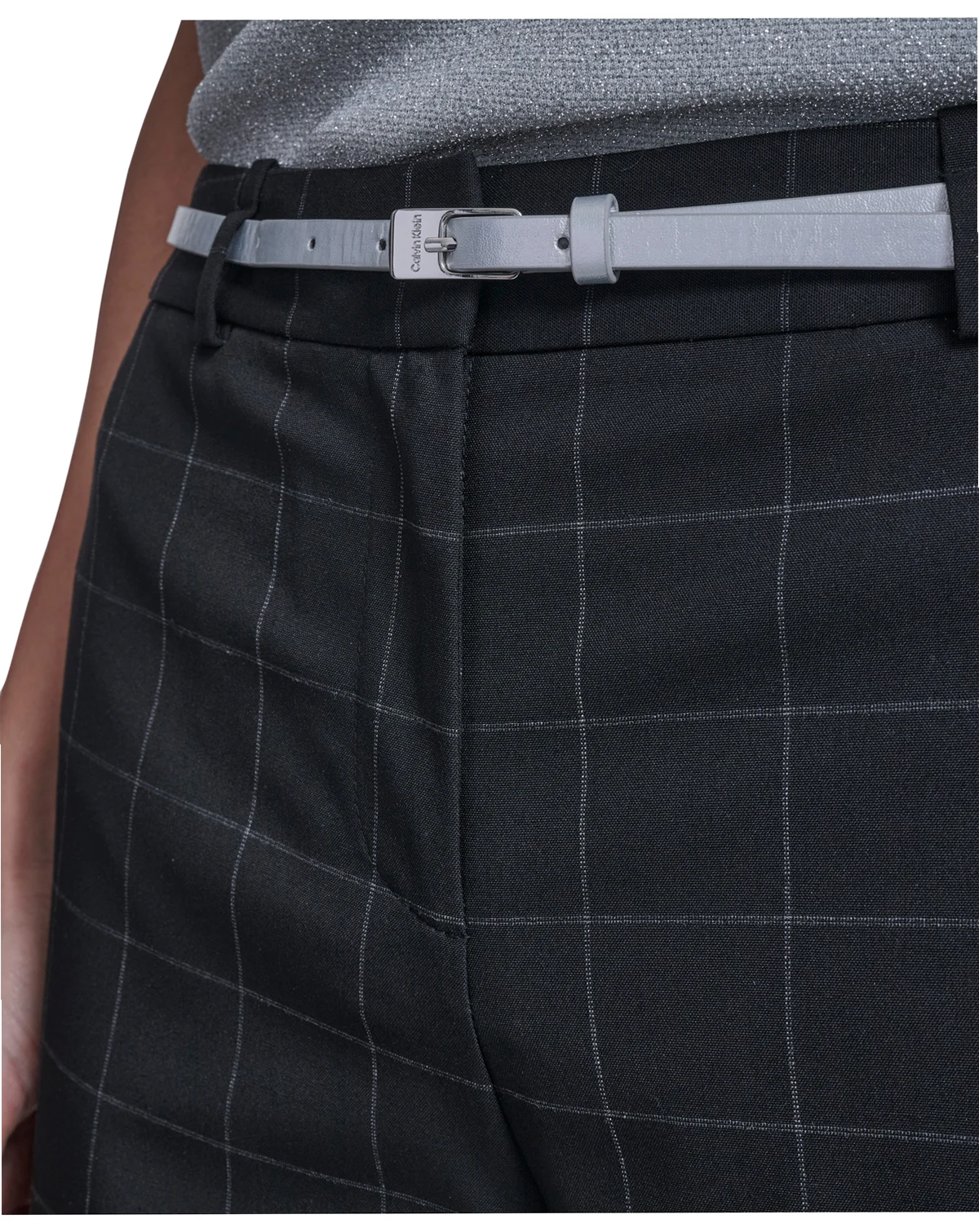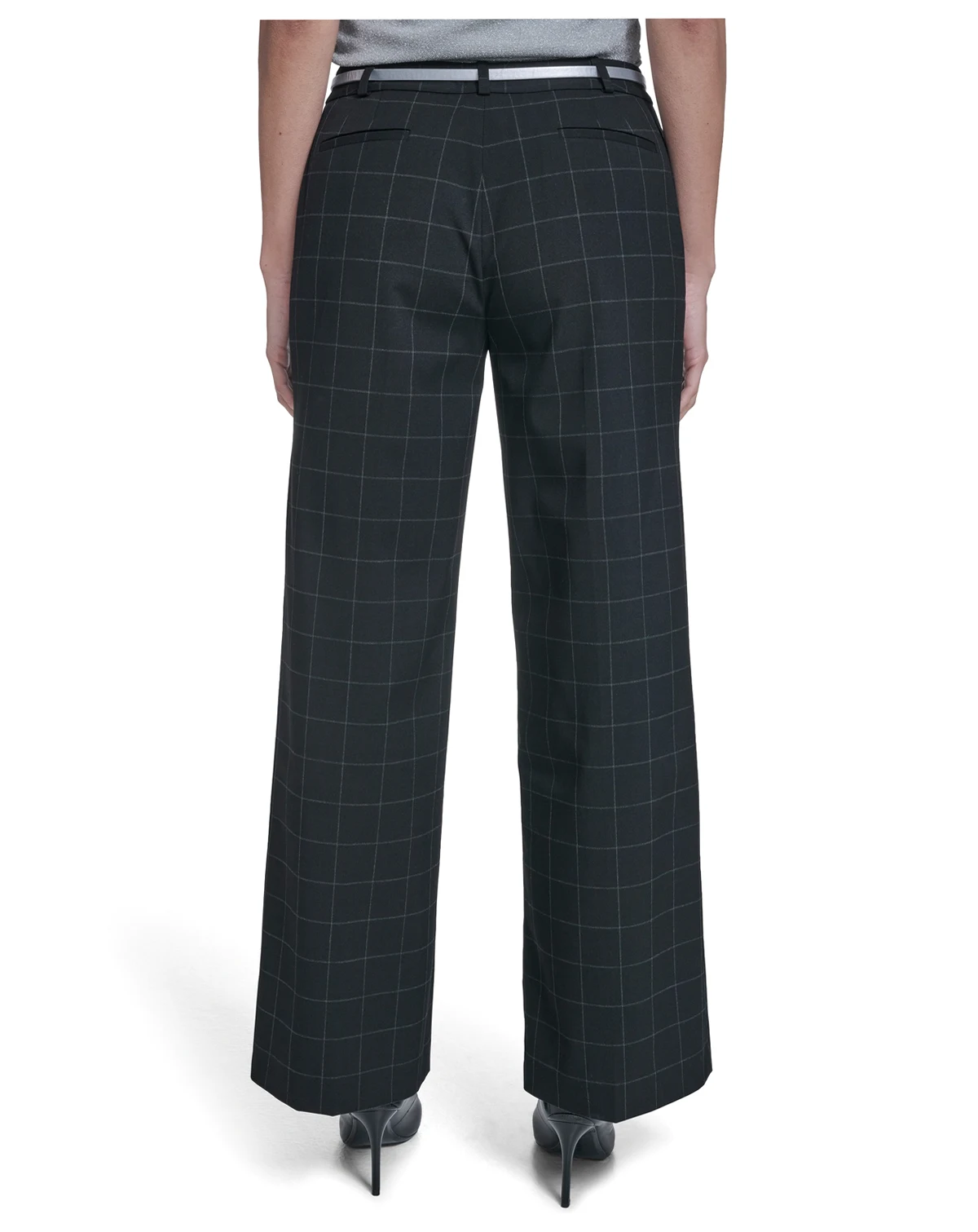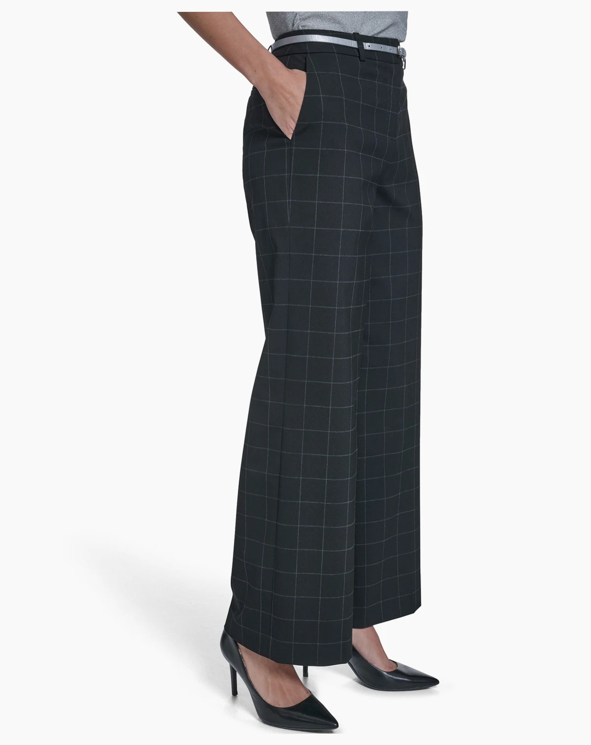 Featuring a windowpane pattern and wide leg design, these pants from Calvin Klein include multiple front and back pockets. Belt loops and a mid-rise waist create a versatile, tailored look.