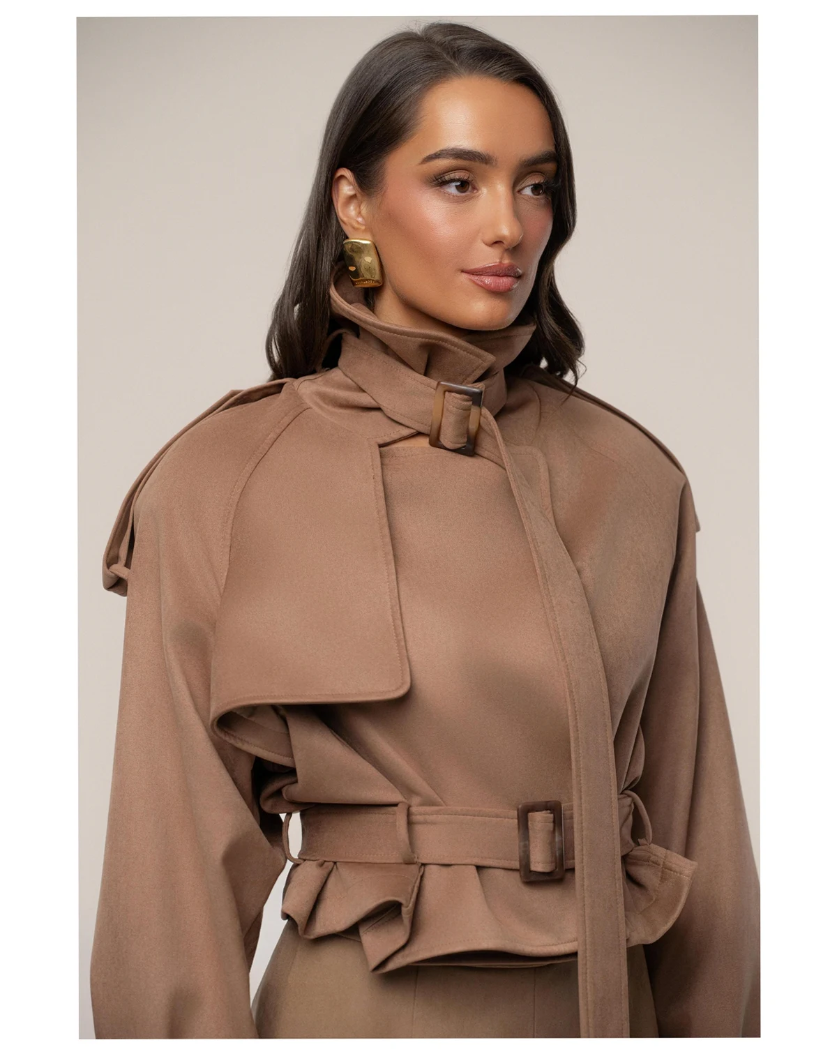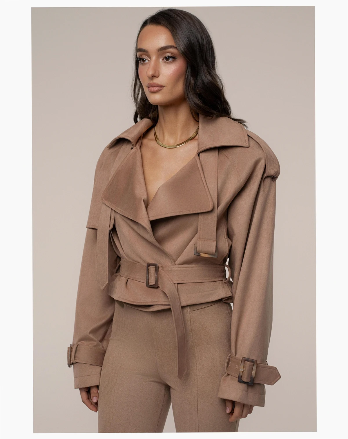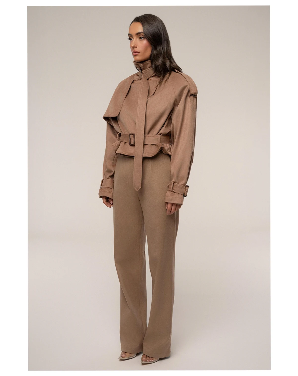 Our Latte Cropped Jacket is a chic and versatile outerwear piece. Crafted in a soft, suede-like fabric, this jacket features a wide notched lapel and classic double-breasted design. The cinched waist with a squared-buckle belt creates a flattering peplum effect, while the adjustable buckled cuffs add a modern edge. Finished with a cropped hem, shoulder epaulets, and a storm flap for extra style. Minimal stretch. Double-lined.