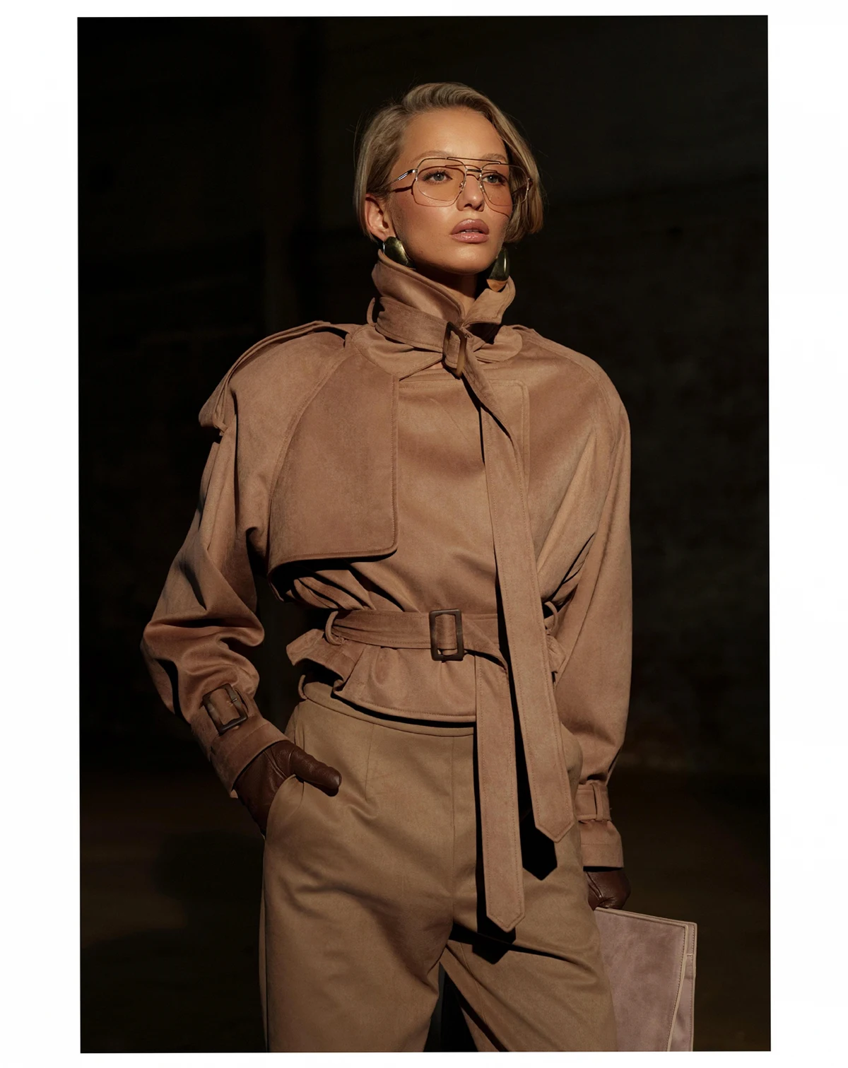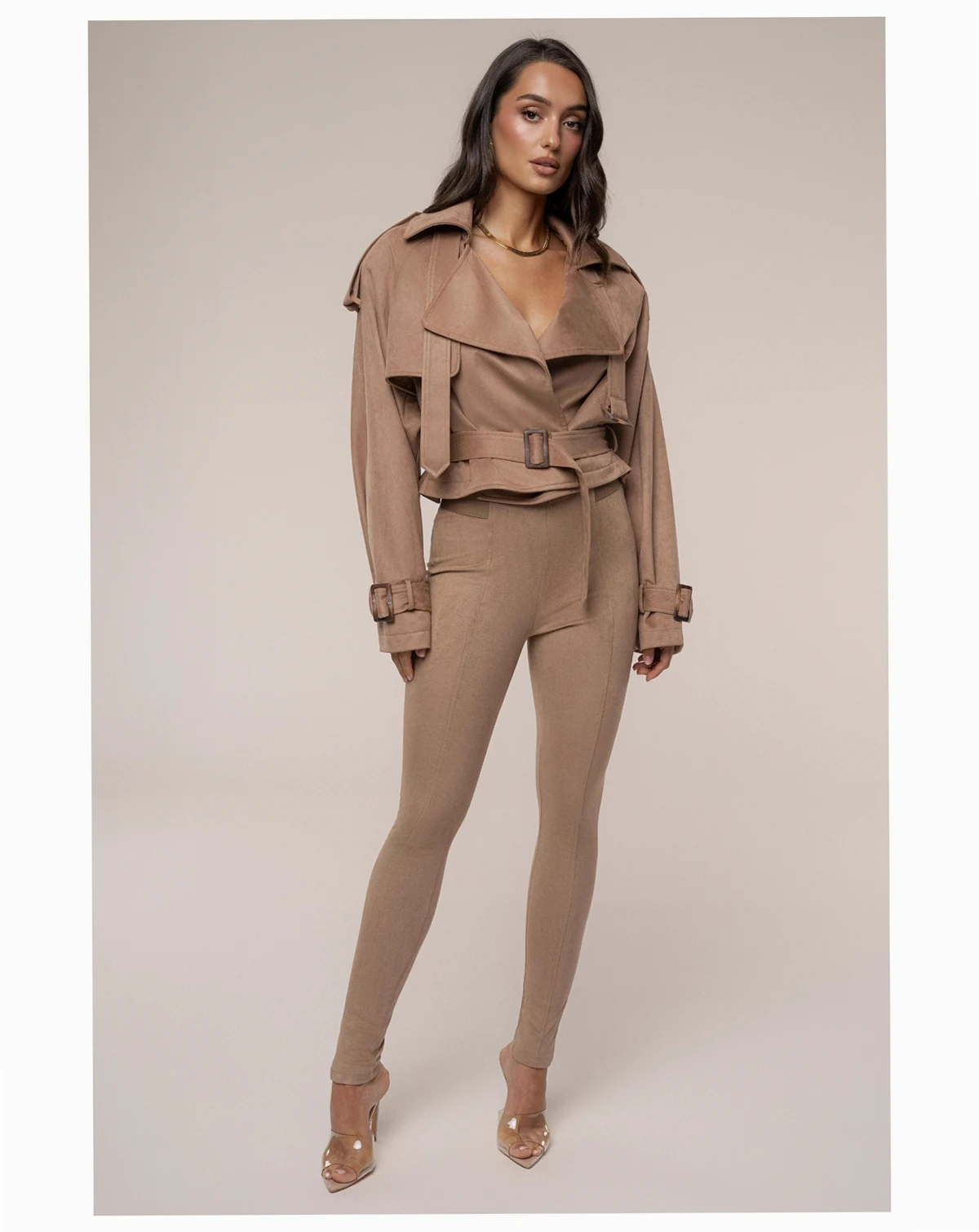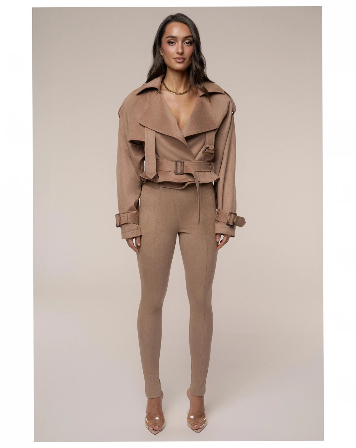 Our Latte Cropped Jacket is a chic and versatile outerwear piece. Crafted in a soft, suede-like fabric, this jacket features a wide notched lapel and classic double-breasted design. The cinched waist with a squared-buckle belt creates a flattering peplum effect, while the adjustable buckled cuffs add a modern edge. Finished with a cropped hem, shoulder epaulets, and a storm flap for extra style. Minimal stretch. Double-lined.