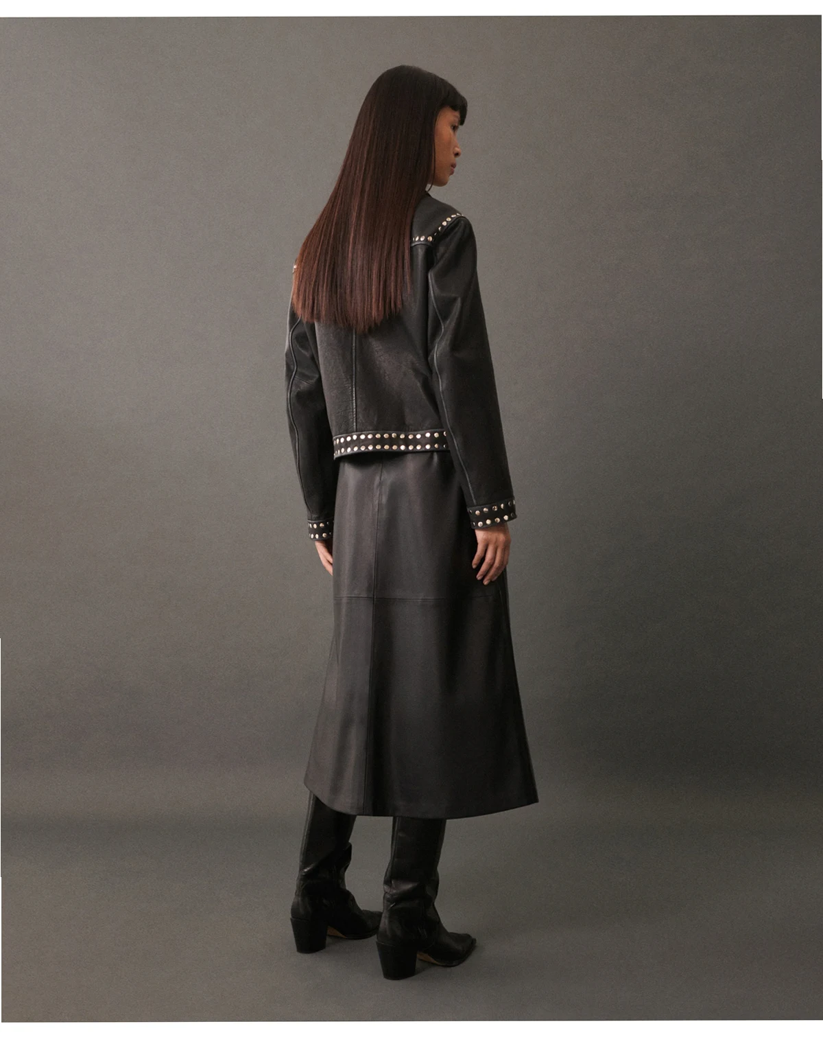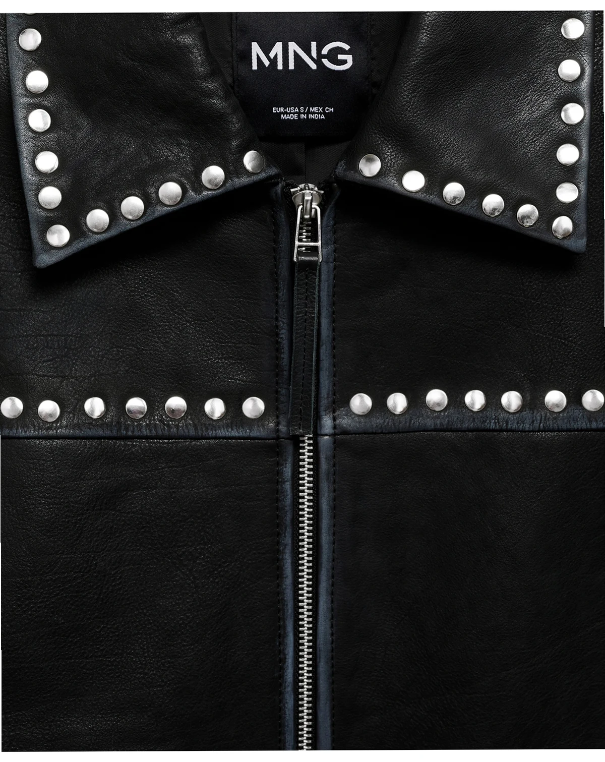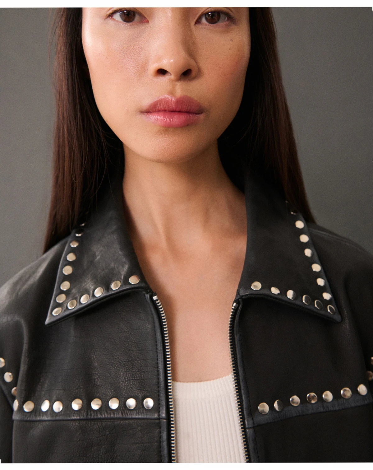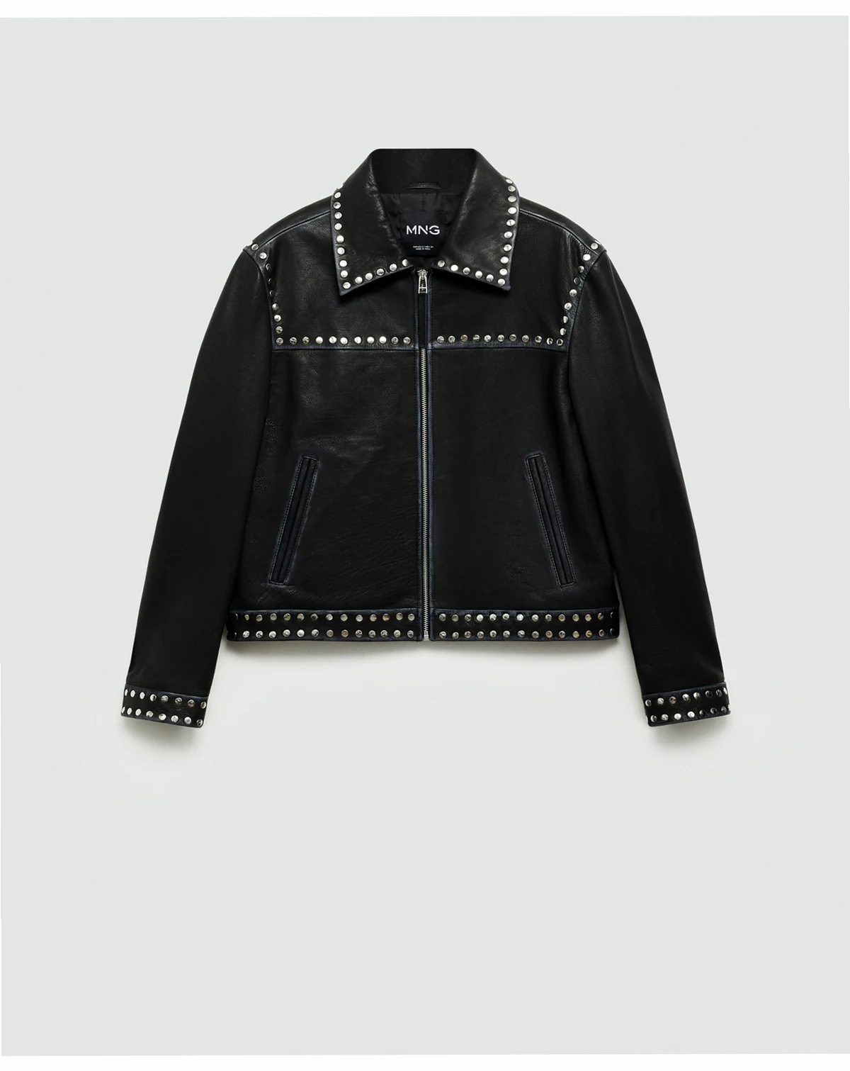 This bovine leather jacket features a straight design. It's fully lined for comfort, with two side pockets for convenience. Decorative studs add an edgy flair, while the front zipper closure ensures a sleek, stylish fit.