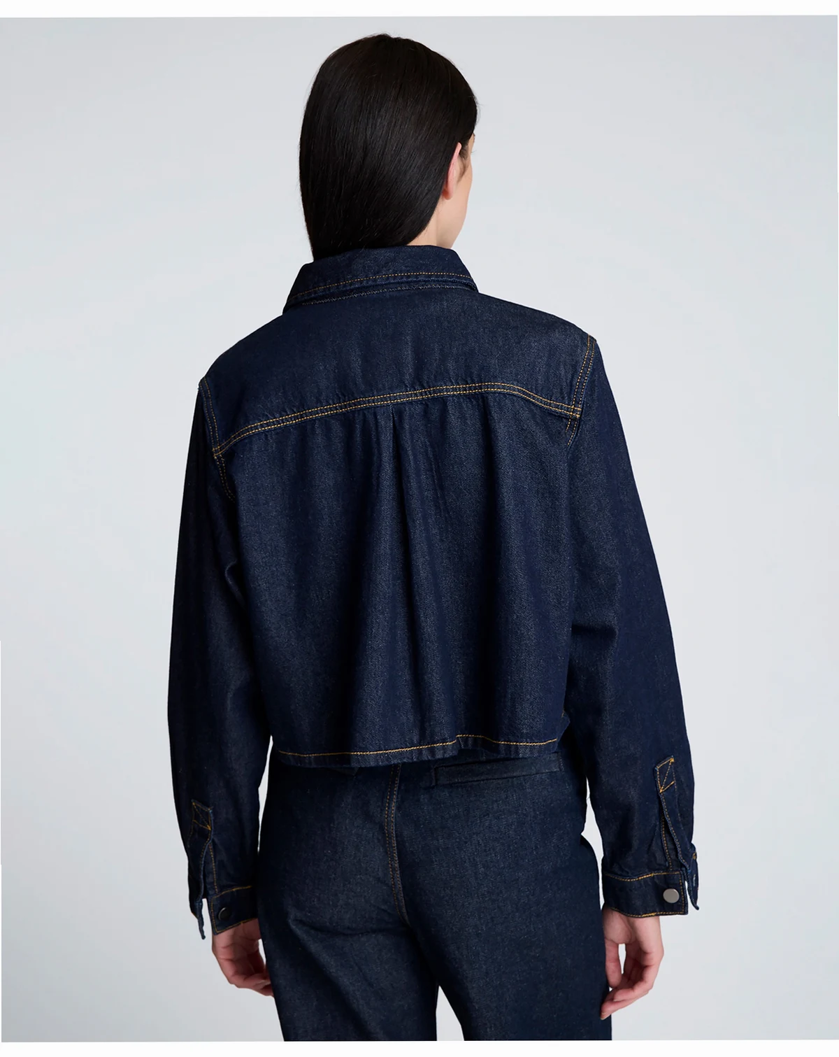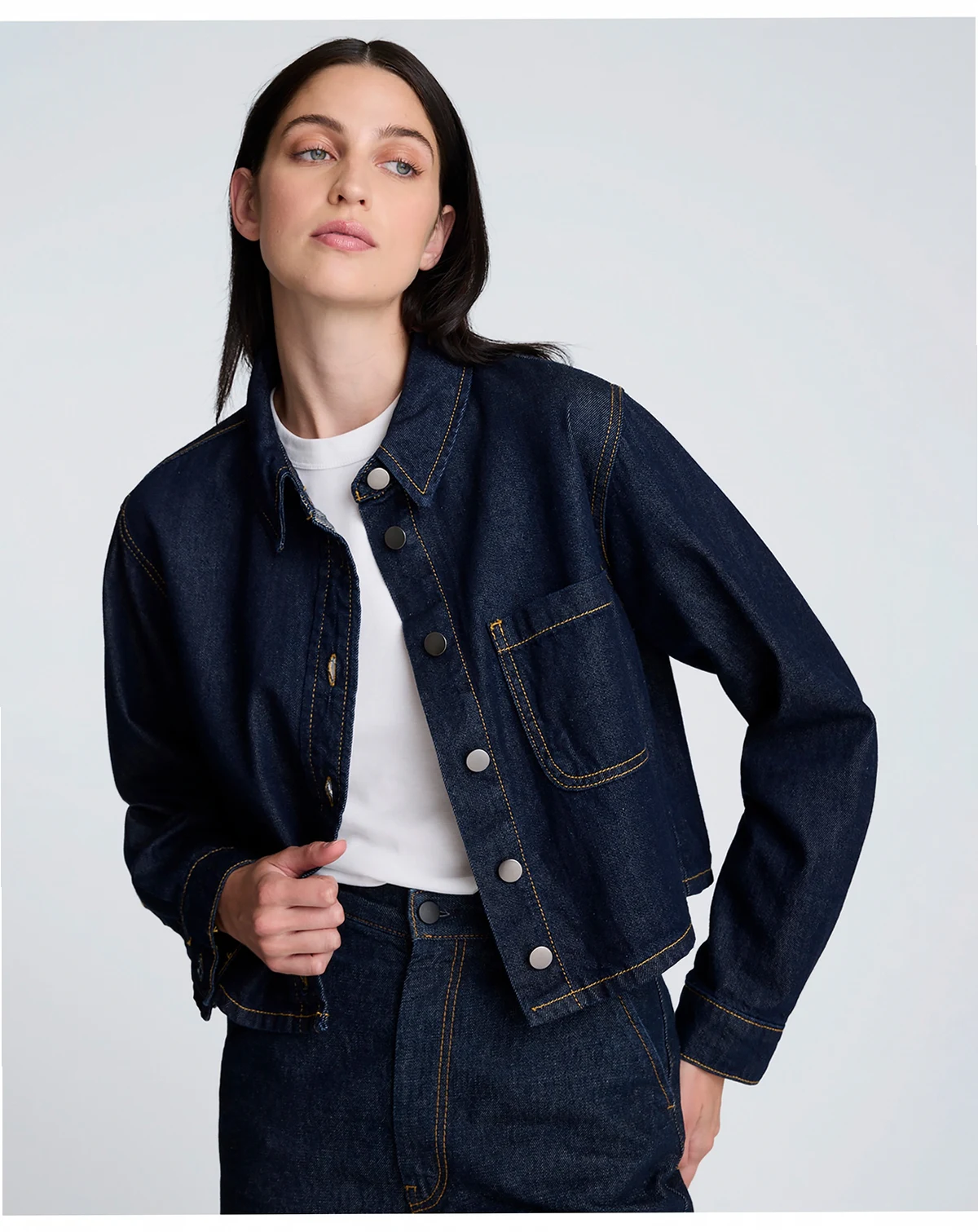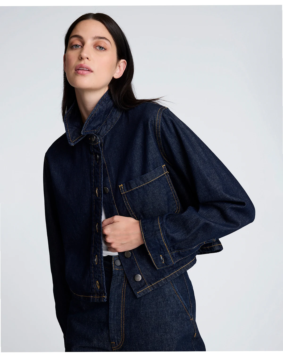 Rock a rugged chic look in this long-sleeve cropped jacket from Kenneth Cole. The rigid denim and chest pocket provide a structured, contemporary layer.