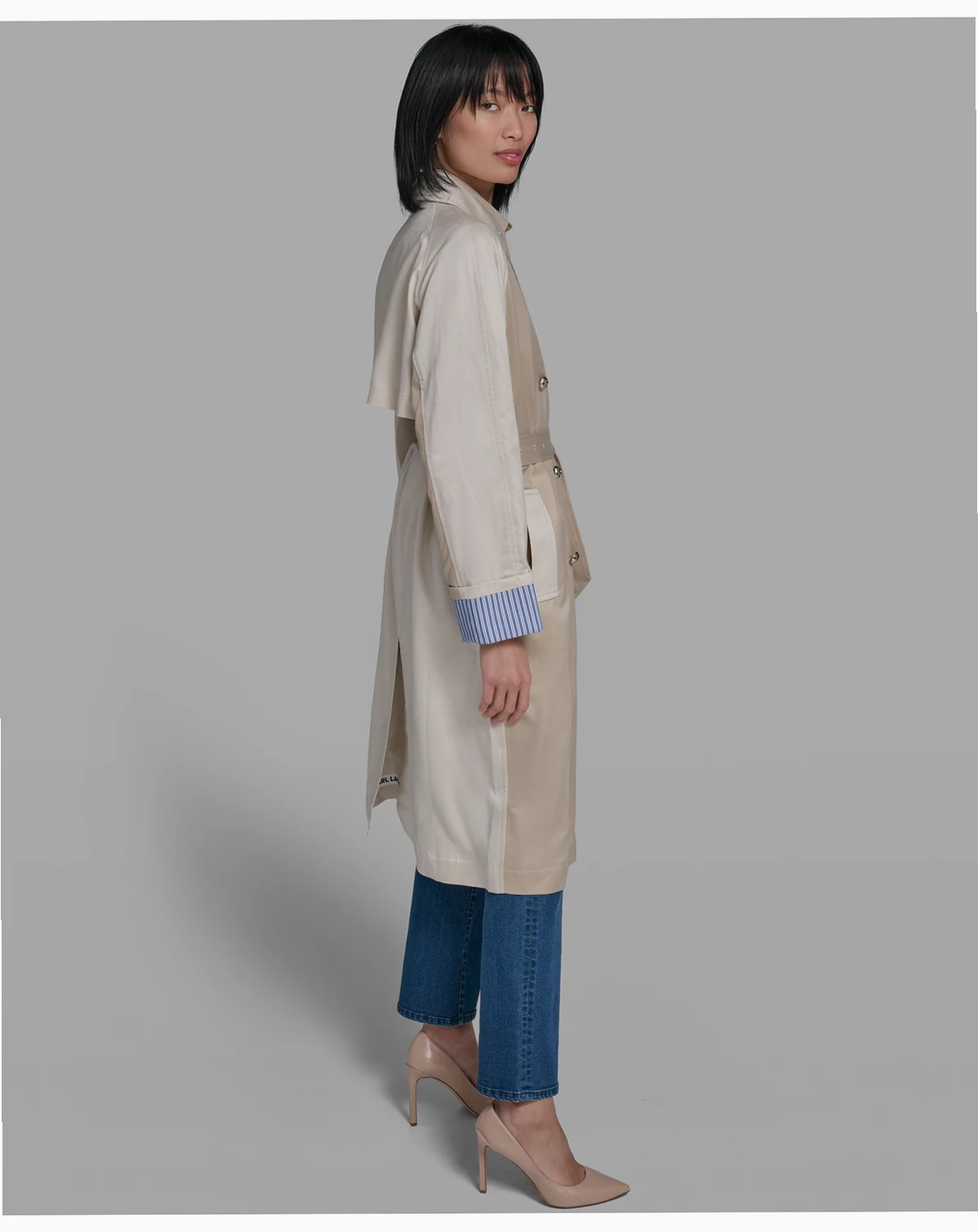 Striking color blocking brings modern edge to this trench coat by KARL LAGERFELD PARIS. A front button closure and functional pockets refine the silhouette with a sharp, tailored finish.