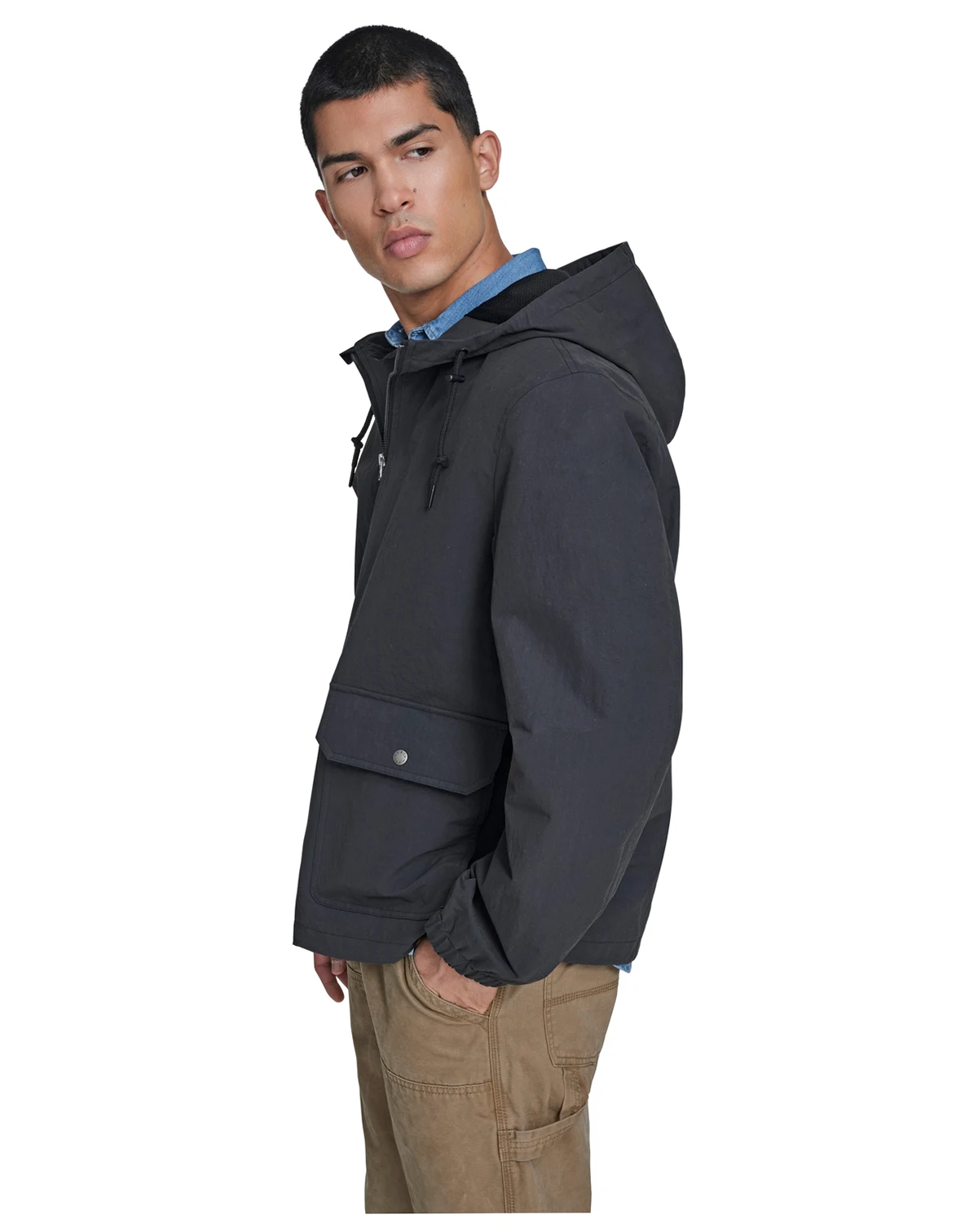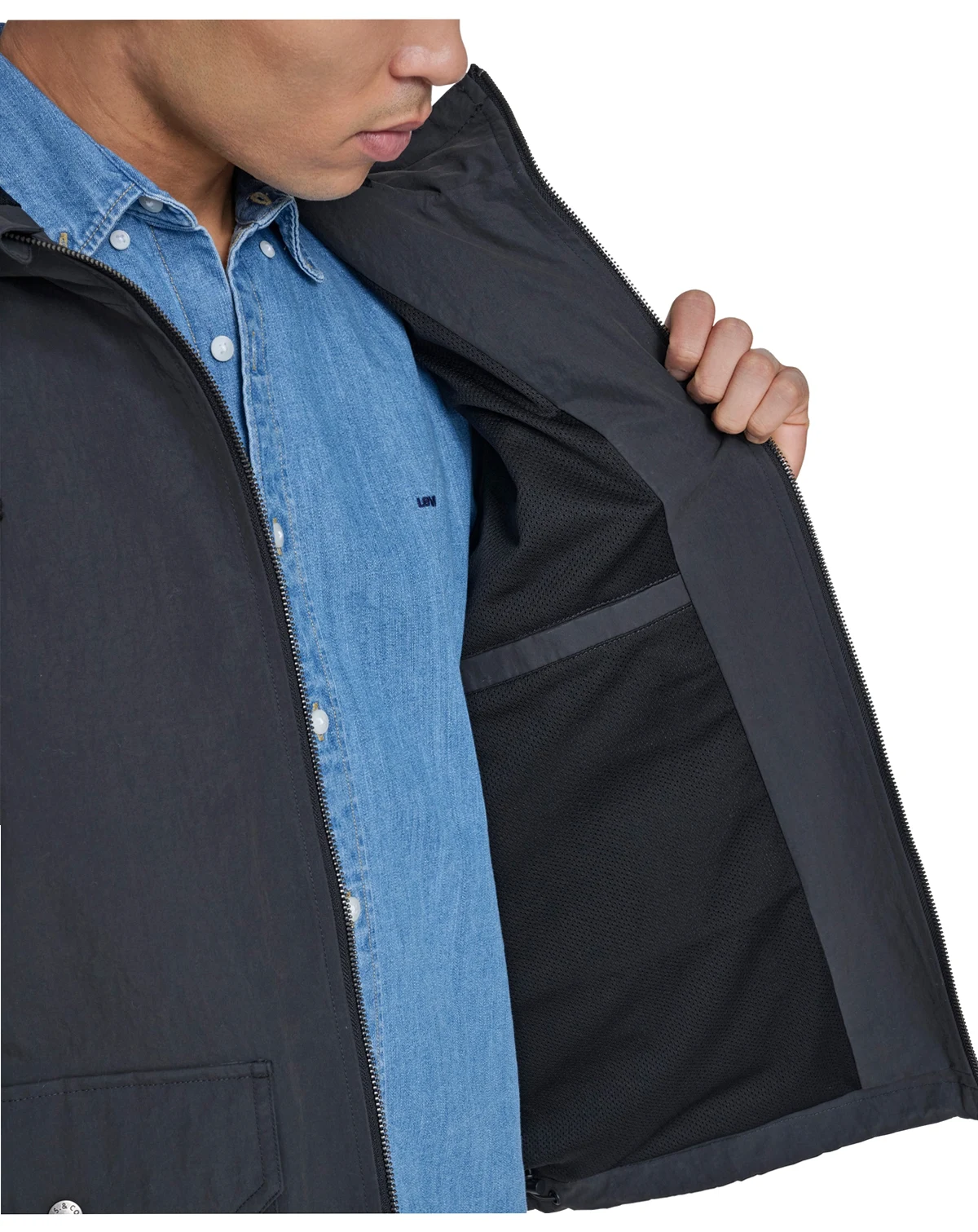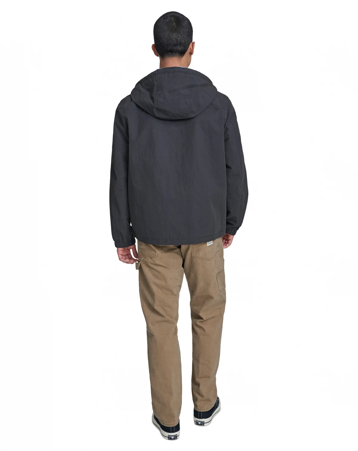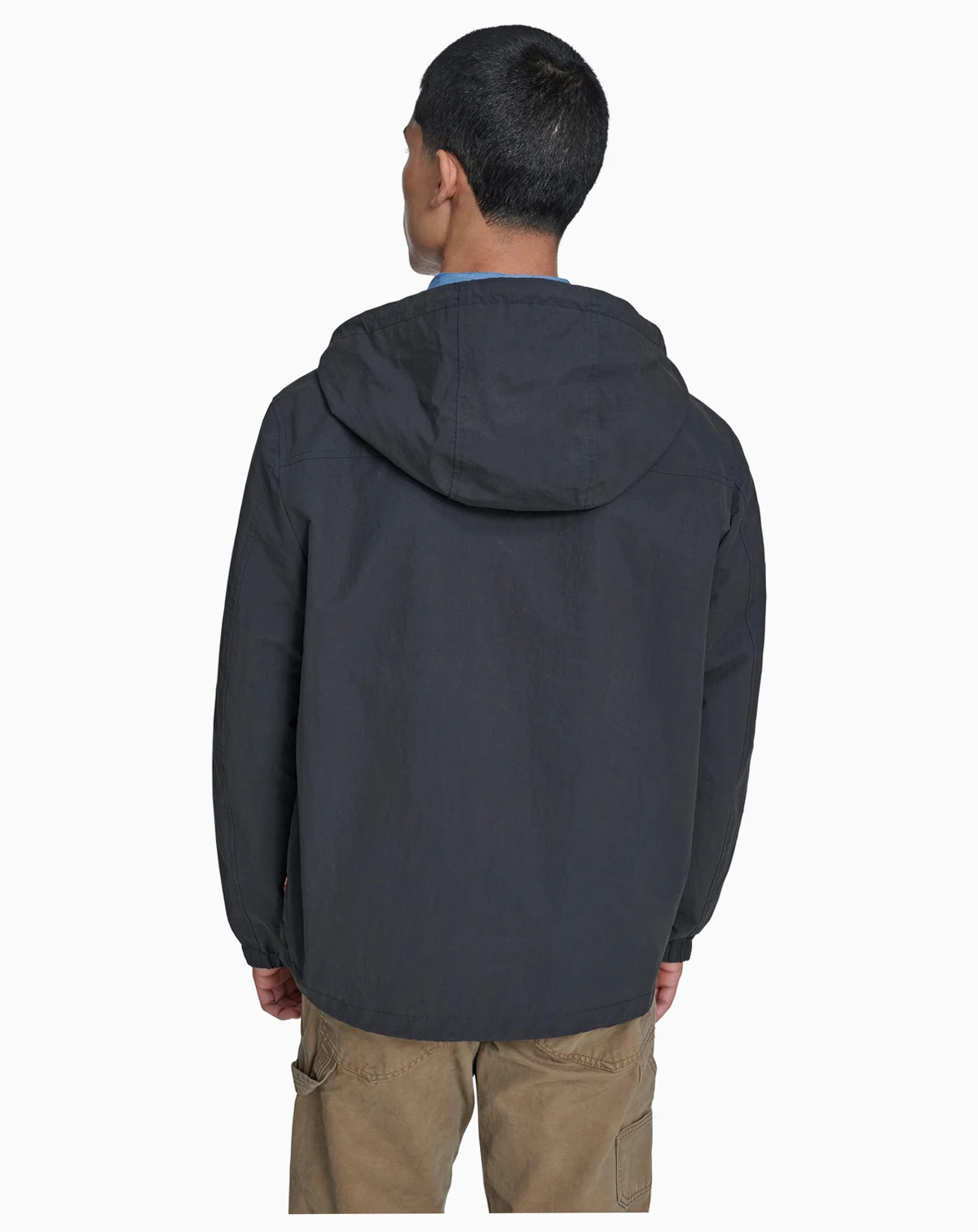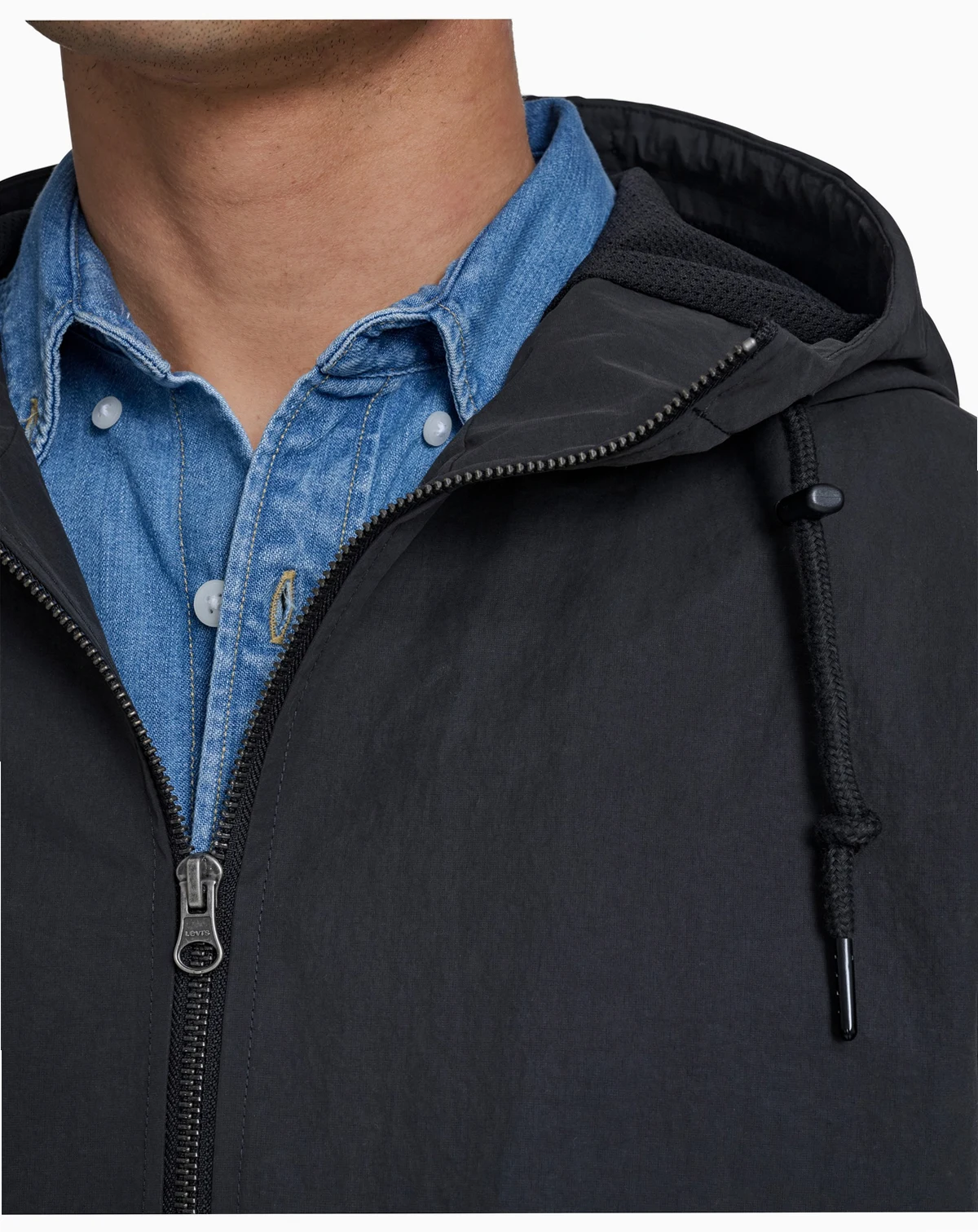 Levi's lightweight jacket with hood, two lower pockets with snap closure, front zipper closure, cinched cuffs, red Levi's tab on lower hem.