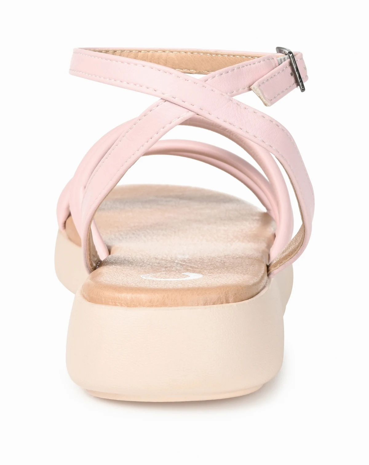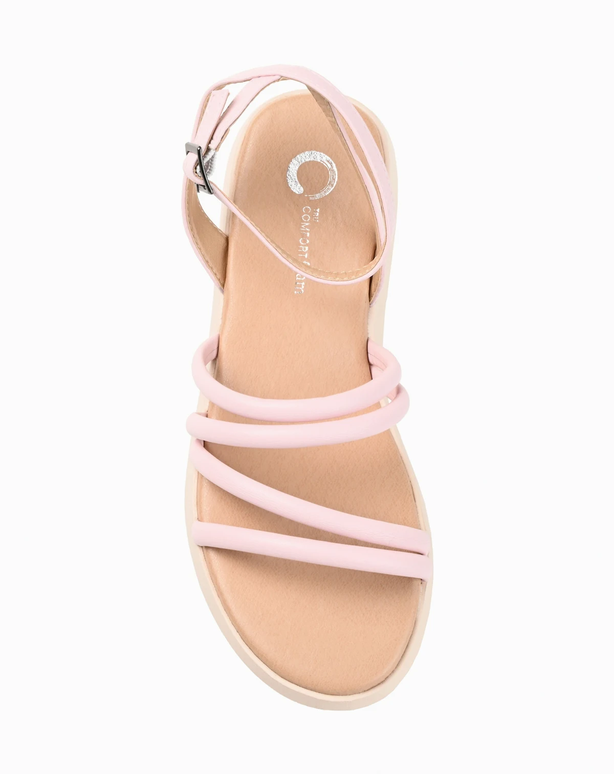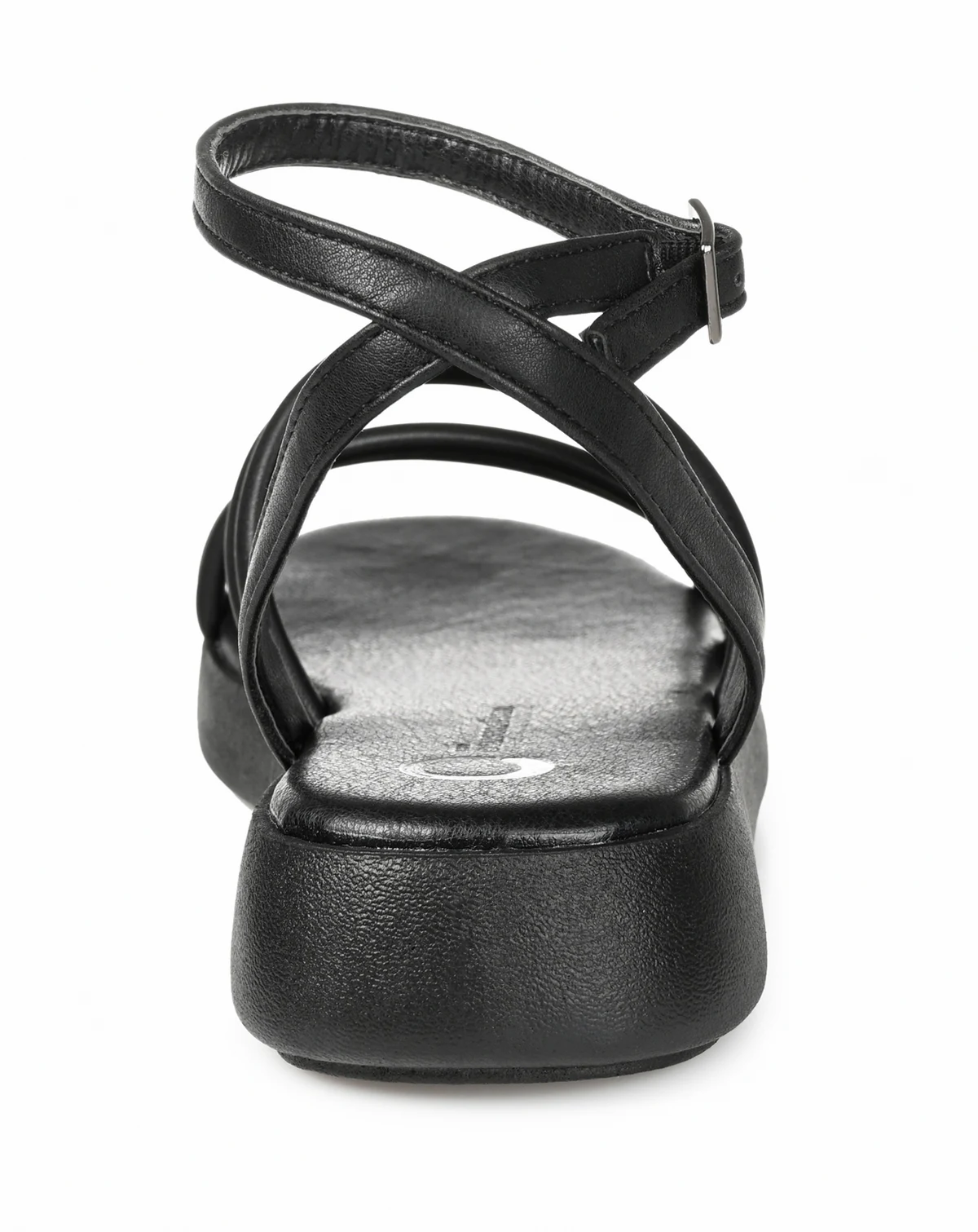 Perfect for those fun days in the sun, the Palomma sandal by Journee Collection. This modern style features a wraparound buckle strap and puffed vegan leather straps at the toe. A thick white sole adds retro charm to the design.