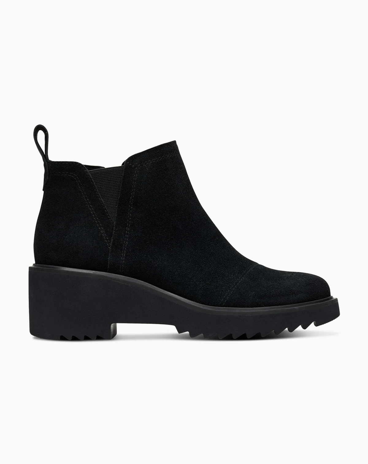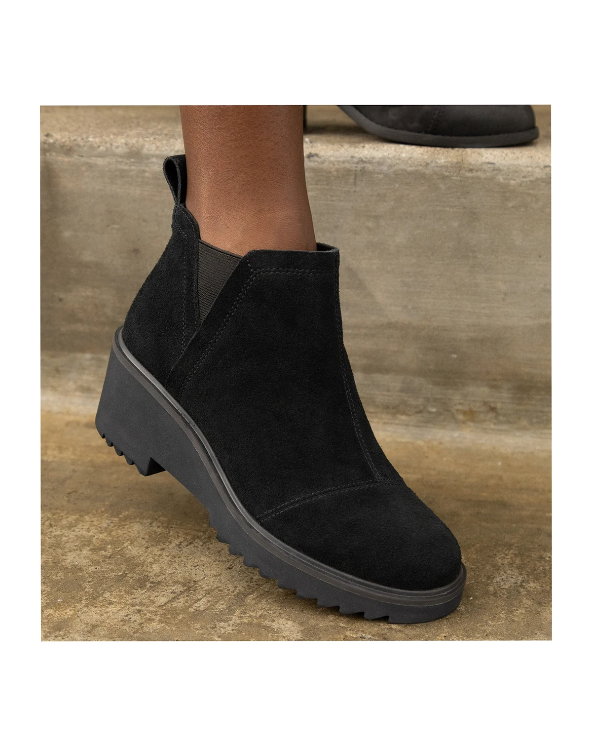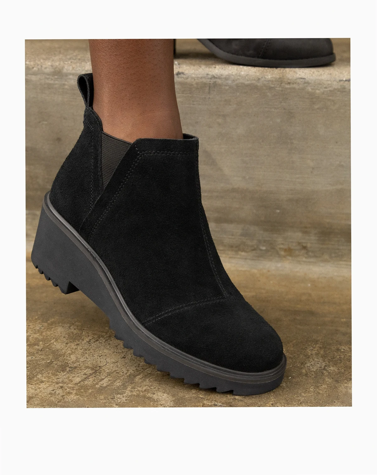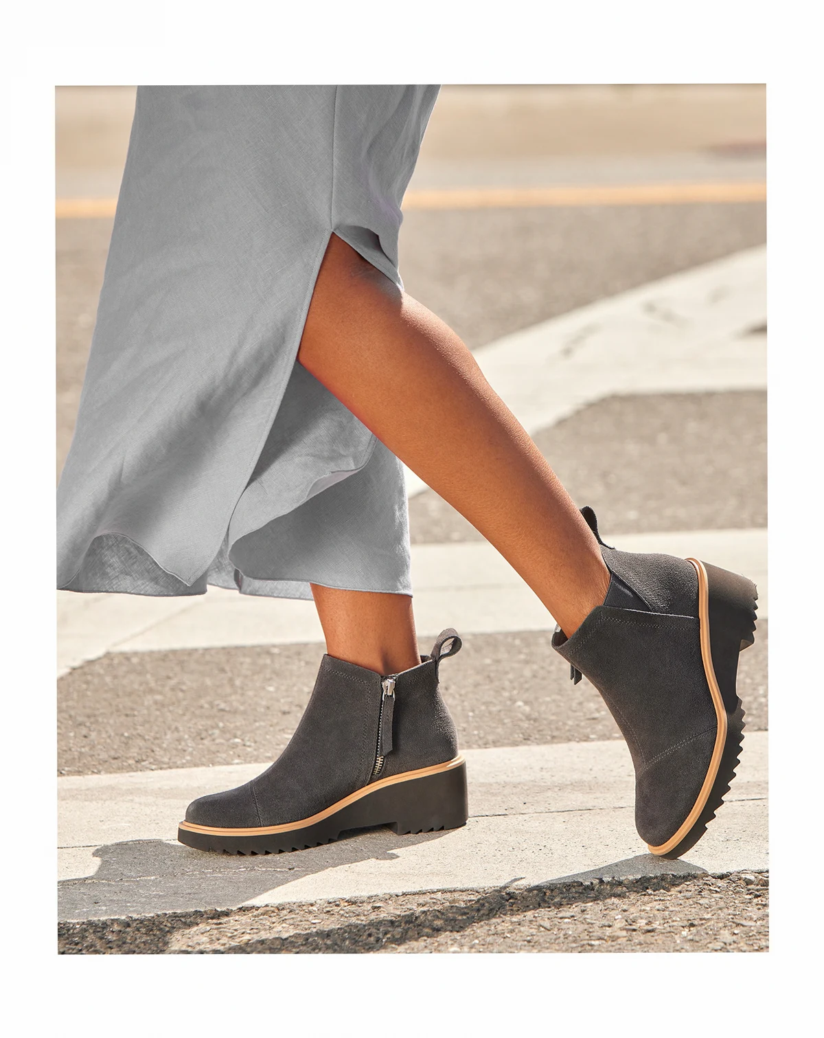 Meet Maude, our newest lightweight mid wedge ankle bootie. Fit features lateral goring for a comfortable fit and medial zippers makes these your new go-to style. This 2-inch EVA wedge was designed with walkability in mind - so go ahead and plan your busiest day around this comfortable bootie. Suede or Twill uppers.