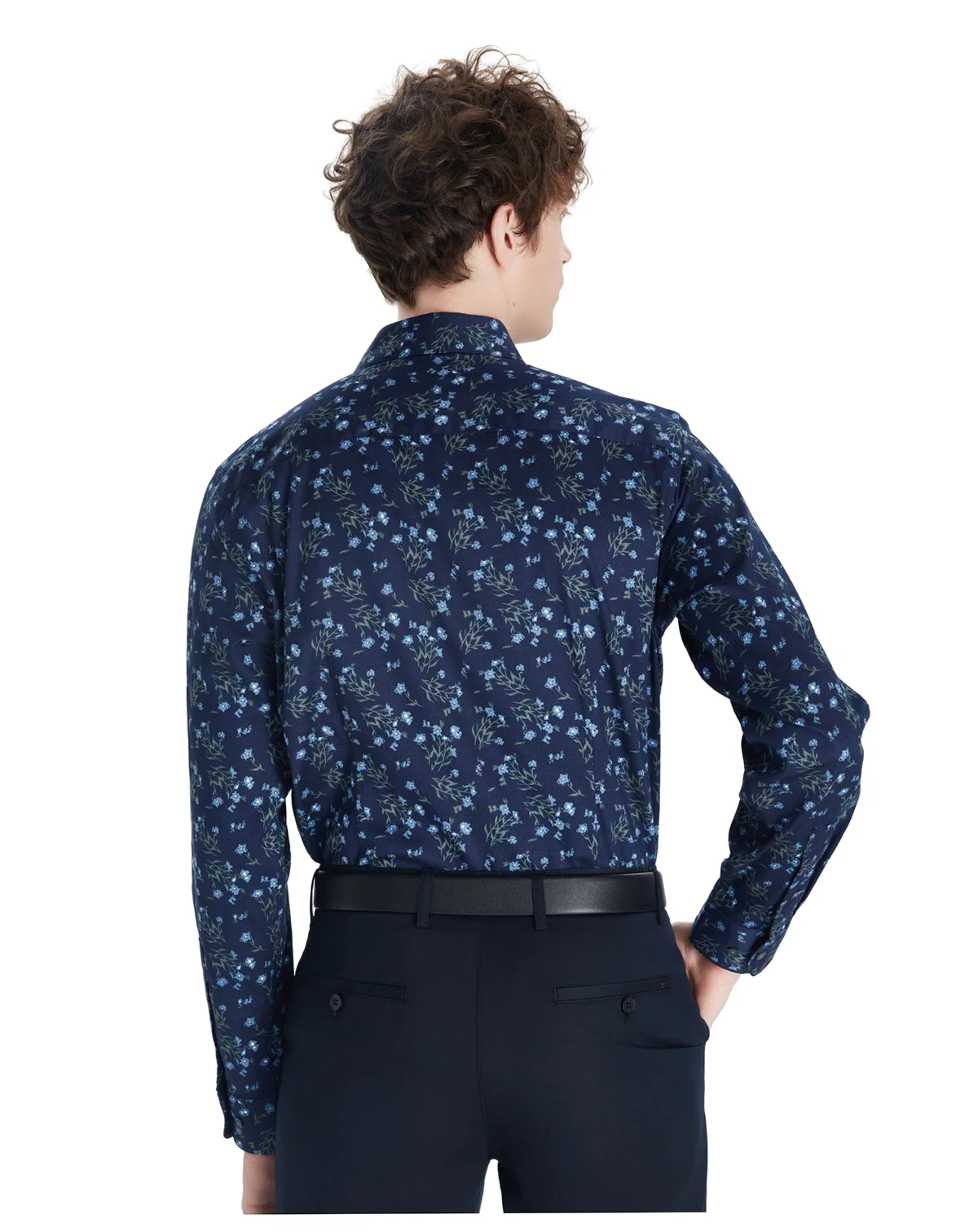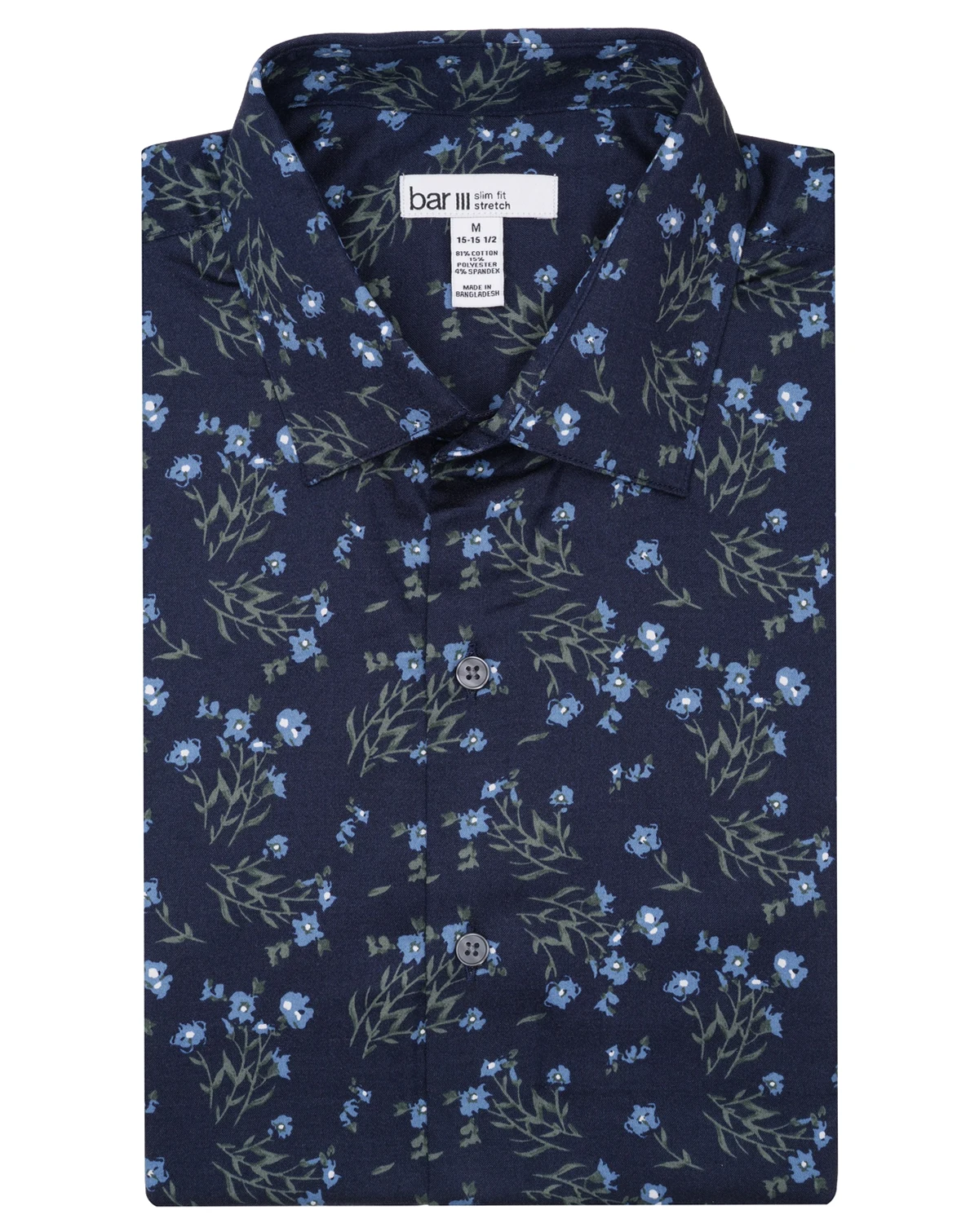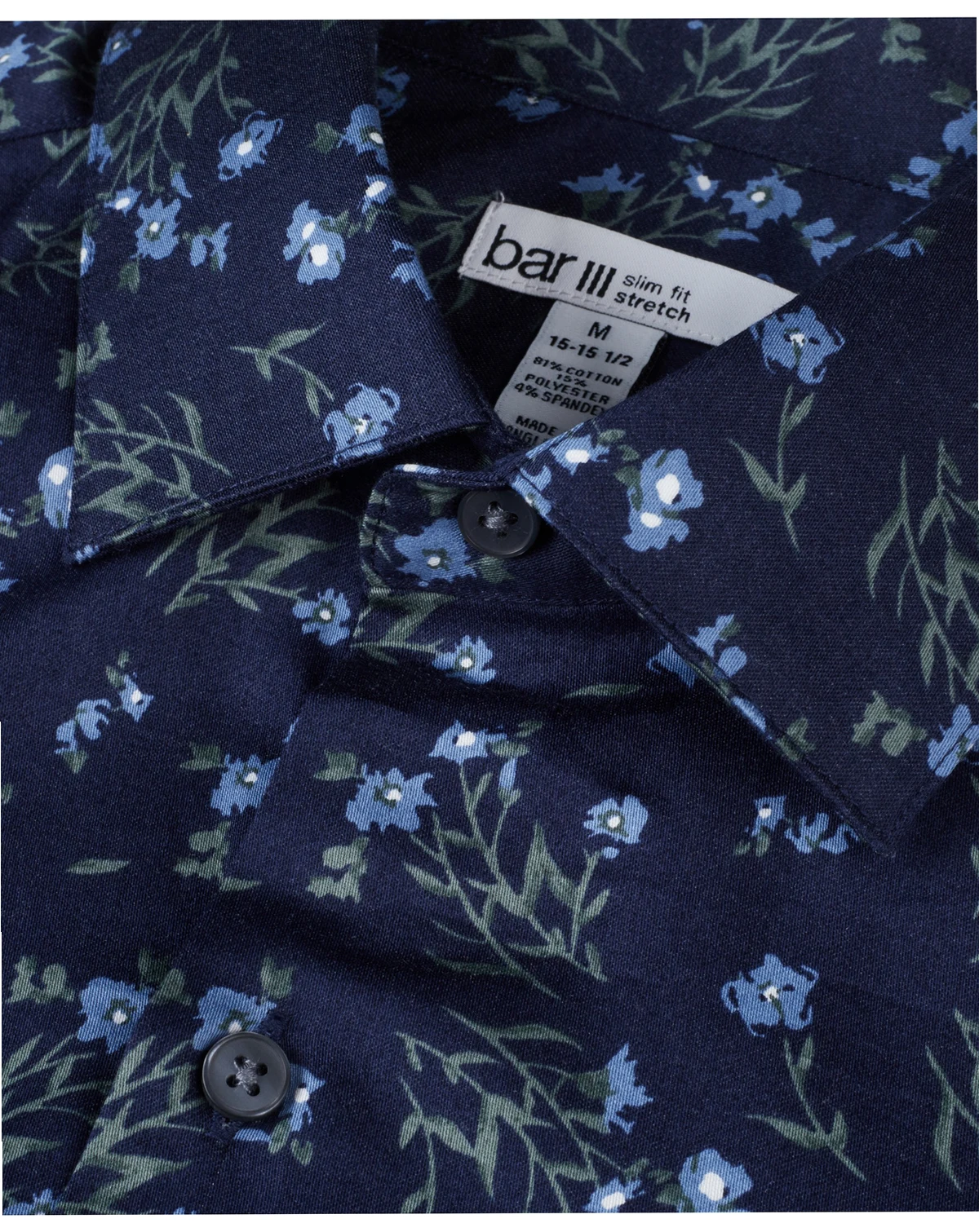Combining style and sophistication, this Bar III dress shirt is tailored in a slim fit for a sleek silhouette. It showcases a charming, tossed bouquet print, complemented by a classic spread collar and rounded cuffs for a polished finish.