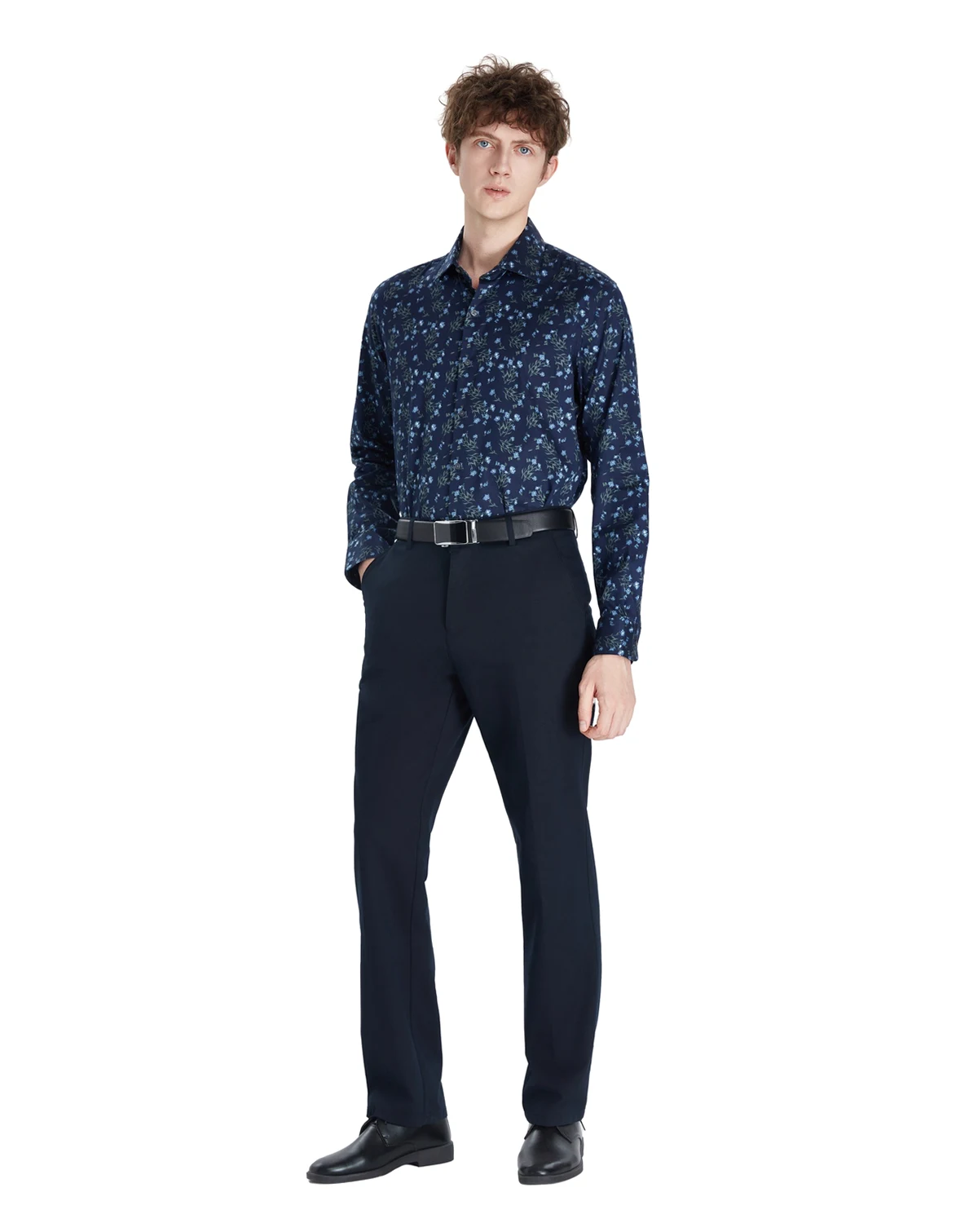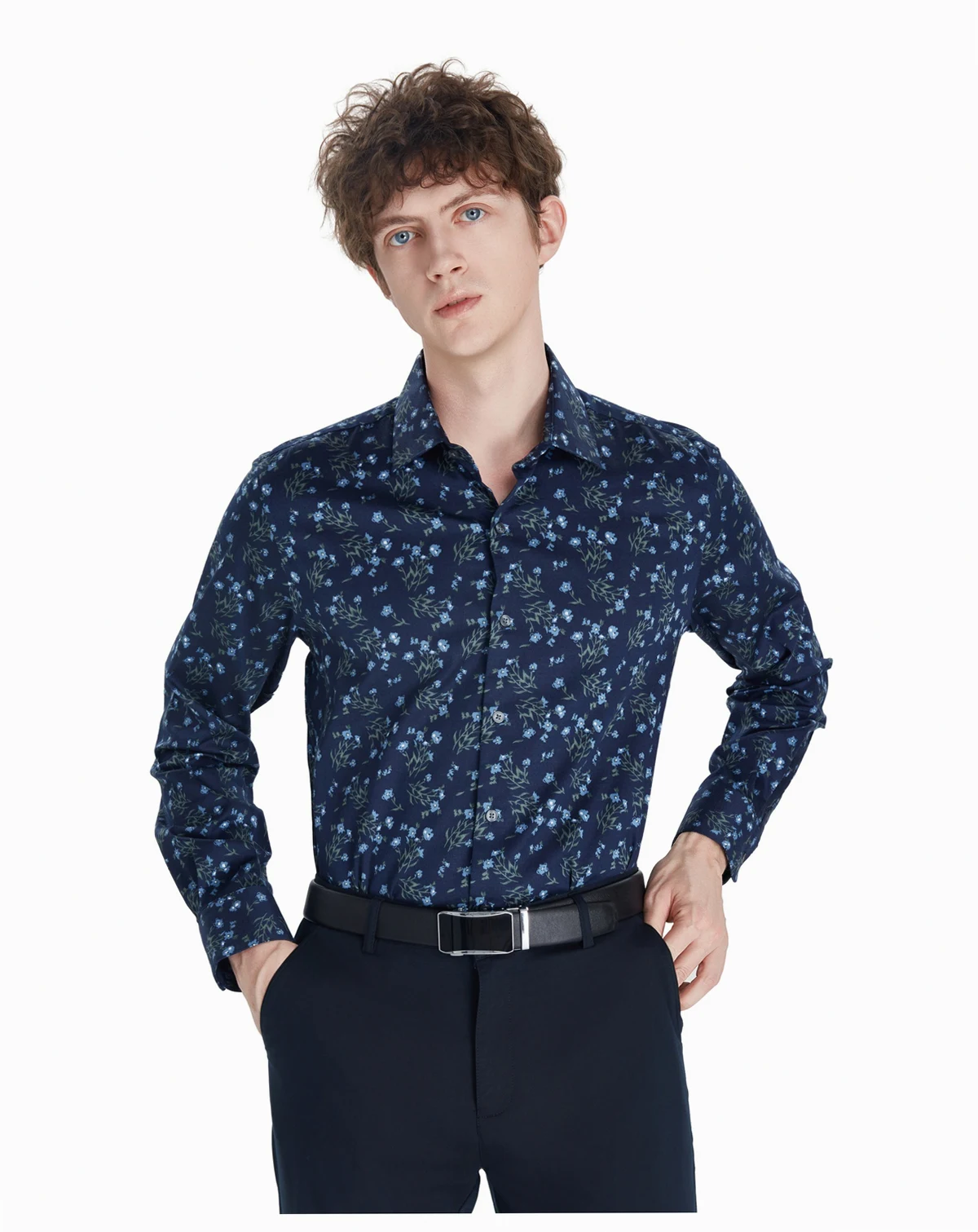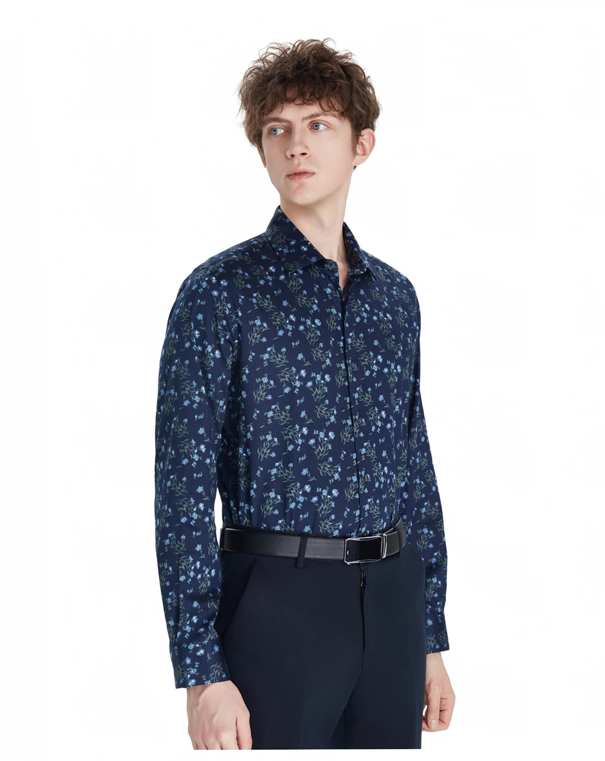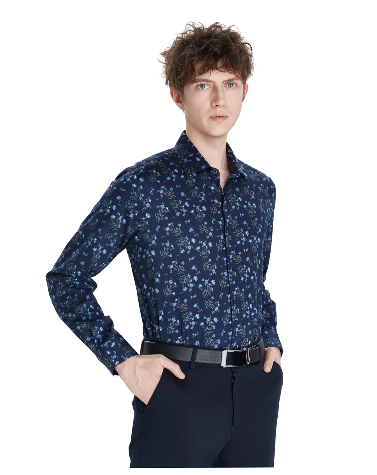 Combining style and sophistication, this Bar III dress shirt is tailored in a slim fit for a sleek silhouette. It showcases a charming, tossed bouquet print, complemented by a classic spread collar and rounded cuffs for a polished finish.