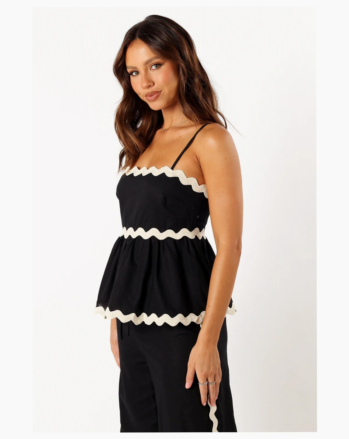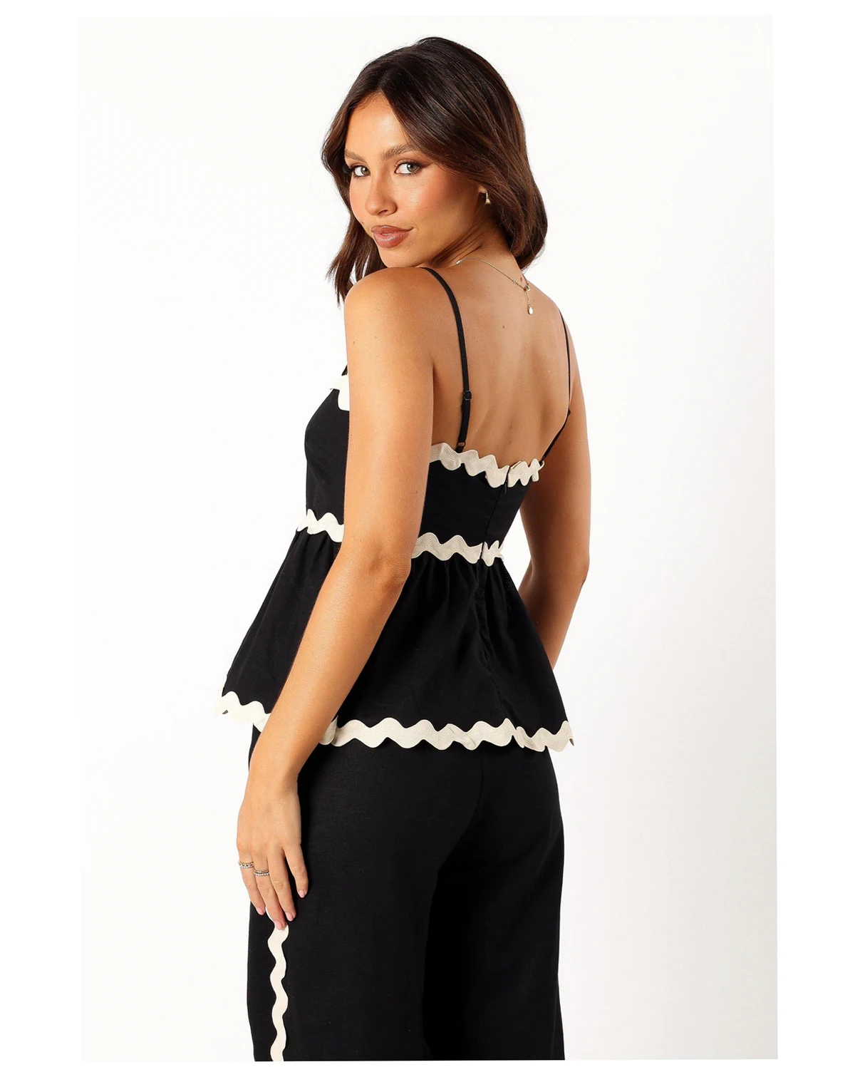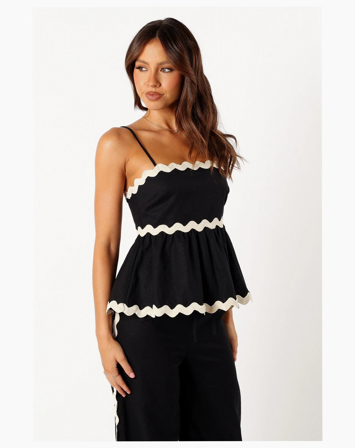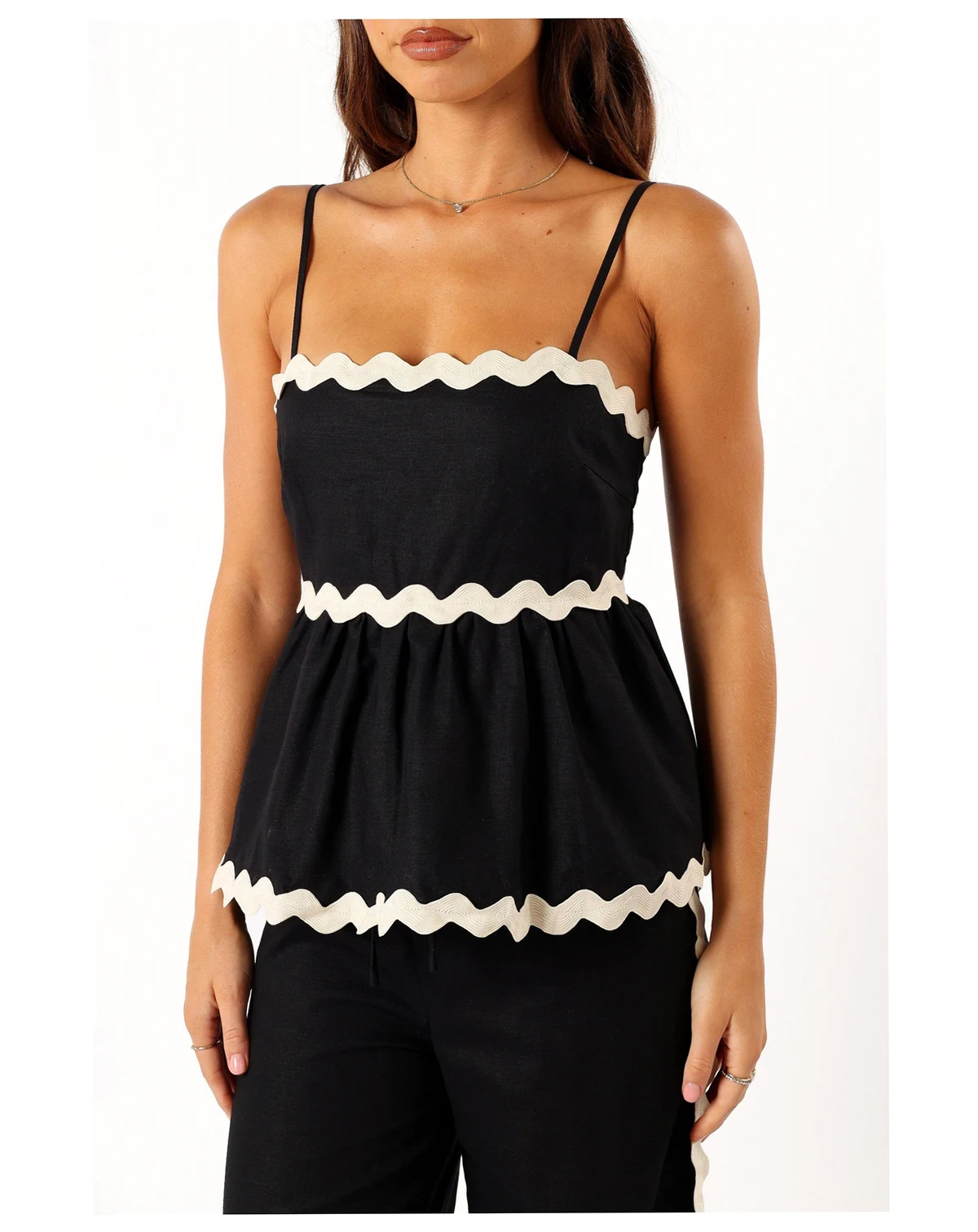 This beautiful top features an eye-catching ric rac design and a flattering scalloped square neckline. The relaxed fit features, thin adjustable straps, and a invisible back zip with hook and clasp, it creates a comfortable yet stylish look that you can easily dress up or down.