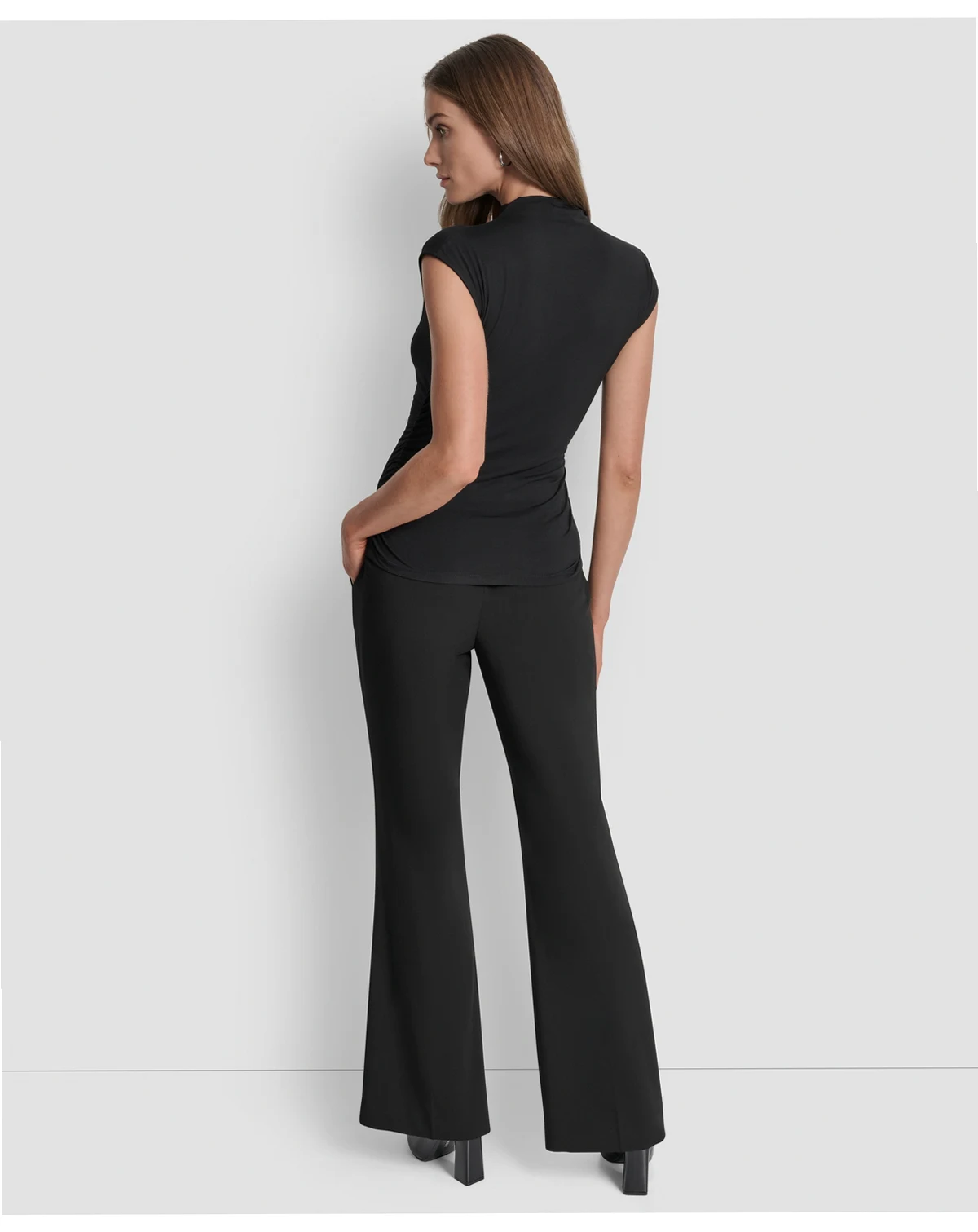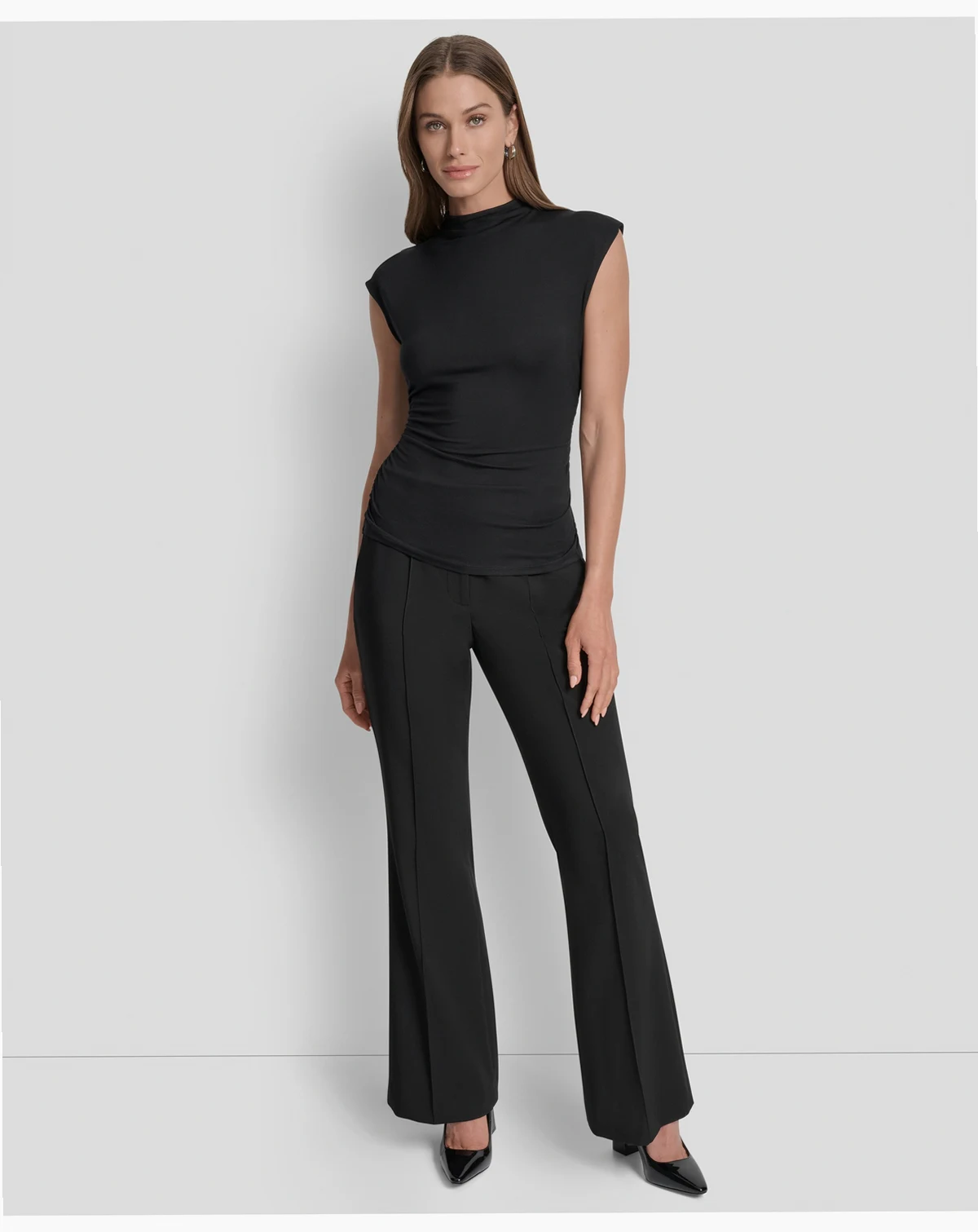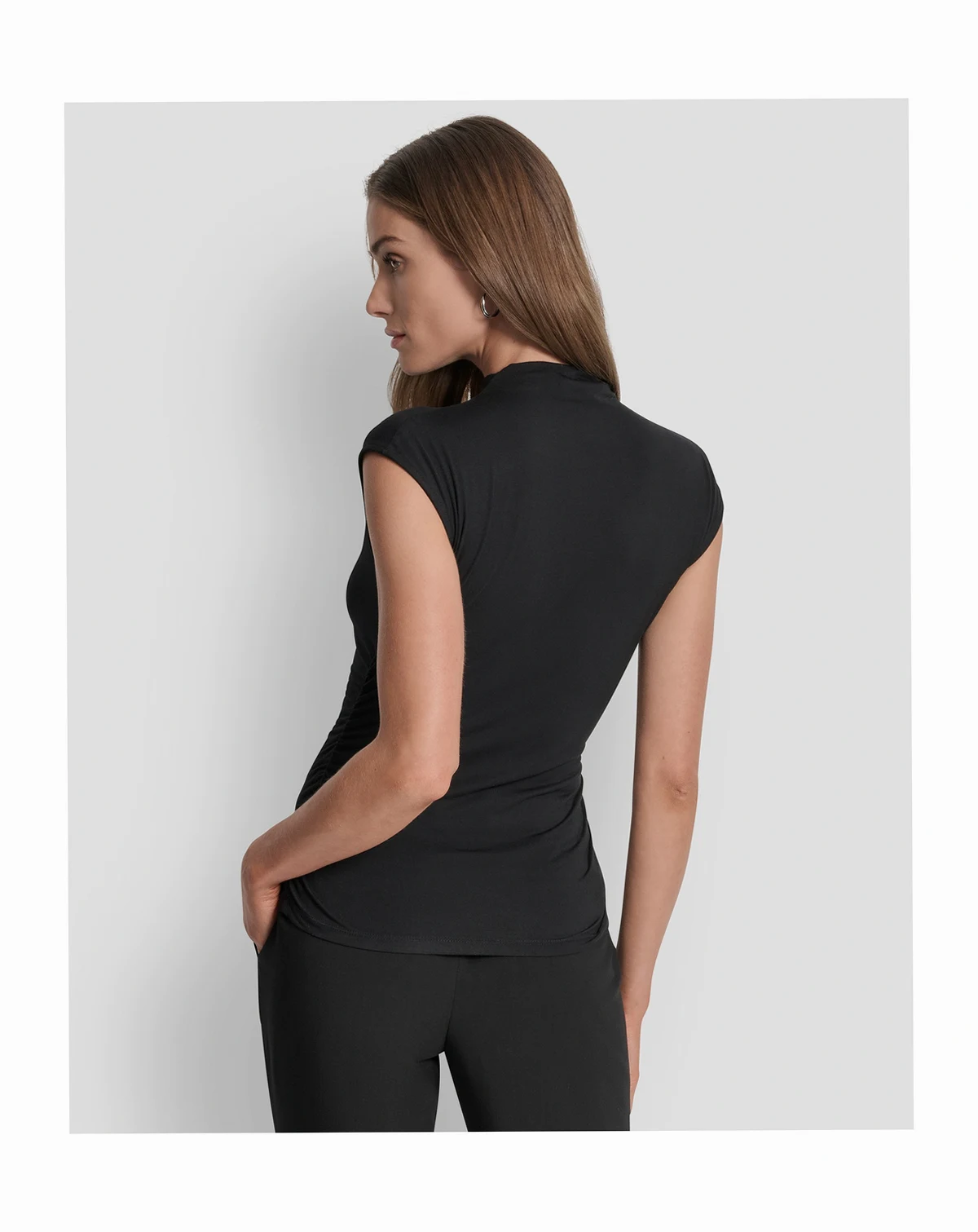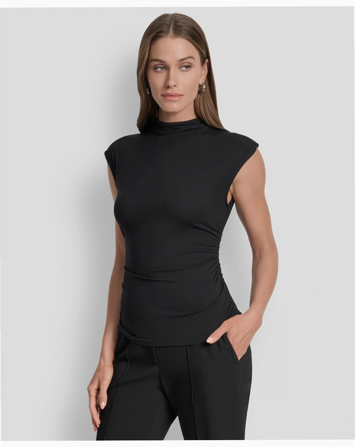 Effortlessly chic, this DKNY women's mock neck sleeveless side-ruched knit top is your year-round layering essential. The sleek silhouette pairs perfectly with trousers for the office, denim for weekend brunch, or a pencil skirt for date night. Its soft knit fabric ensures all-day comfort, while the mock neck adds modern polish. Dress it up with statement earrings or keep it casual under a blazer.