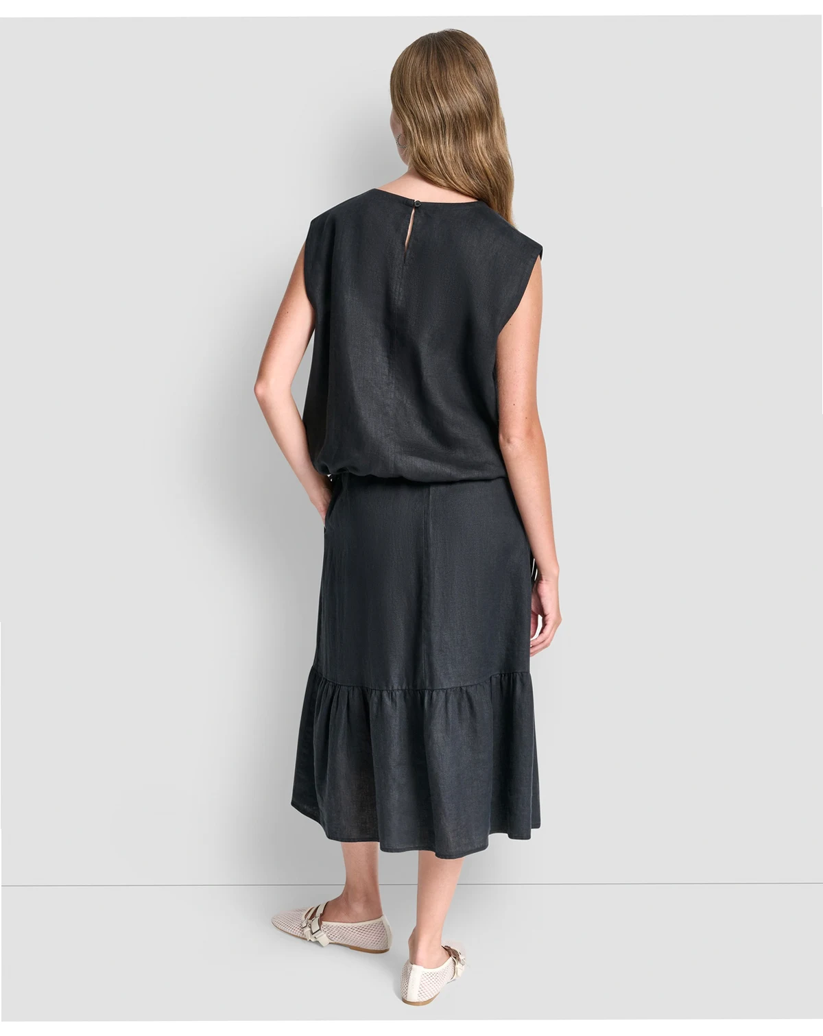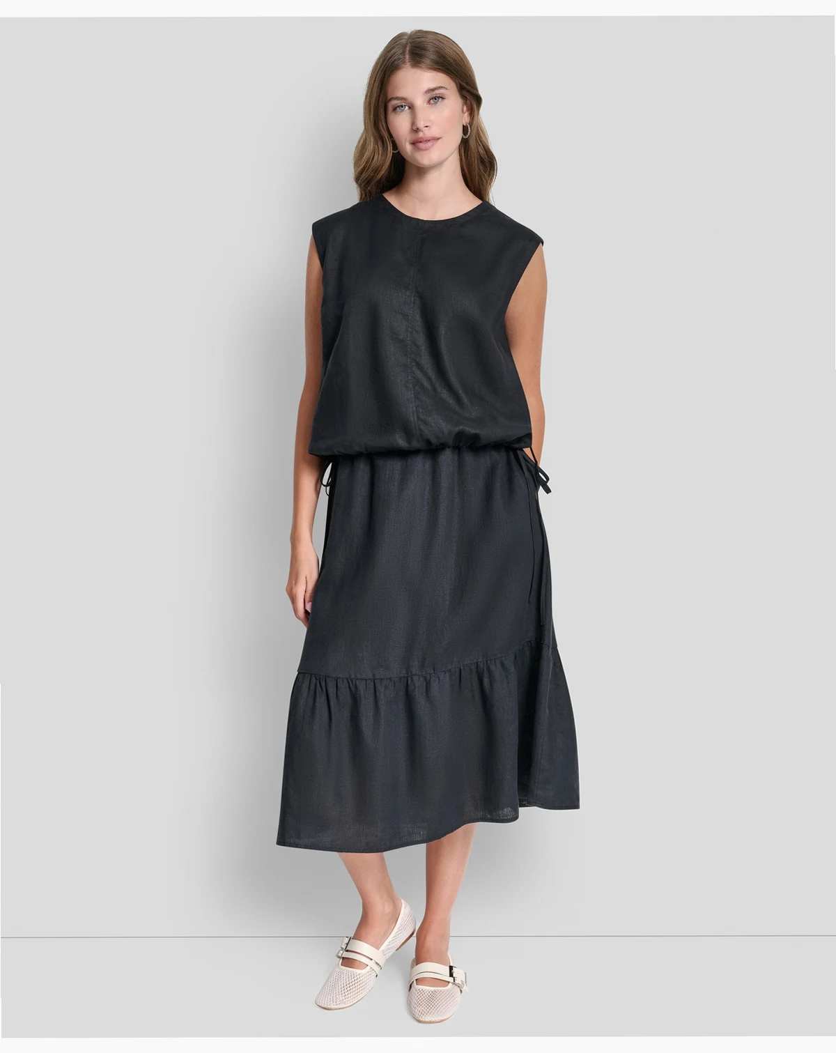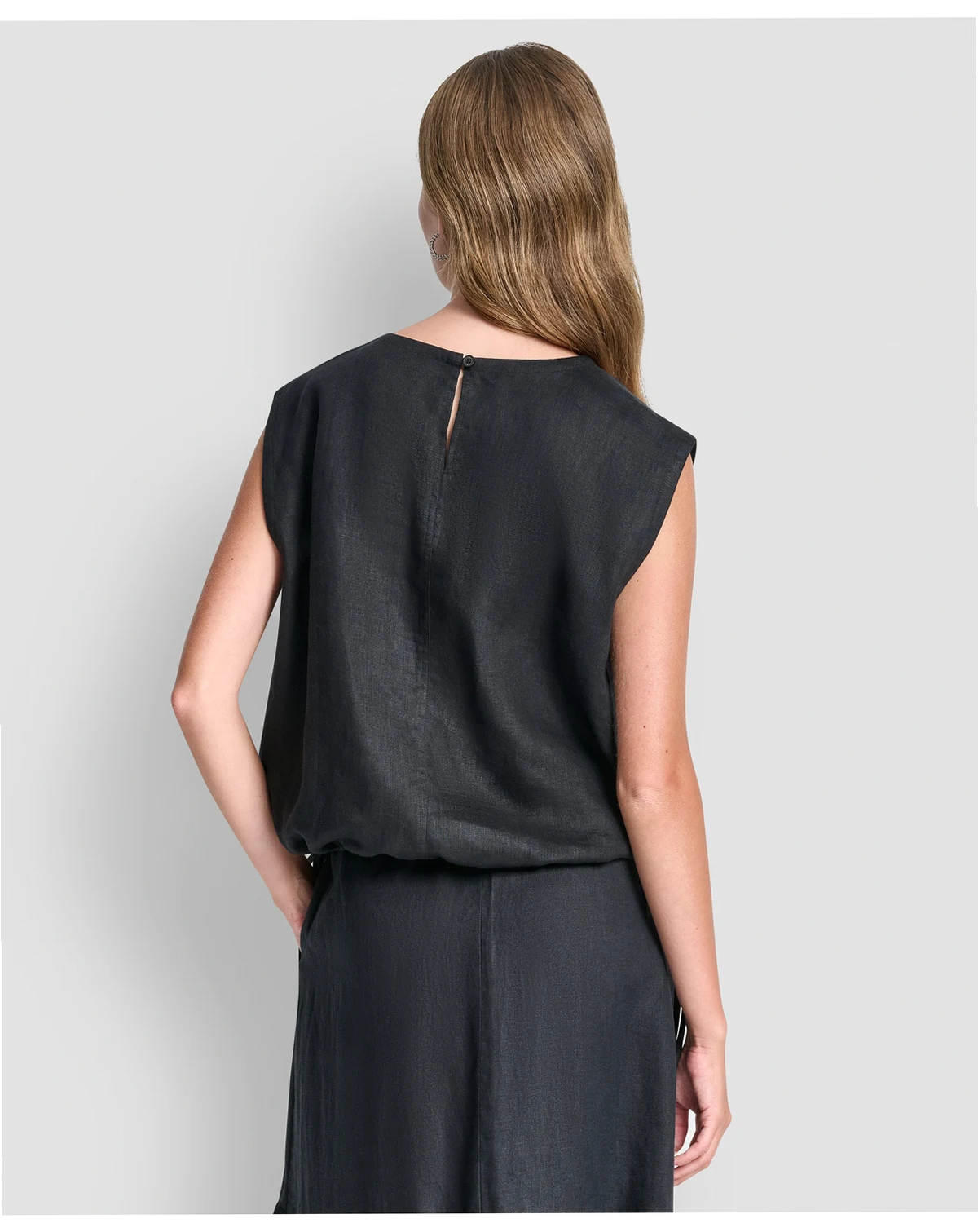 Bring versatility to casual days with this DKNY sleeveless linen top, designed with a drawstring hem for a custom fit. A scoop neckline adds easy charm, while a back keyhole detail finishes the piece with refinement.