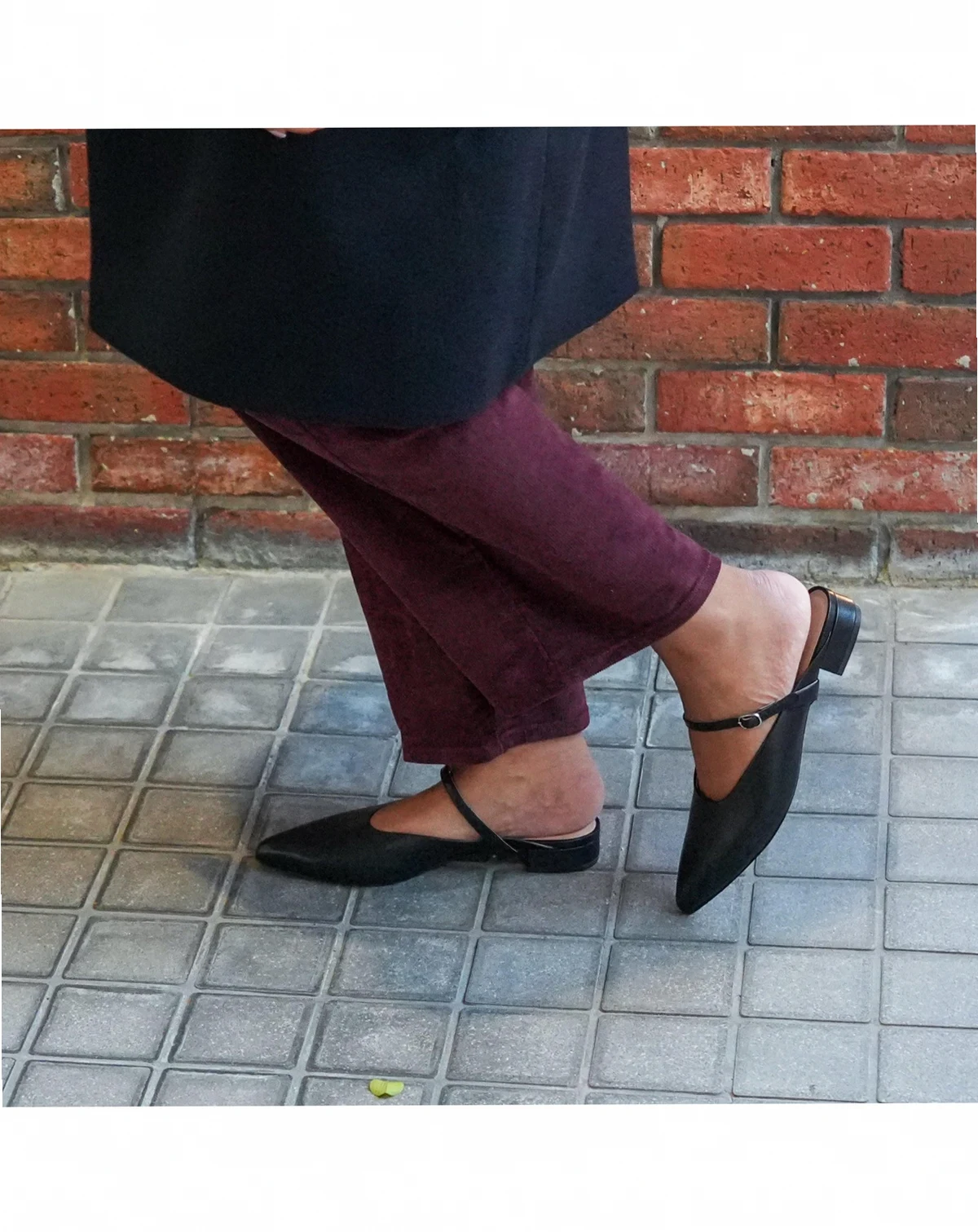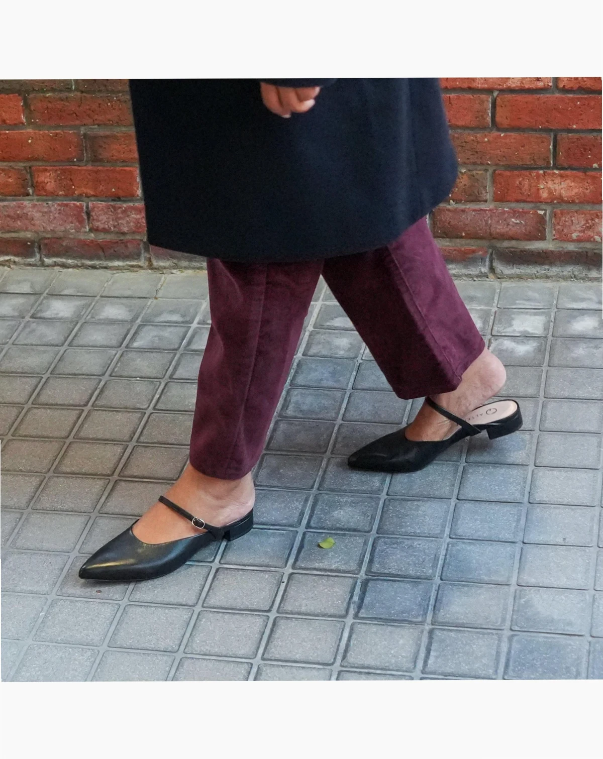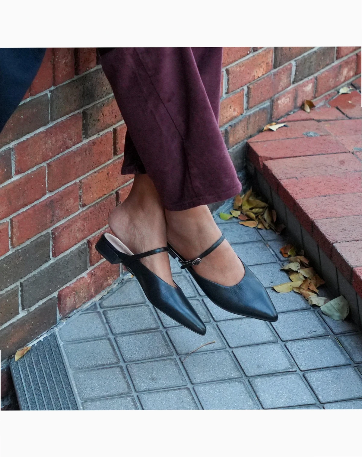 Versatile black leather slides perfect for work, travel, and everything in between. Designed for lasting comfort, they fit snug at first but soften over time to accommodate your foot. If you re between sizes, we recommend sizing up for the best fit. Wear them solo for a sleek look or style with the Twiggy Strap for extra support. Each pair is customizable, just swap the detachable strap with any other Alterre strap, sold separately.