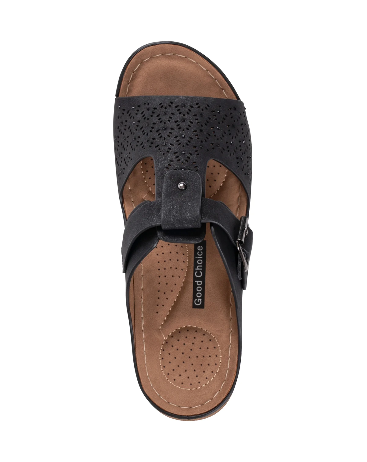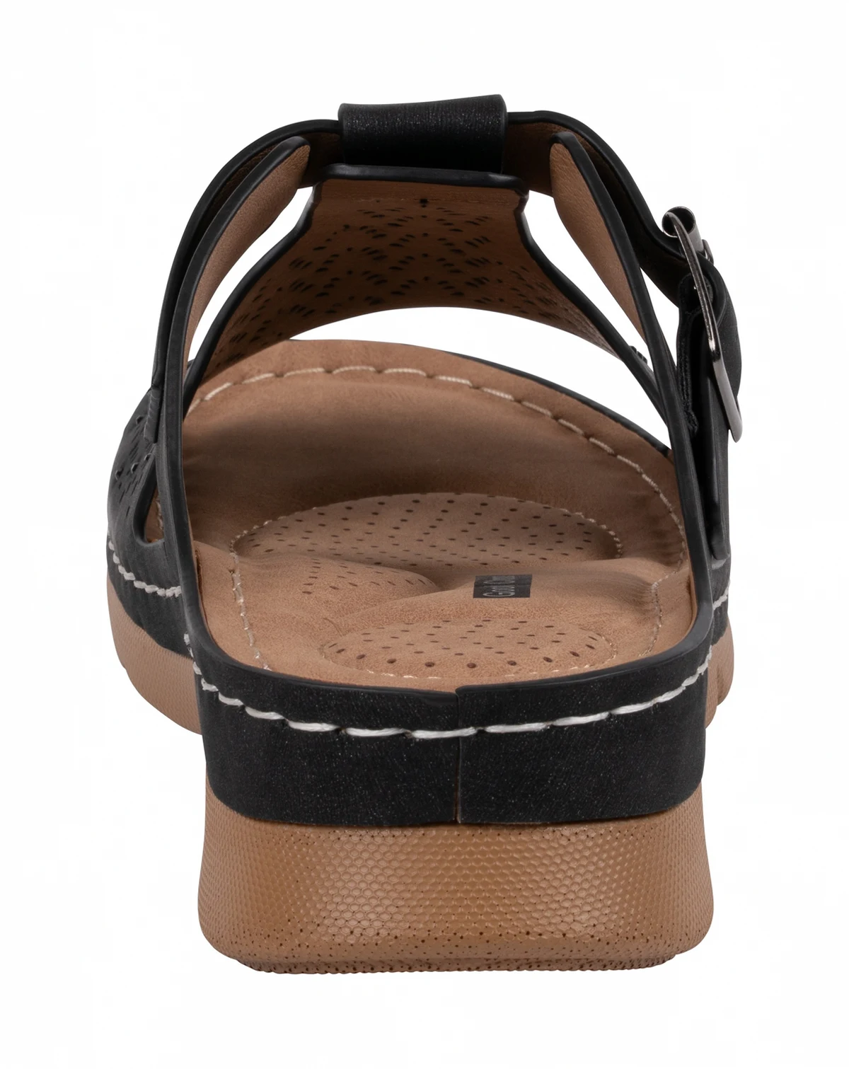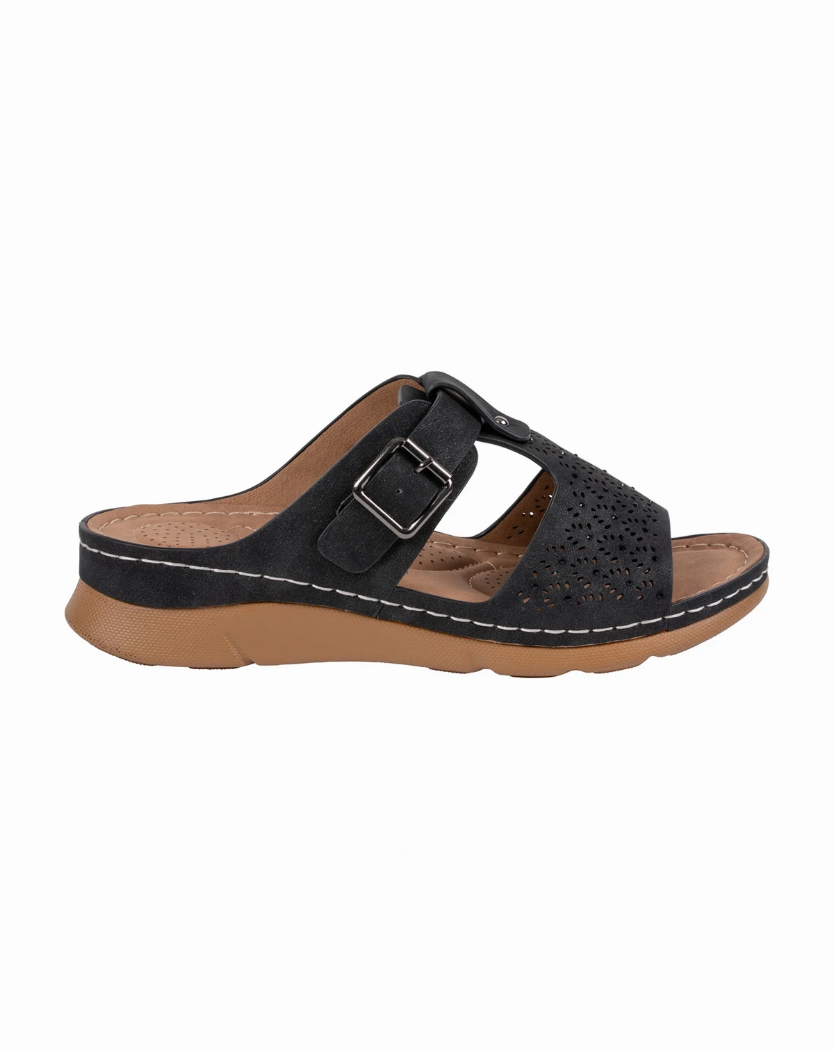 The Loni slide sandal offers a perfect mix of comfort and modern style. Featuring a perforated upper with delicate laser-cut detailing and an adjustable buckle strap, it provides both breathability and a personalized fit. The cushioned footbed ensures all-day comfort, while the lightweight platform sole adds effortless height and support for everyday wear.