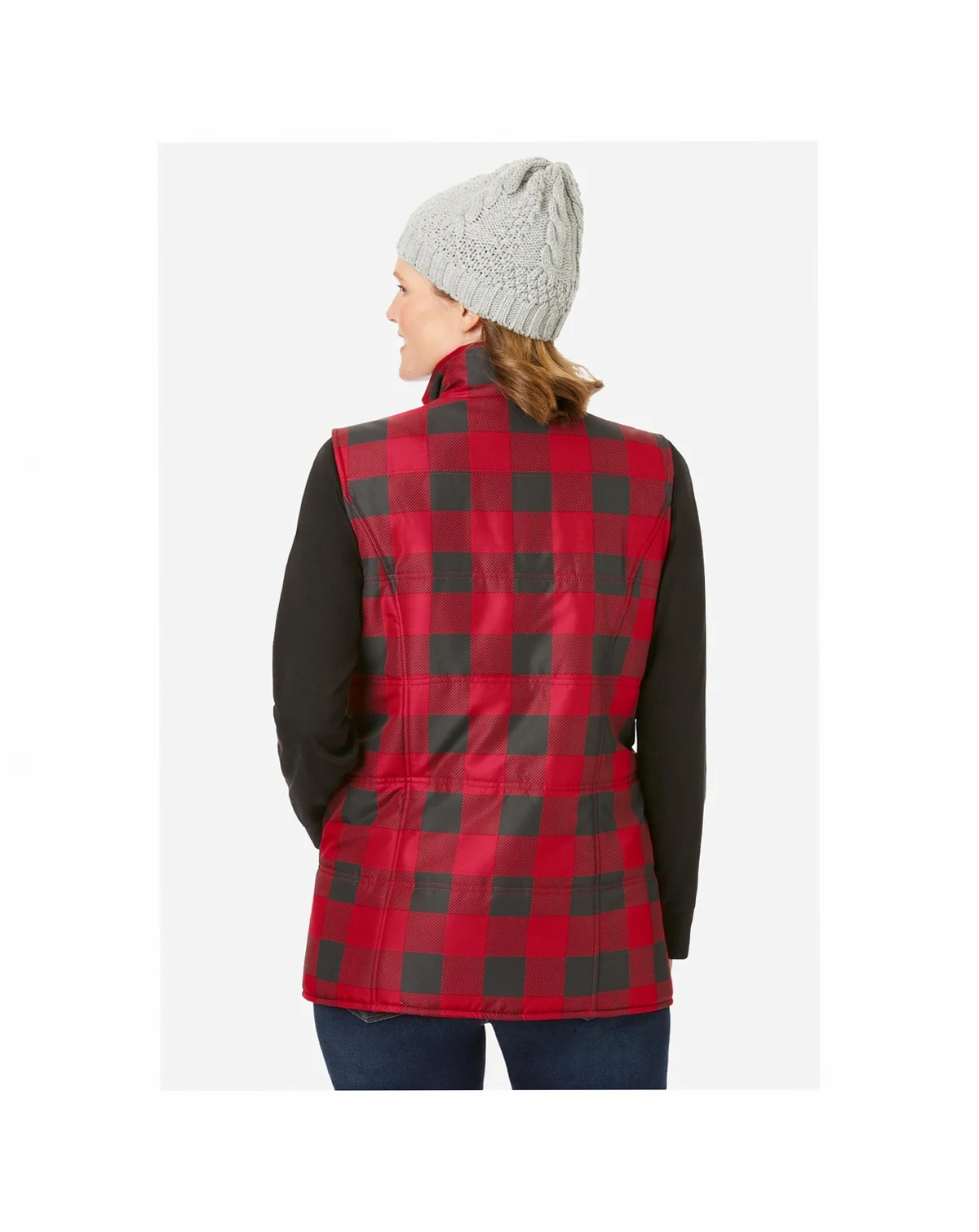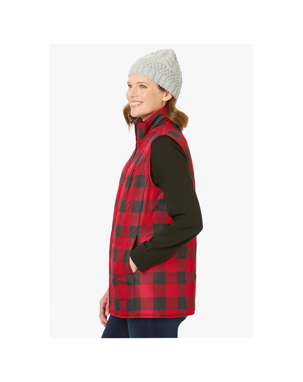 This quilted vest will have you in love with layering. A stand collar and zip front keeps you nice and cozy while princess seams create a flattering shape that is still relaxed. Throw this on over your classic tees for an extra touch of warmth. Front seam pockets28” length. Poly, imported. Machine washable