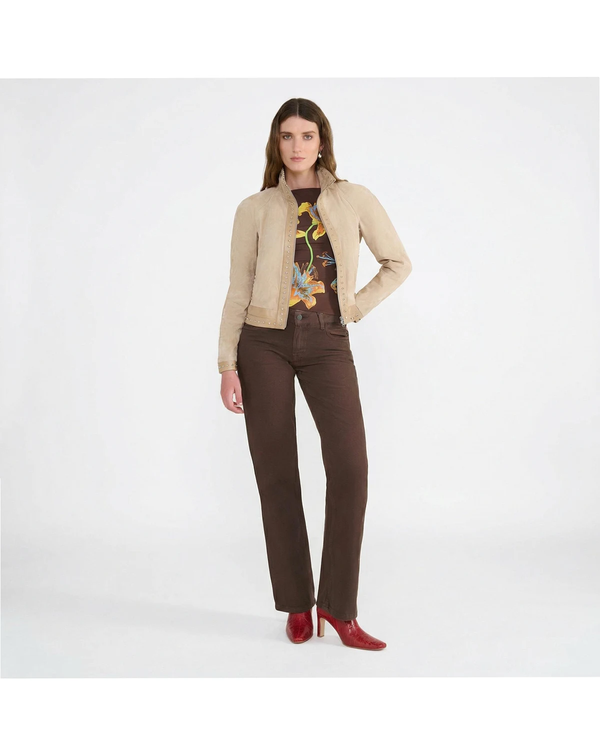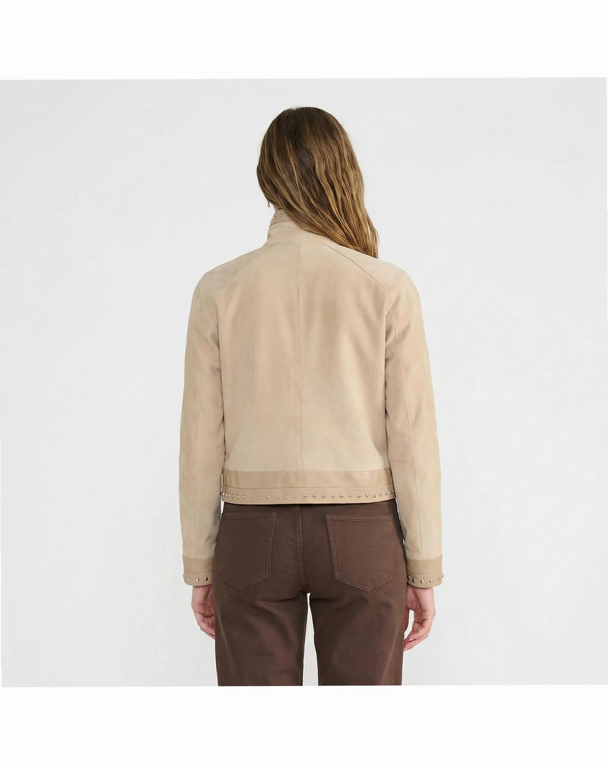 Refined with a modern edge, the Suede Studded Jacket in Beige is a standout women s suede jacket designed for effortless spring styling. Crafted from 100% British premium suede, this lightweight suede jacket blends softness with subtle statement details. Minimal yet elevated, this beige suede jacket features delicate stud embellishments along the front placket, hem, and sleeves for a polished, contemporary finish. The streamlined silhouette and front zip closure create a flattering shape that pairs seamlessly with denim, tailored pants, or dresses. Perfect as a transitional suede jacket for spring and summer, delivers versatile luxury with understated attitude.